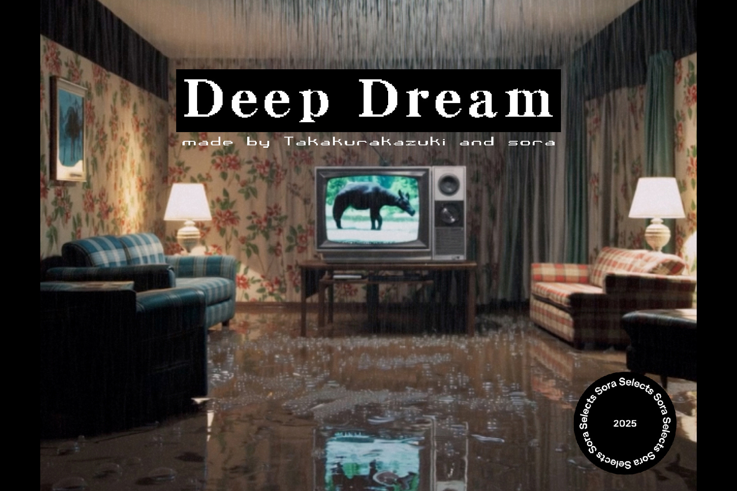 『Deep Dream』は、たかくらかずきが 2025年の OpenAI Sora アーティストフェローに選出されたことを受けて制作した、全編にわたり Sora を用いて制作された映像作品である。AIが人類の映画や映像表現を学習し出力するプロセスと、人間の脳内で起こる学習と夢の関係性を重ね合わせ、さまざまな映画表現へのオマージュを通して構成されている。本作は、AIによる生成表現を一貫してシュルレアリスムの文脈と接続して捉える、たかくらの姿勢を示す作品のひとつでもある。完成した作品は、OpenAI Sora の公式イベント「Sora Select TOKYO」にて、渋谷・シネクイントの劇場スクリーンで限定公開された。