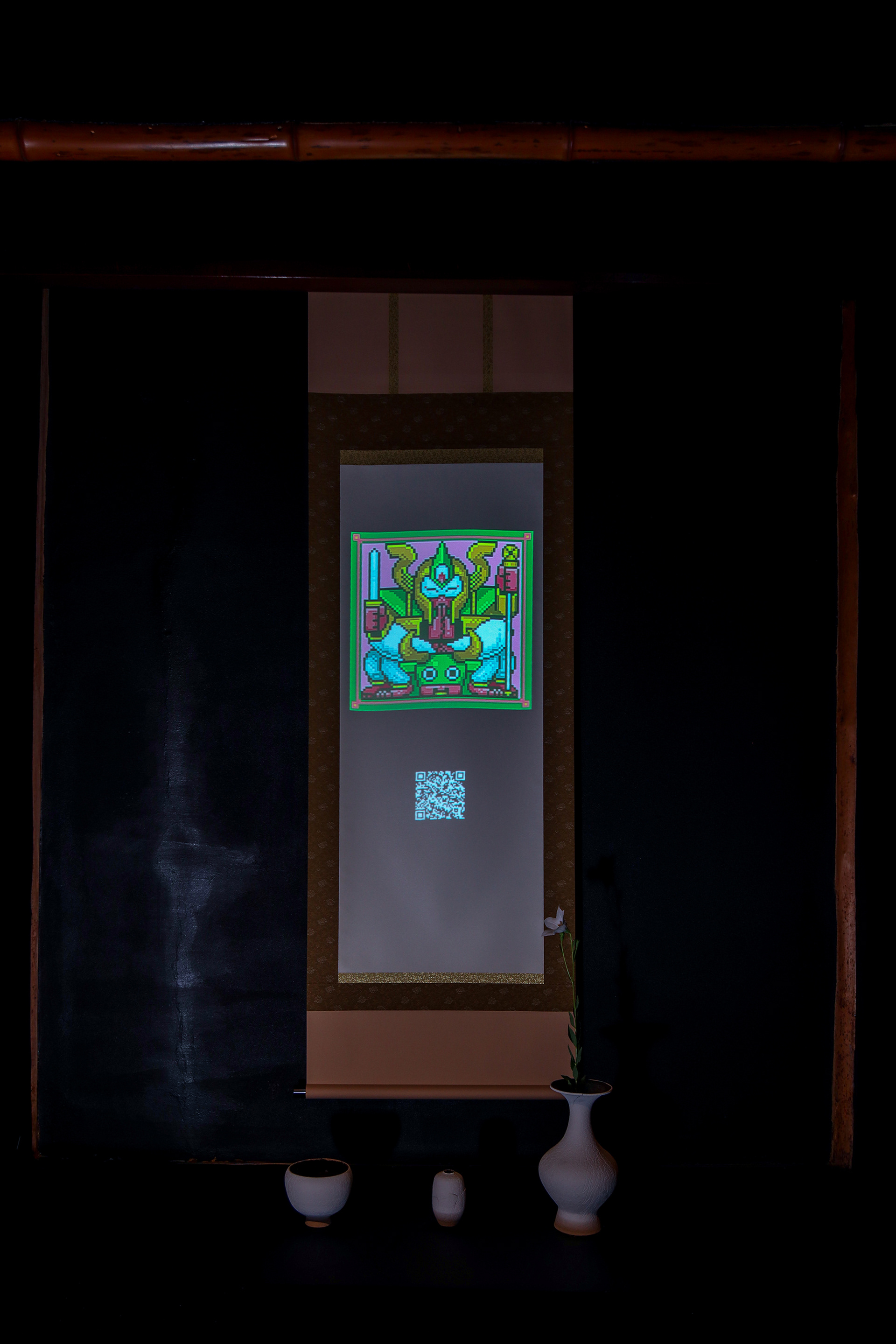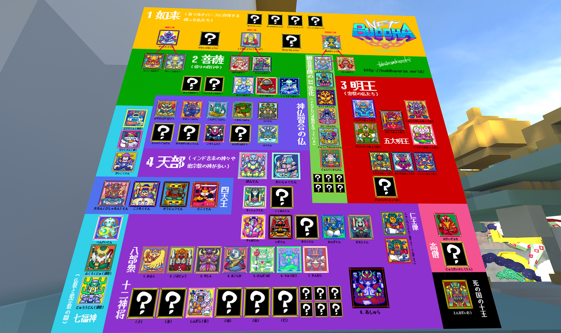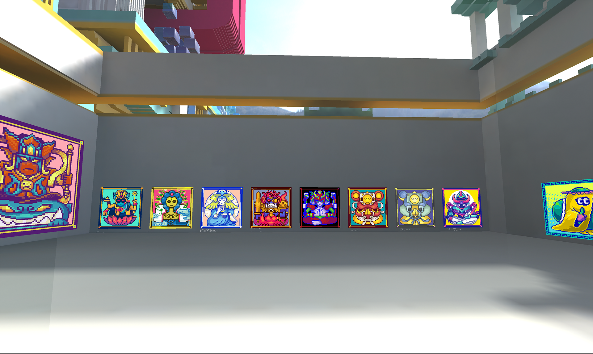 Each character retains elements such as the original Buddha it derives from and its mudra, while dramatically transforming visual aspects such as form and color to create contemporary interpretations of Buddhist figures. The initial character designs were preserved on the blockchain and became the foundation for later production. From these characters, the BUDDHA VERSE series expanded into multiple formats, including canvas works, hanging scrolls, and virtual exhibitions.