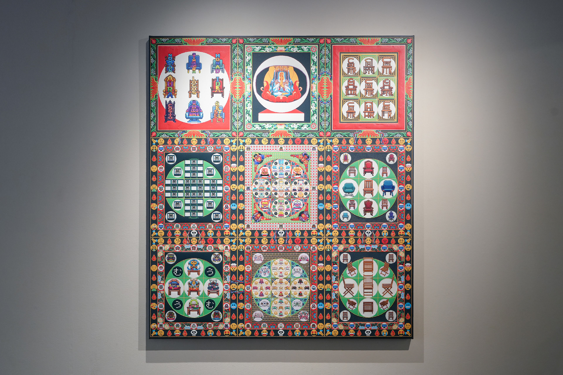 《椅子曼荼羅》は、金剛界曼荼羅の形式に椅子の図像と言葉を配した作品である。仏たちは椅子に座り、仏を表す道具である三摩耶(金剛杵)はヴィデオゲームのコントローラーに置き換えられている。ジョセフ・コスース《One and Three Chairs》は、物体・写真・定義という三つの表象に解体できるという前提があるが、本作はそれを書き換える。多様な椅子の像、言葉の配置、椅子に座る様々な意味など、椅子は三つでは終わらず、曼荼羅の形式にしたがって無数に展開していく。ひとつの椅子がいくつもの椅子として並び、どれかが正解であるという関係をもたない。胎蔵界曼荼羅を用いた《伽羅選曼荼羅》と対をなす。