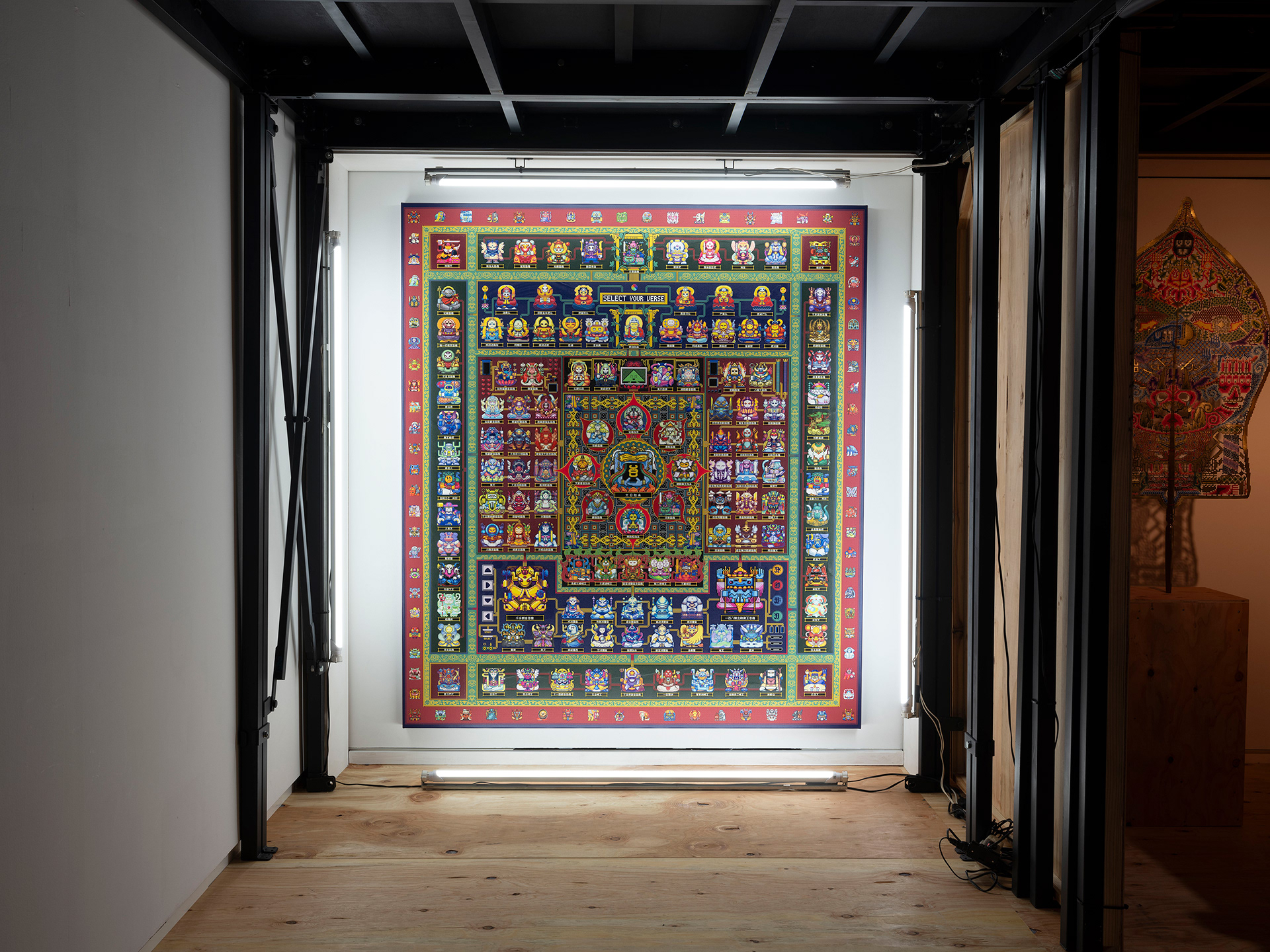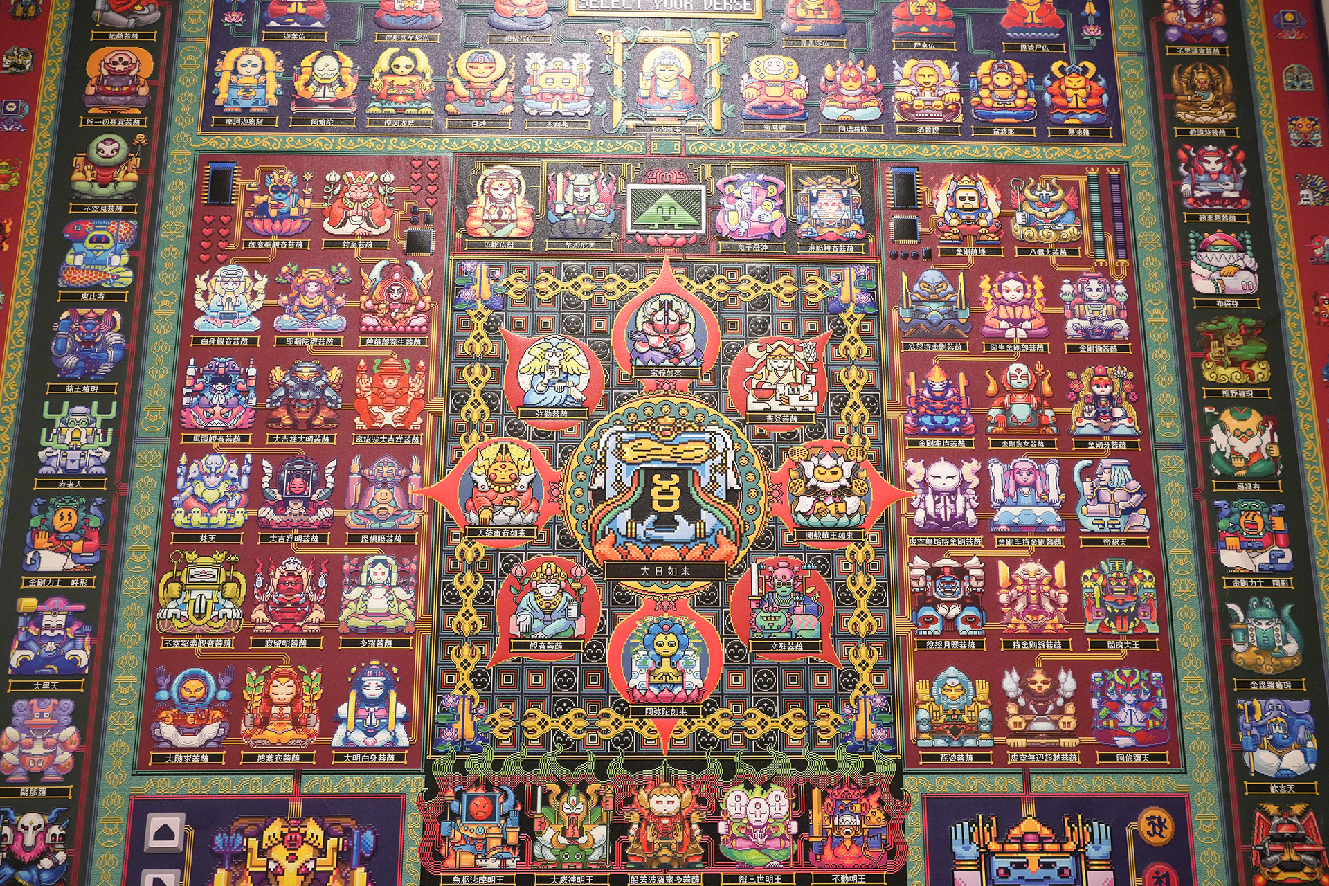 Character Select Mandala was first presented in 2024 at Character Matrix, an exhibition curated by Takakurakazuki. The work juxtaposes the Taizōkai Mandala of Heian-period Esoteric Buddhism with the structure of character selection screens found in fighting and action games. By aligning the act of selecting a character with the Shingon Buddhist ritual of kechien kanjō, in which one determines a personal guardian Buddha, and with the practice of sokushin jōbutsu, which seeks to become a Buddha through the mandala itself, the work makes visible their structural commonalities. Composed as a canvas work, it presents approximately 200 Buddhas and Bodhisattvas, including characters created by Takakurakazuki as well as characters co-created with AI.