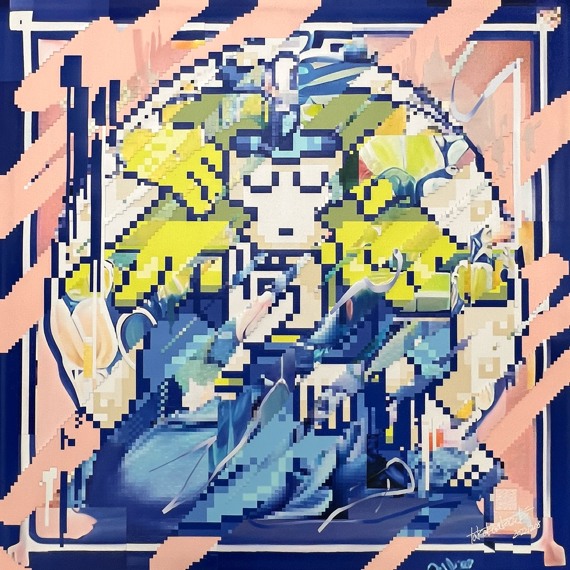 「NFT BUDDHA」のキャラクターを起点に、AIによって生成された類似イメージと元となる画像を組み合わせ再構成したキャンバスシリーズ。本作は、人間による描画と鑑賞、AIによる認識と生成の双方を往復しながら、仏教的イメージをポストヒューマン的な、人間と機械のあいだに位置する視覚装置として再配置する。