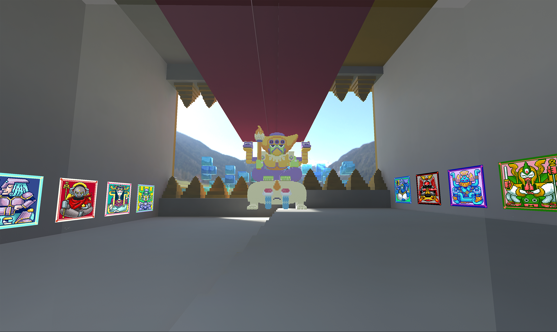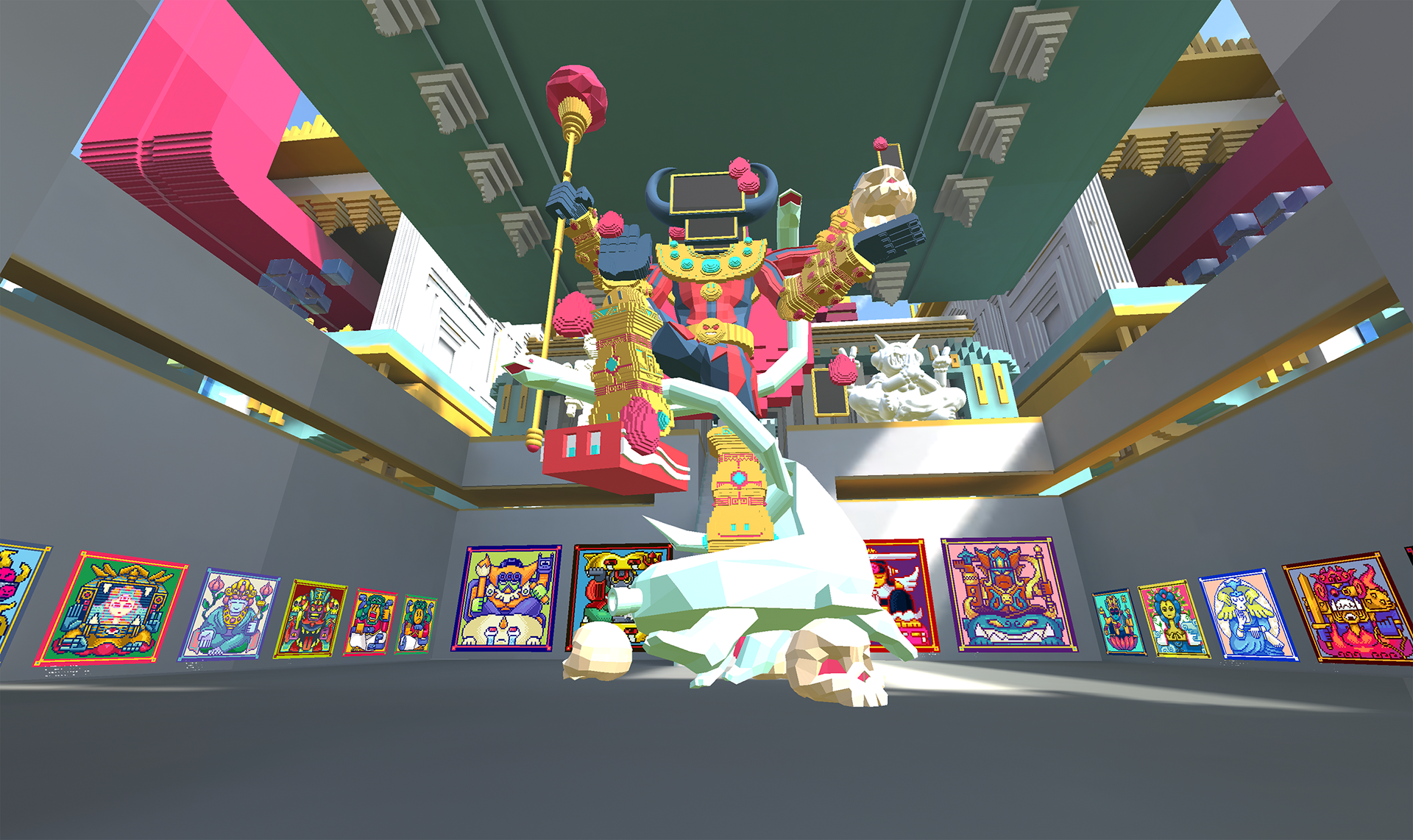 A metaverse exhibition presenting the characters of BUDDHA VERSE together in a single space, in which the metaverse museum itself was also designed by Takakurakazuki. The museum adopts a hybrid style combining elements of Western museums and Eastern temples, and is situated on a virtual lake surrounded by mountains evocative of Yamanashi. During the exhibition period, the space was accessible online, and visitors at the physical museum venue were also able to experience the exhibition using VR headsets.