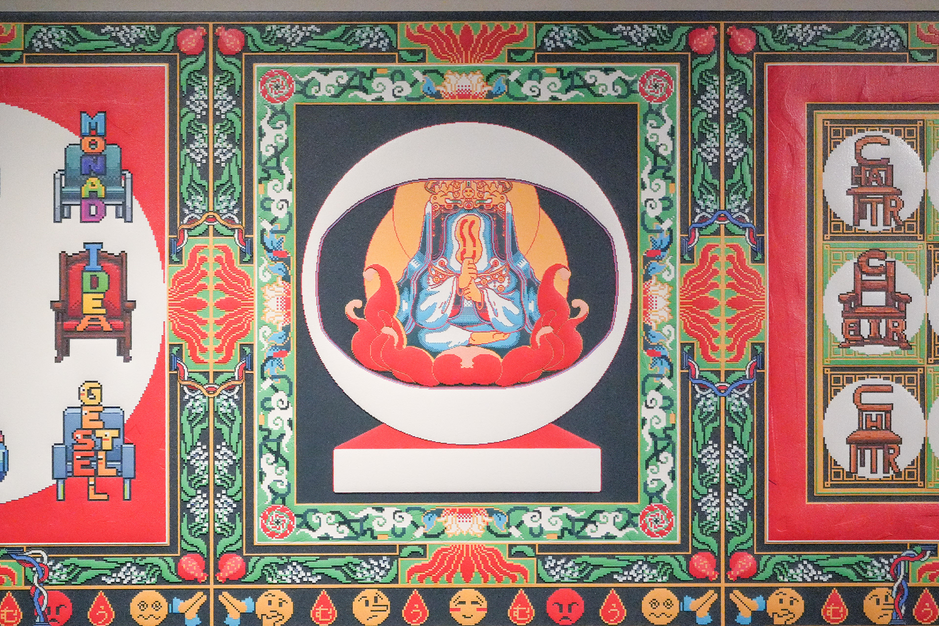 Chair Mandala arranges images and words of chairs within the form of the Vajradhātu Mandala. Buddhas are seated on chairs, and the samaya (vajra)—the attribute that identifies each Buddha—is replaced with a video game controller. Joseph Kosuth's One and Three Chairs rests on the premise that a chair can be resolved into three representations: object, photograph, and definition. This work rewrites that premise. Varied images of chairs, arrangements of words, the many meanings of sitting on a chair—the chair does not end at three, but unfolds endlessly according to the form of the mandala. One chair stands alongside many chairs, and none of them holds the position of being the correct answer. The work forms a pair with Garasen Mandala, which uses the Garbhadhātu Mandala.