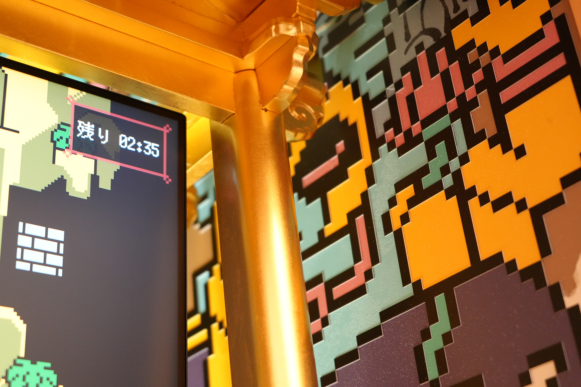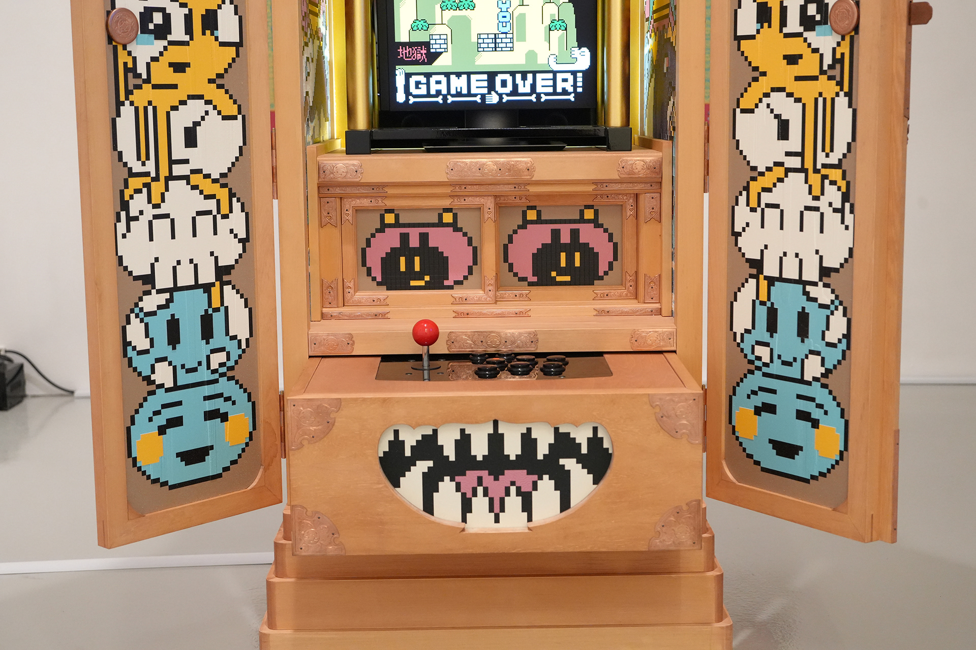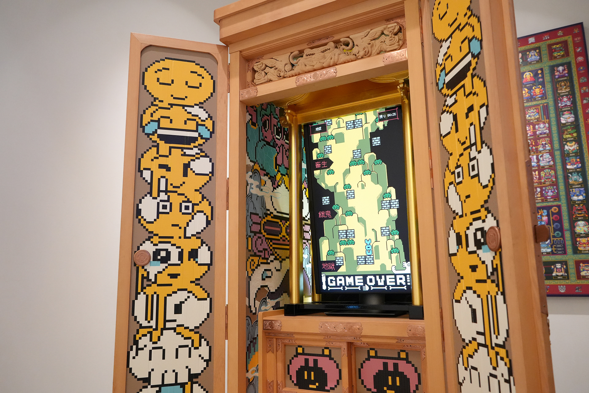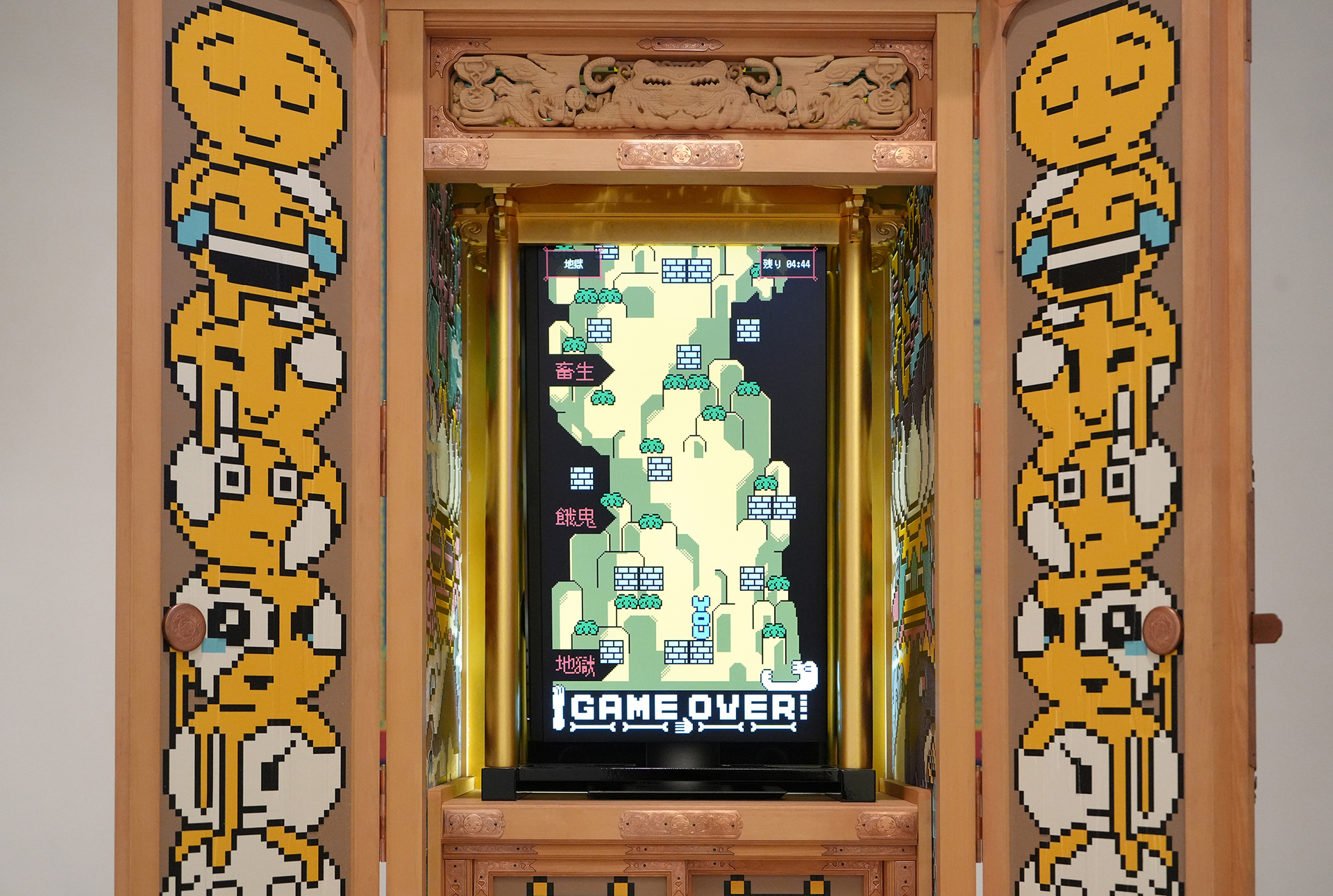 GAME OVER is a game in which the player controls “YOU” and aims to reach the summit of Mount Sumeru. “YOU” begins in hell and must, within a limited time before attaining enlightenment, ascend toward Ujōten, the highest realm of the Three Worlds. The game cabinet was crafted by Mizota Butsudan, a traditional Buddhist altar maker based in Kyushu. Adopting the format of a butsudan as a structure for virtually enshrining the soul, the cabinet houses game software designed around the pursuit of enlightenment in the afterlife. On both sides of the cabinet, the kusōzu (Nine Stages of Decay) are depicted, reconstructed using emoji.