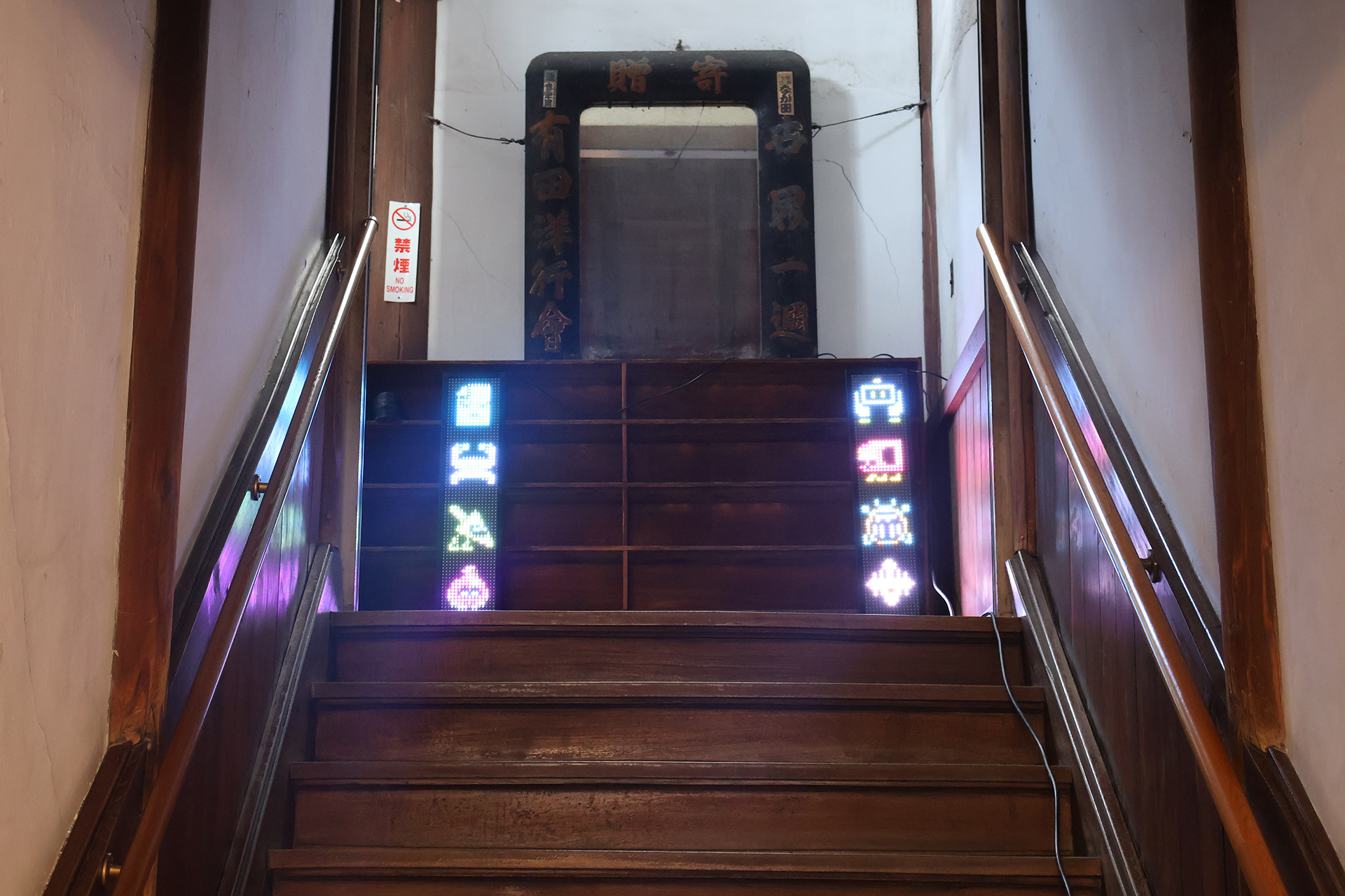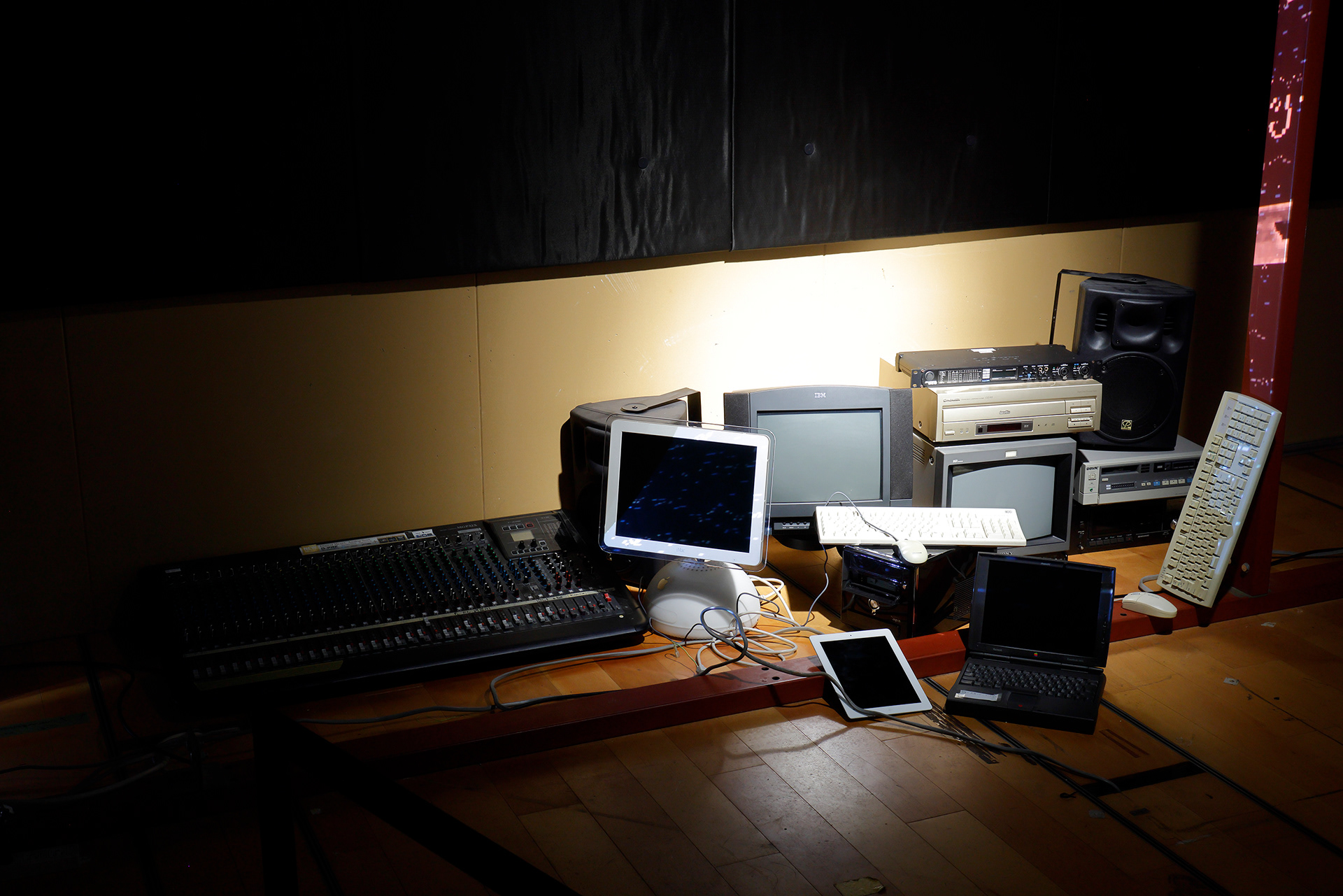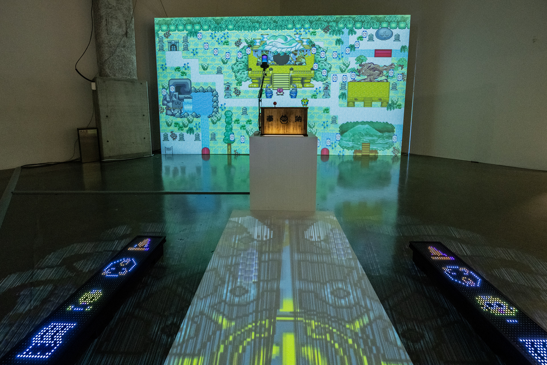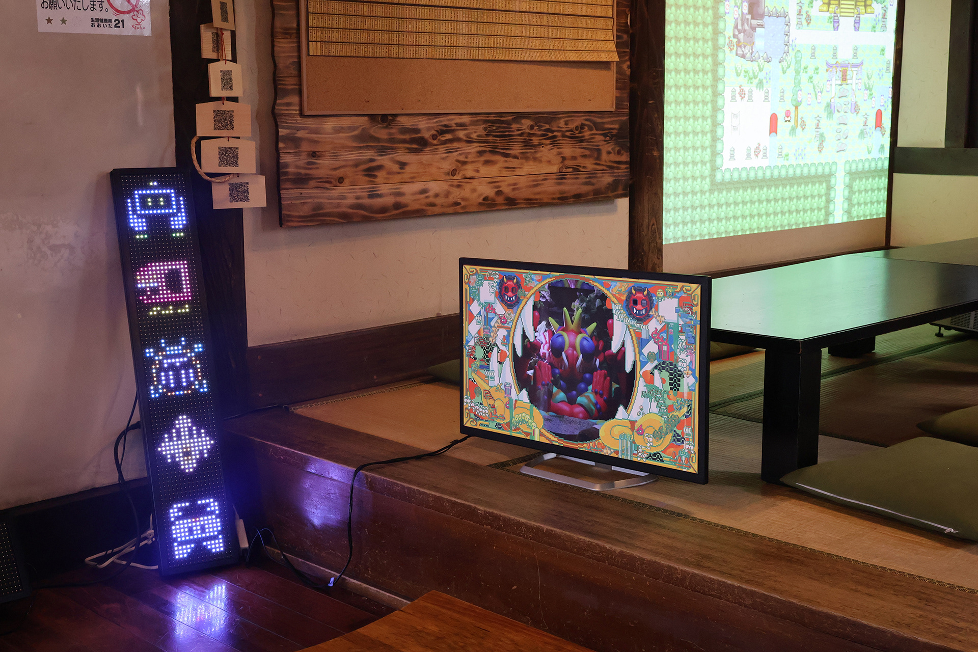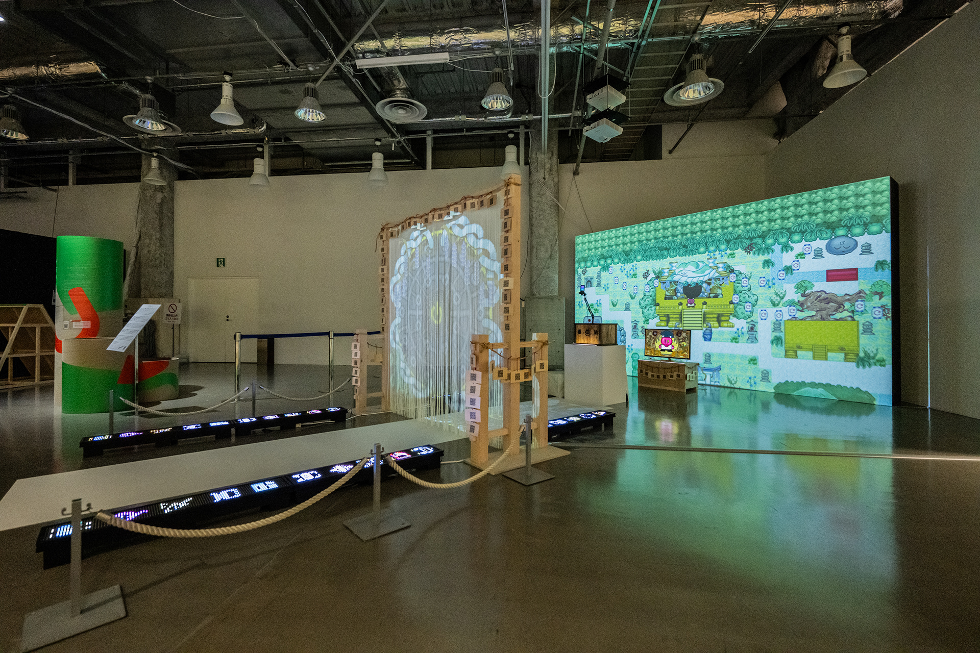 These two works were designed with inspiration from the relationship between a shrine’s main sanctuary (honden) and inner sanctuary (okusha). Words offered in (Snake) can be heard as norito (ritual chants) by visiting the shrine space of (Oni). Additionally, other players who collide with (Snake) temporarily transform into a serpentine form known as “Snake Kegare.” Behind Hyper Shrine (Snake), old PCs and media players are displayed as goshintai (sacred objects), positioned as physical presences that support the overall structure of the work.