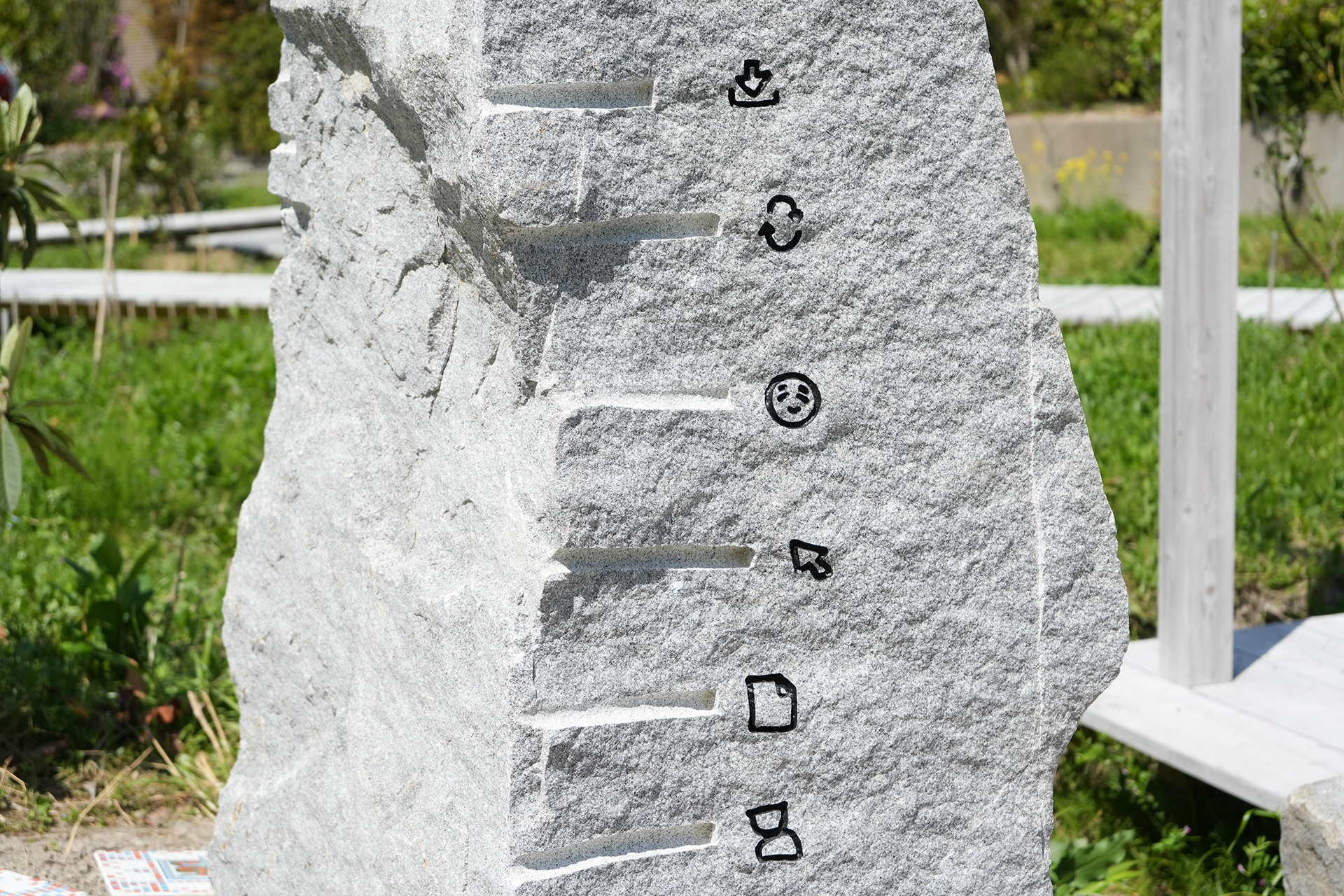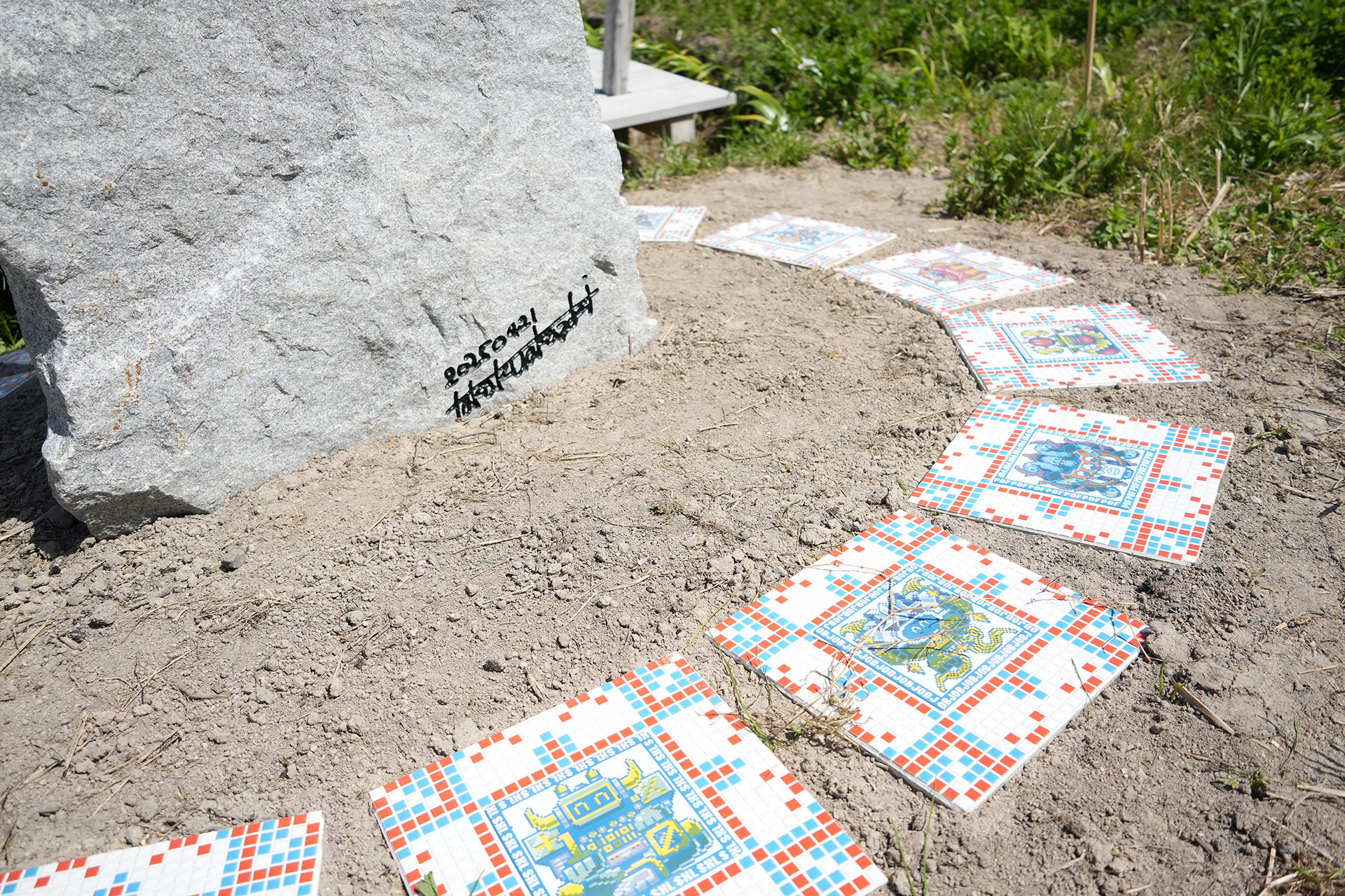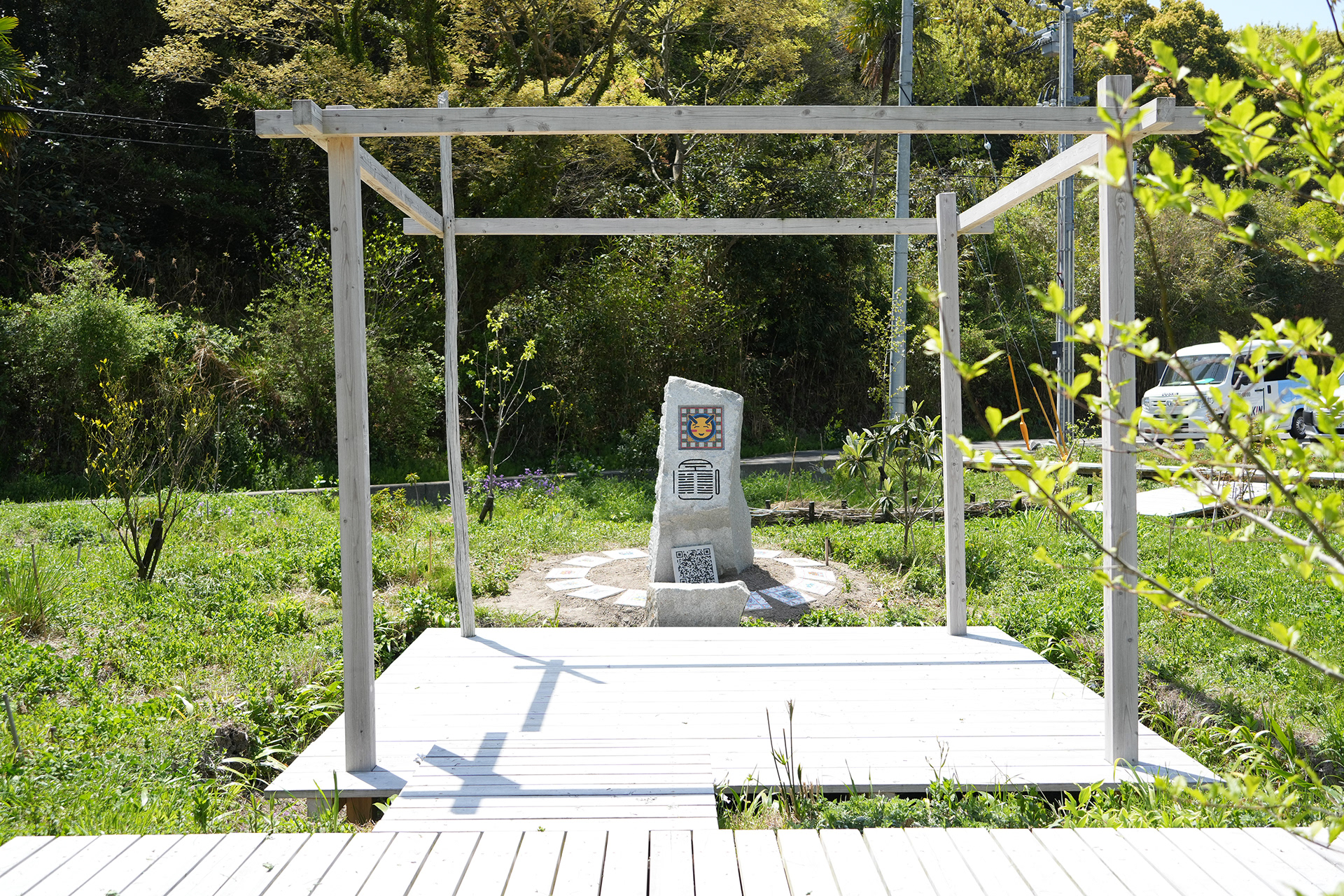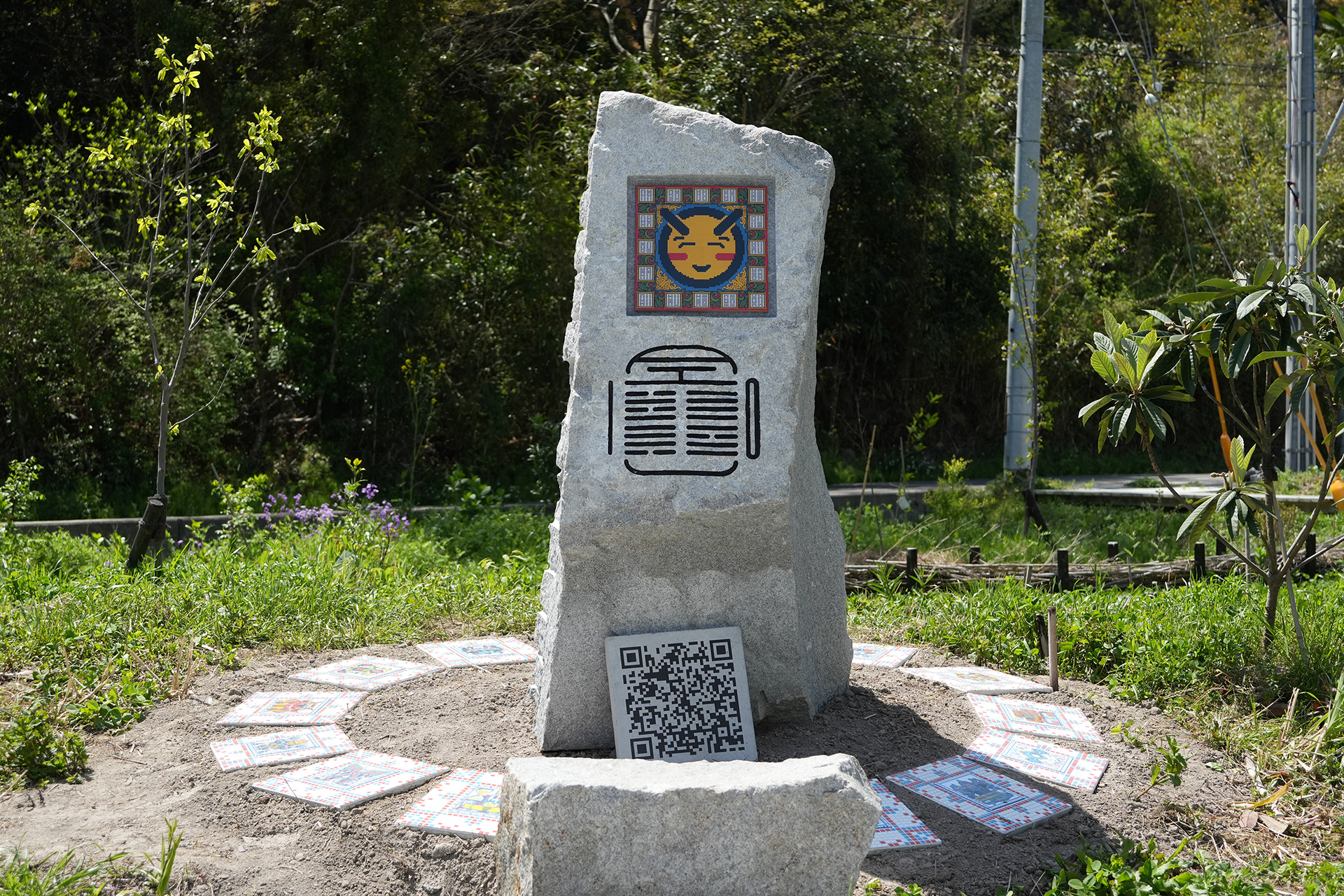 Hyper Shrine 6D, established on Naoshima, is a work created as the head shrine of the Hyper Shrine series. Produced in collaboration with Nakamura Setsuro Sekizai, a stoneworks company based in Kagawa Prefecture, the stone monument is carved with patterns that begin from the kanji character kai (廻), transform it into binary code of 0s and 1s, and further map that binary information onto “−” and “+” according to the principles of Yin–Yang and the Five Elements. In addition, motifs of digital icons and tile works depicting deities based on fifteen types of digital file formats are installed.