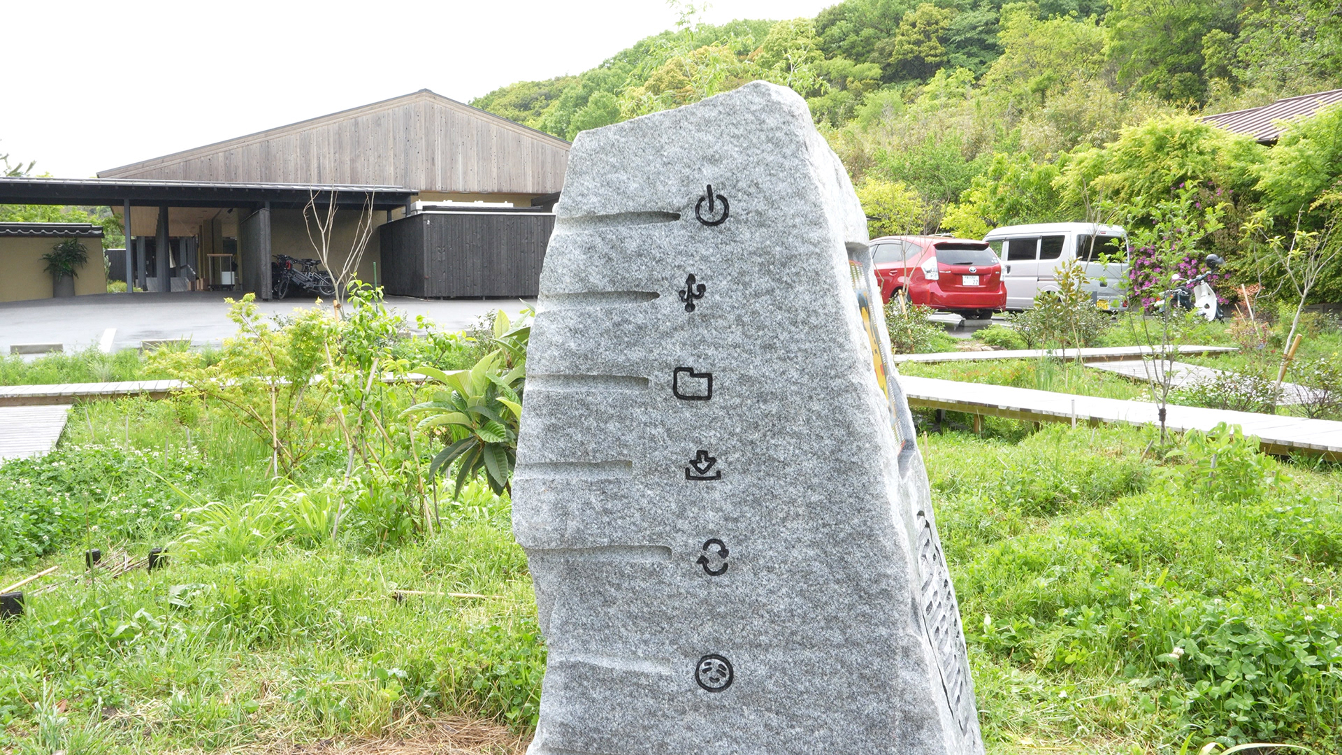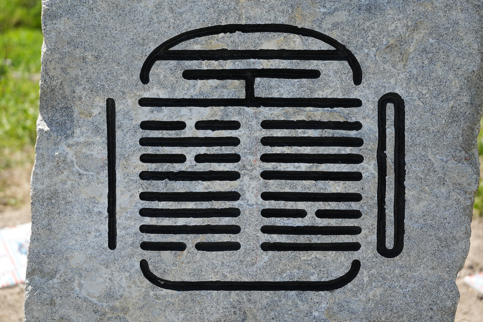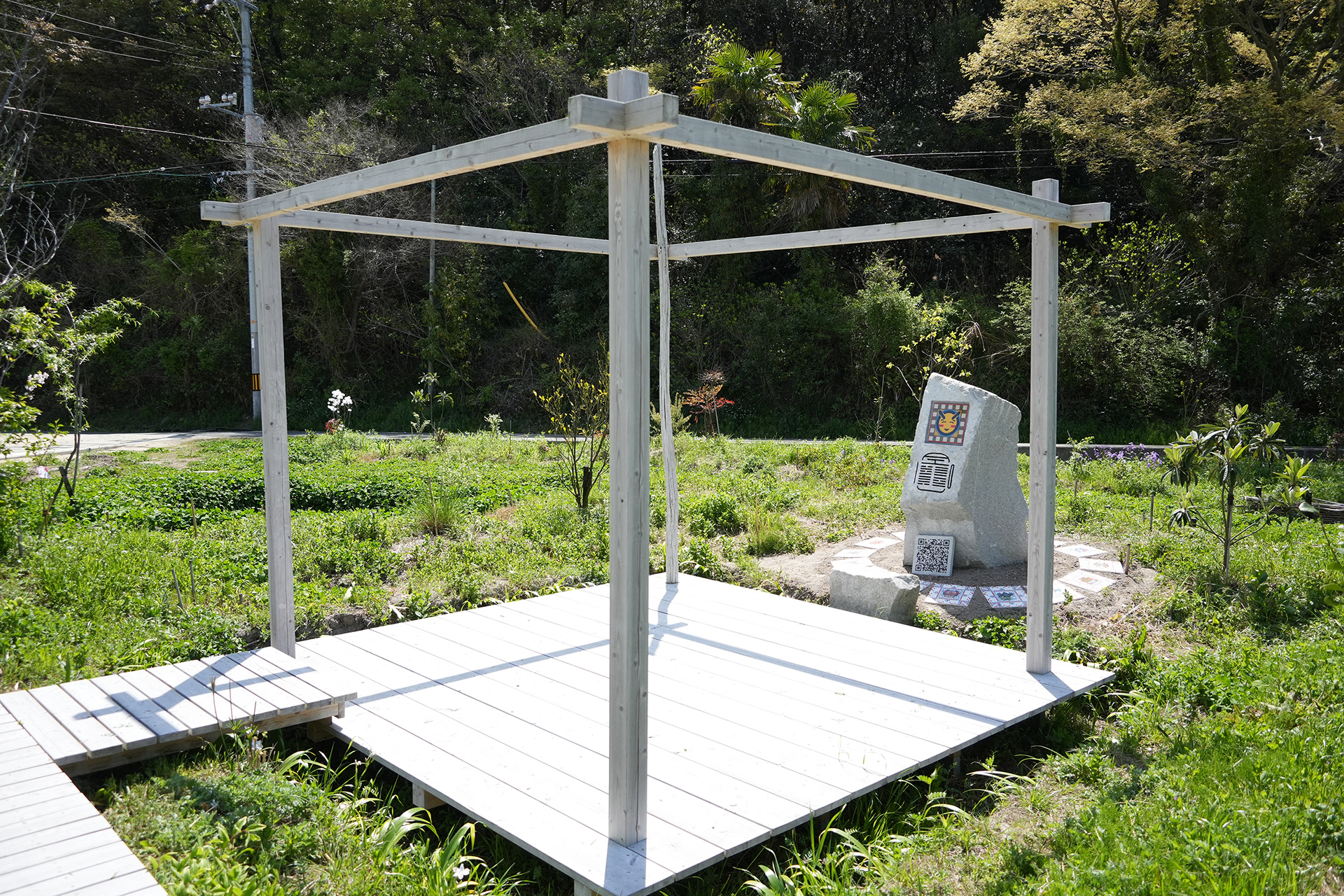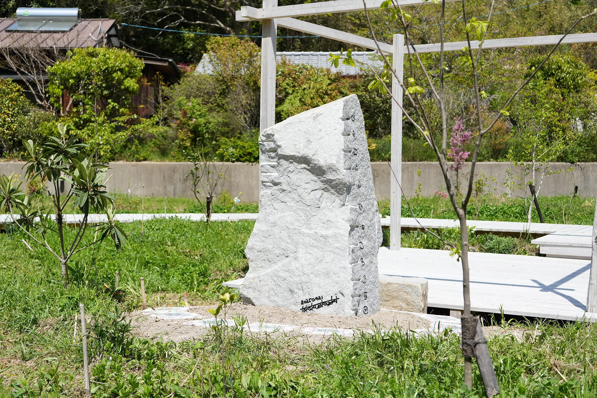 Hyper Shrine 6D, established on Naoshima, is a work created as the head shrine of the Hyper Shrine series. Produced in collaboration with Nakamura Setsuro Sekizai, a stoneworks company based in Kagawa Prefecture, the stone monument is carved with patterns that begin from the kanji character kai (廻), transform it into binary code of 0s and 1s, and further map that binary information onto “−” and “+” according to the principles of Yin–Yang and the Five Elements. In addition, motifs of digital icons and tile works depicting deities based on fifteen types of digital file formats are installed.