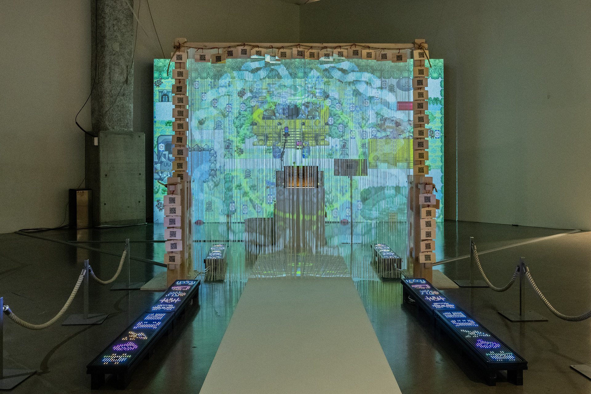 The work unfolds across multiple layers, including an online shrine, a 2D metaverse, installations, AR shrine pavilions, and physical shrine spaces, and is structured as a contemporary ritual that traverses and reexamines the relationships between the digital and belief, data and spirituality.