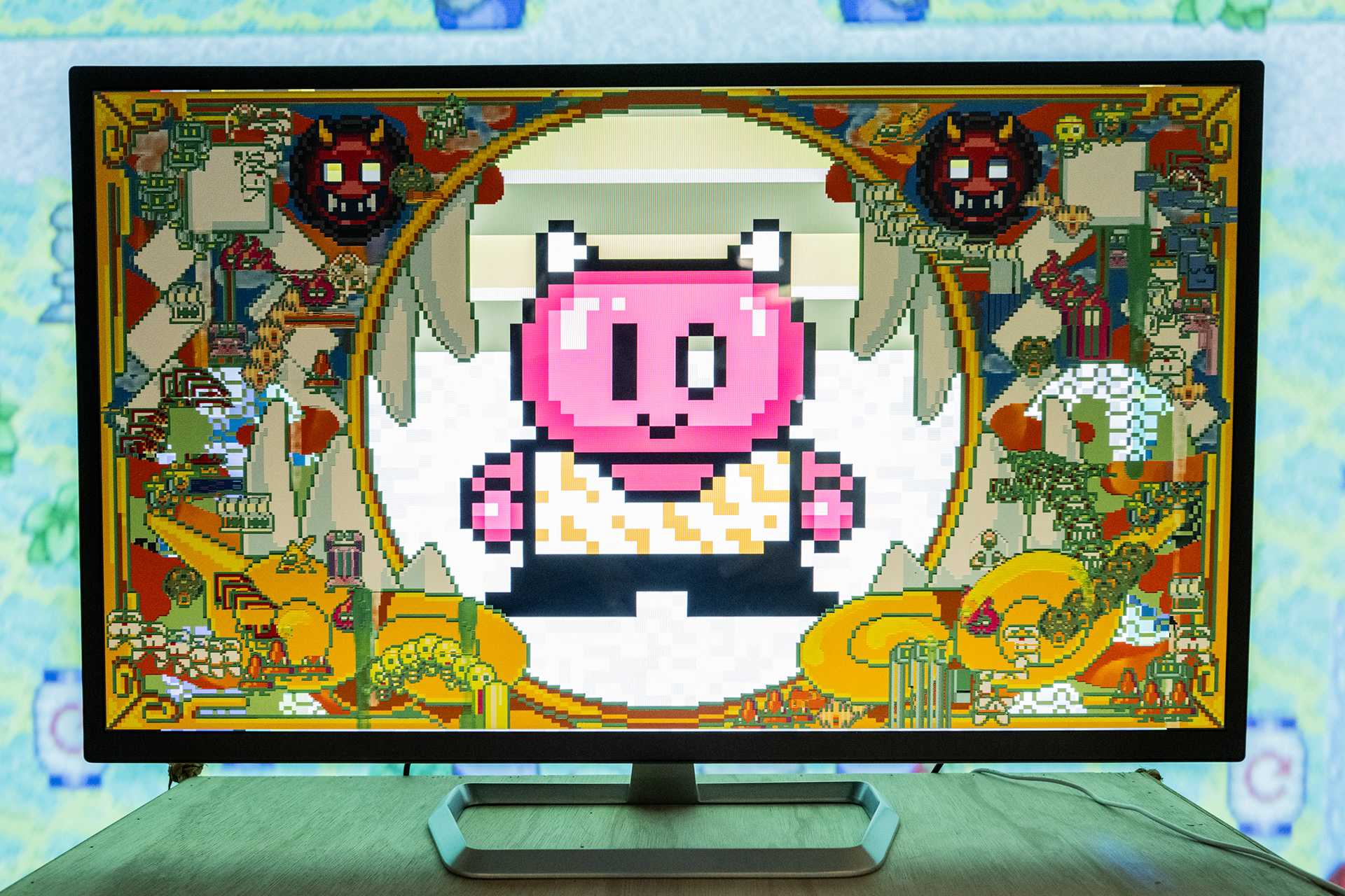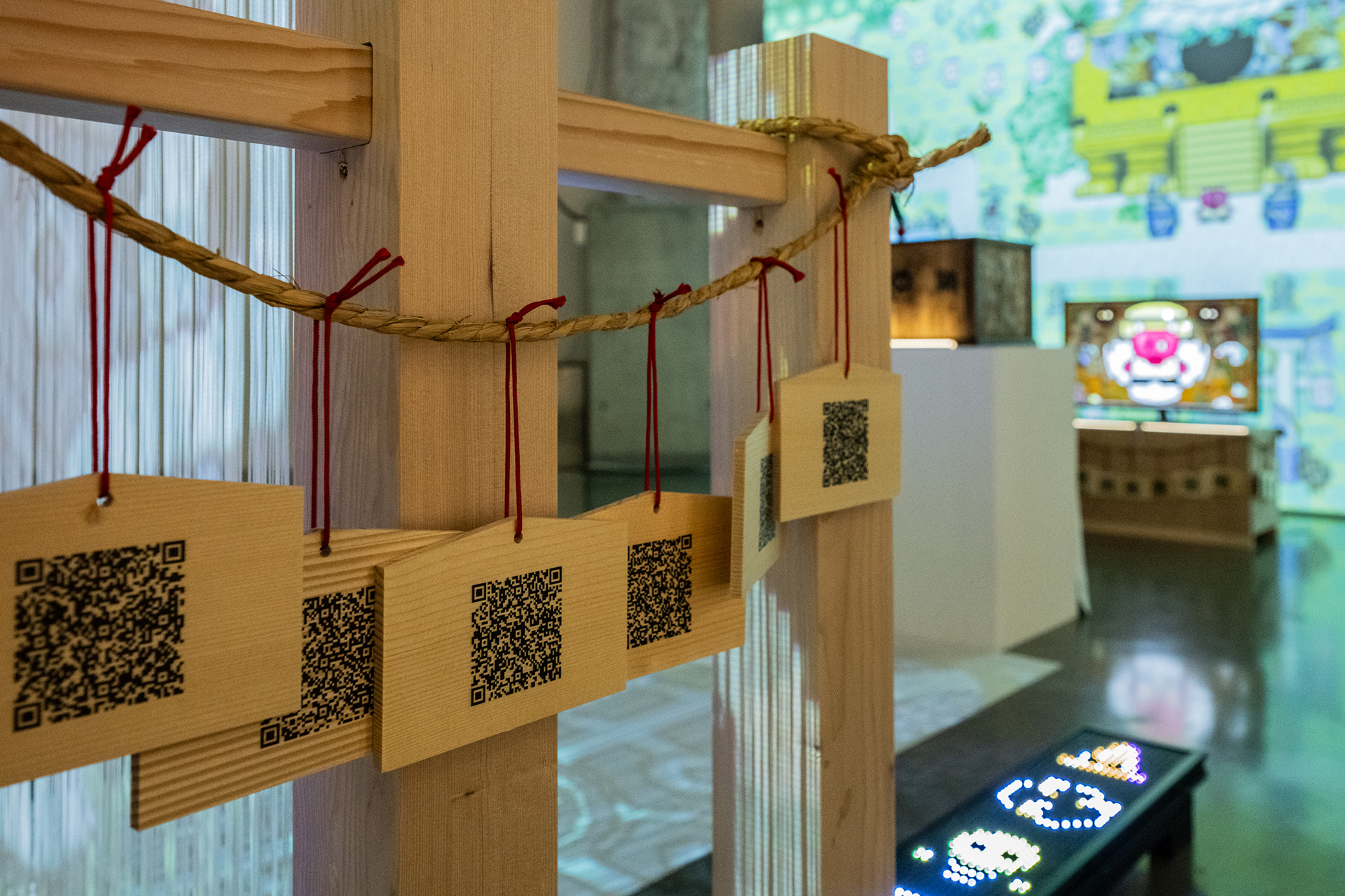 本作は、コロナ禍における情報の錯綜や炎上の構造を、平安期における「ケガレ」や「オニ」の概念と重ね合わせ、現代的な文脈で再考する試みとして構成されている。会場周囲に配置された絵馬には、ハイパー神社NFT所有者それぞれの社殿へとつながるQRコードが印刷されており、鑑賞者が各QRにアクセスすることで、末社・摂社として機能する構造を形成している。