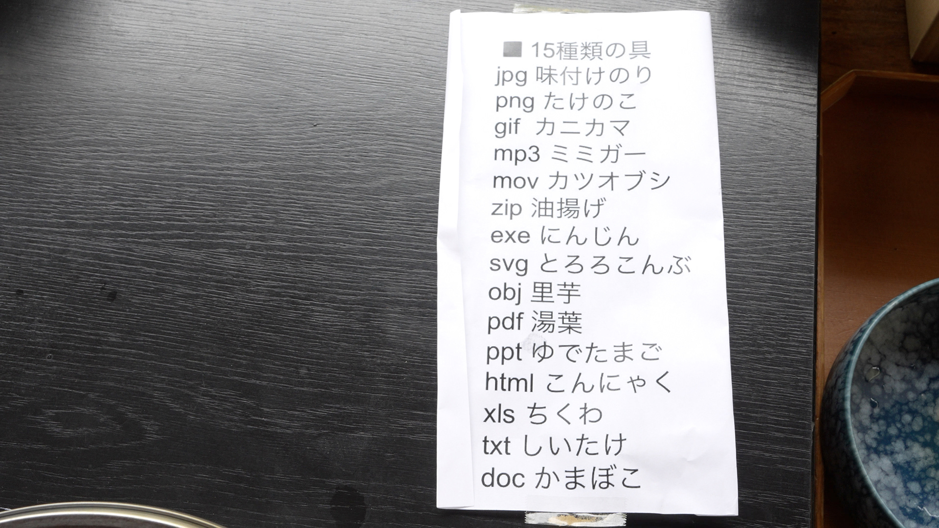 During the ritual, after offering the udon, participants selected two toppings from a set of fifteen, each associated with a digital file format—for example, jpg (seasoned seaweed) and png (bamboo shoots). Participants asked the master, “Give me four, and give me udon as well,” to which he replied, “Two are enough,” before serving udon with the two selected toppings. The participants then ate the udon together. This ritual is scheduled to be held annually on Naoshima.