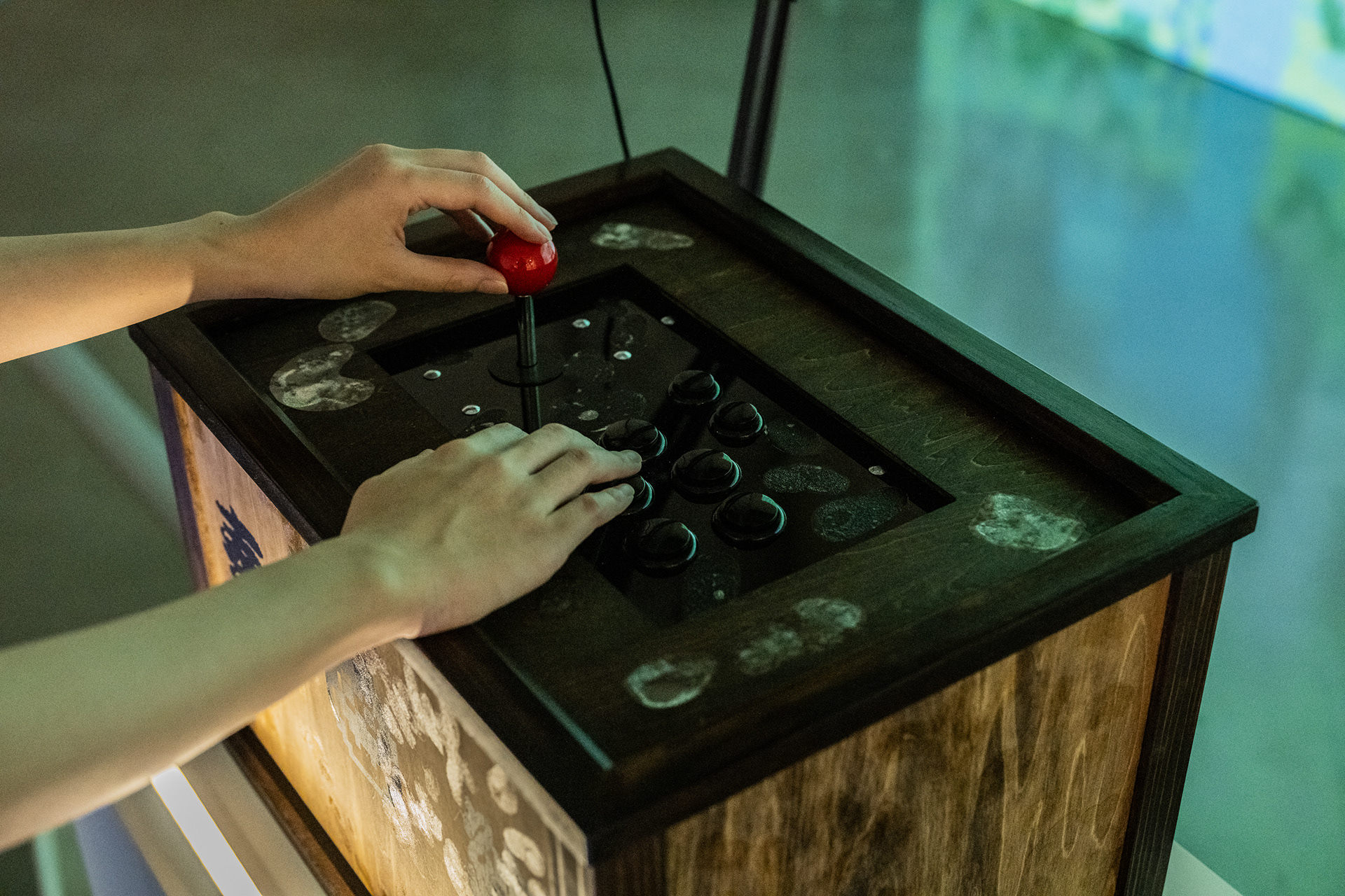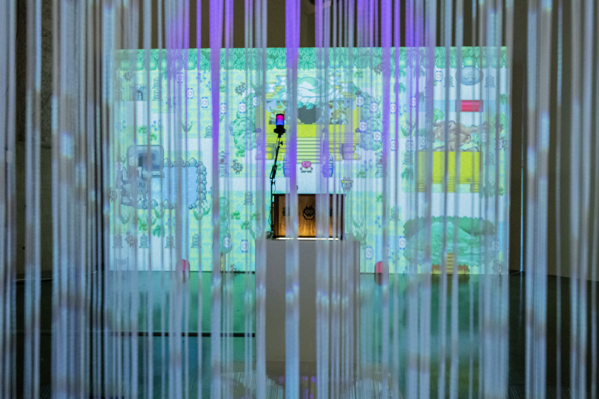 Hyper Shrine (Oni) is a series work that structures acts of worship as an installation. Visitors walk along a mountain path set at the center of the venue and use a controller shaped like a traditional offertory box to operate an oni character displayed on the screen. The oni responds to visitors’ voice input by scattering viruses. Owners of Hyper Shrine NFTs can control the characters they own and enter the same space; however, when they are struck by the oni’s virus, they themselves transform into oni.