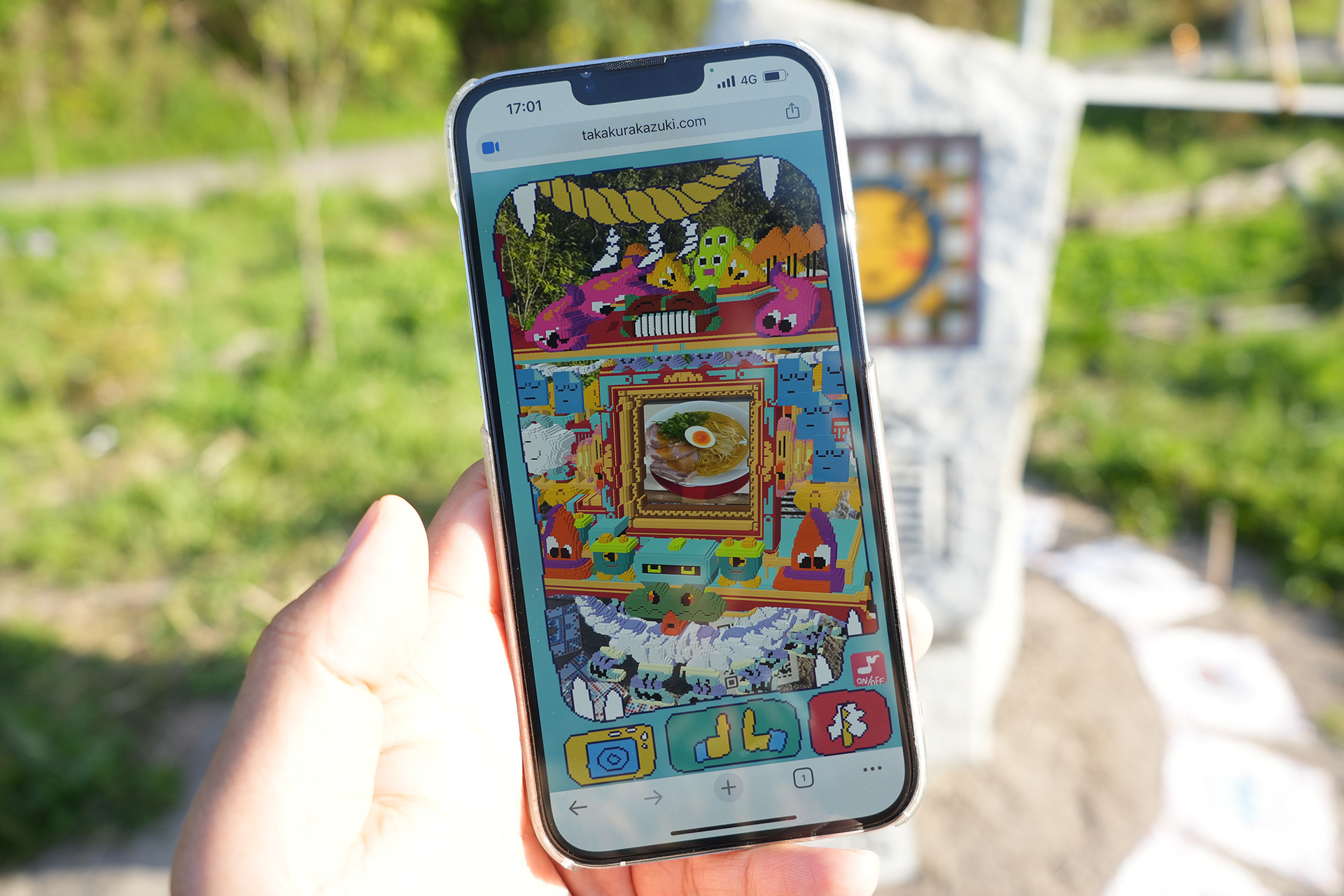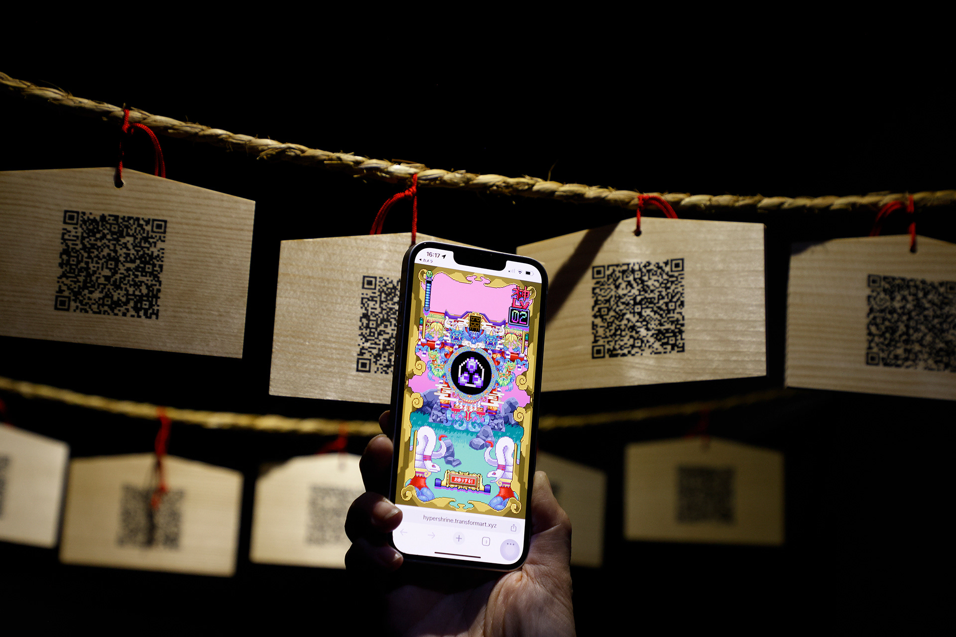 By scanning the QR code placed on the stone monument, an AR shrine pavilion rises up using the center of the monument as a marker. The work draws inspiration from the fact that, prior to the introduction of Buddhism, Japanese shrine worship—such as iwakura (sacred rock) belief—did not rely on permanent shrine buildings. Within the AR shrine, owners of Hyper Shrine NFTs can perform unlimited acts of worship and level up. Visitors who do not own Hyper Shrine NFTs can also enshrine digital images stored on their smartphones and participate in worship.