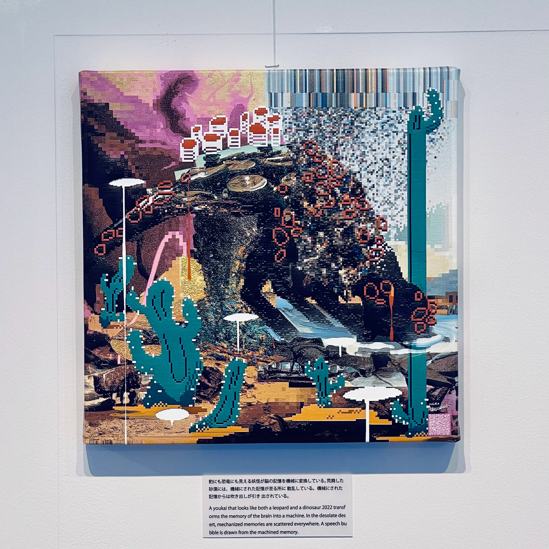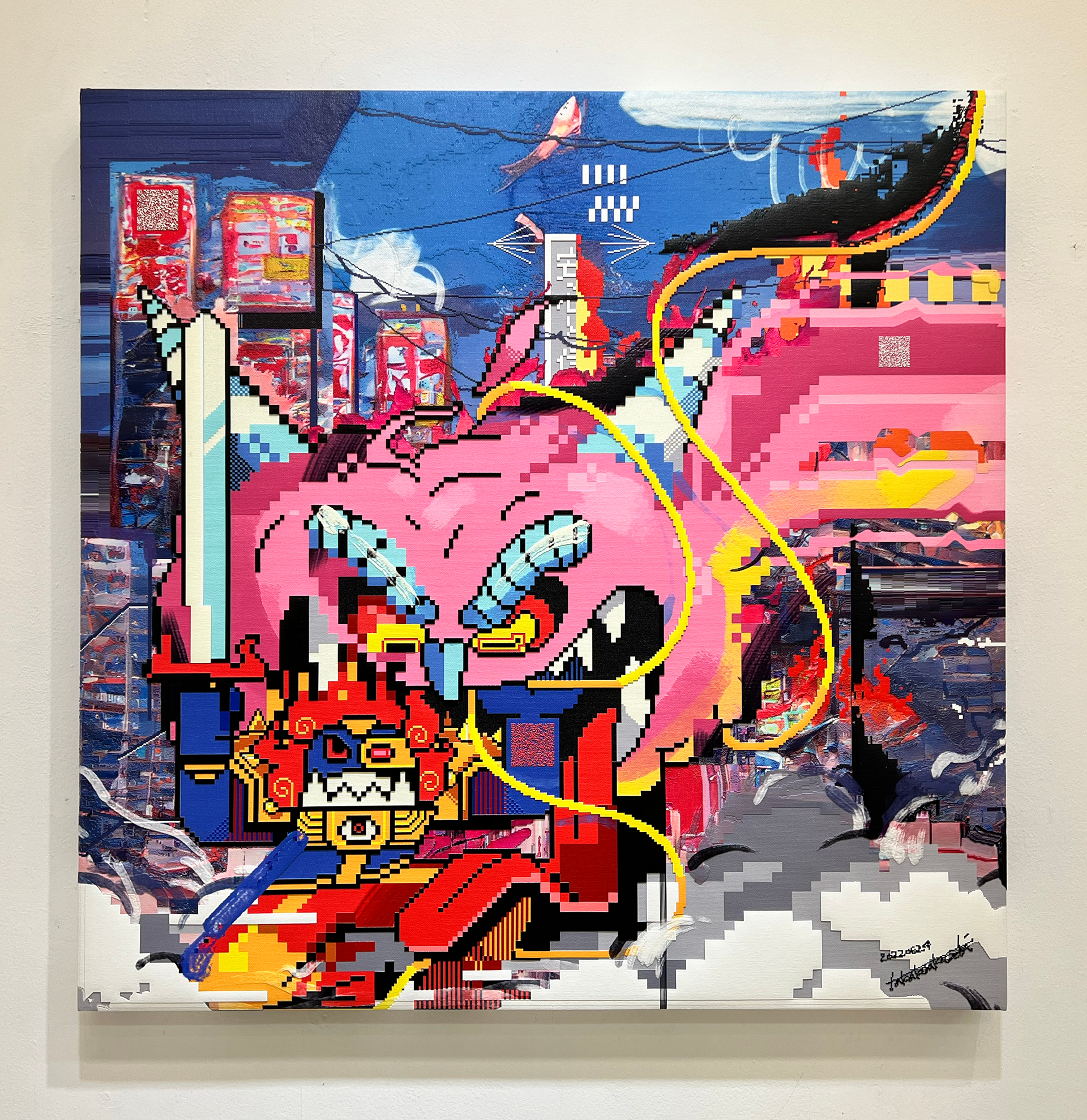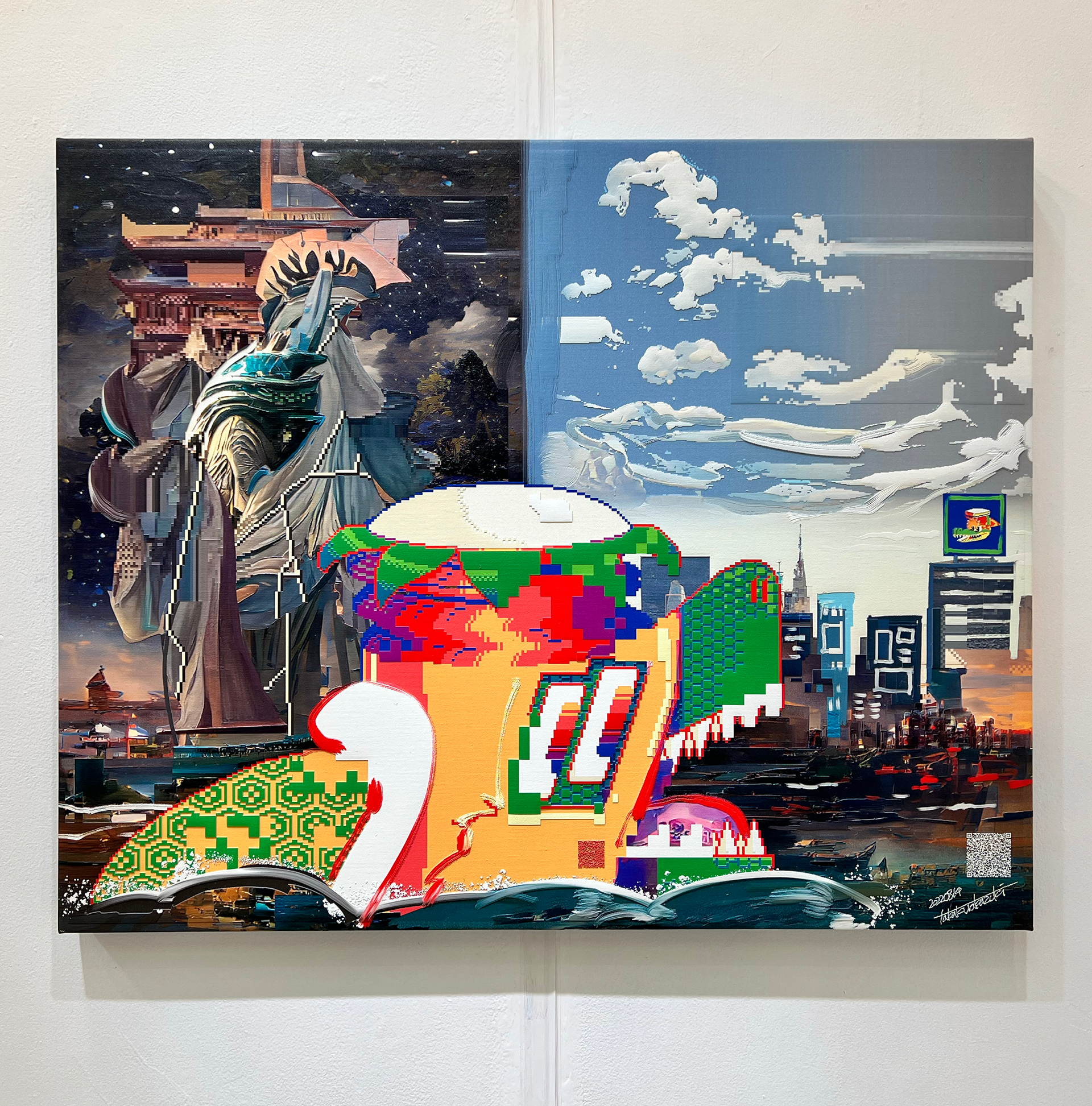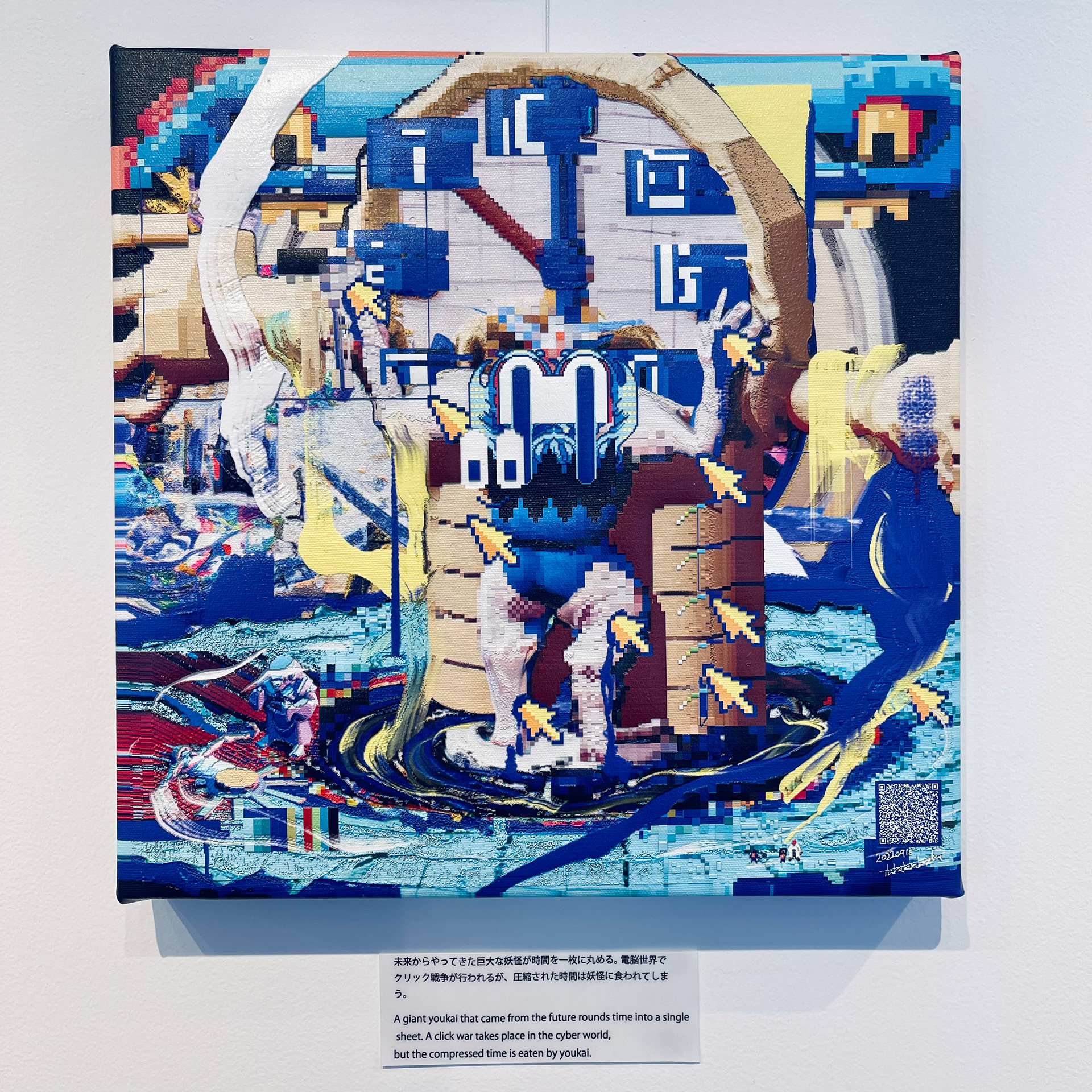 背景に生成AIによる画像を複数コラージュし、その上にピクセルアートのキャラクターを加筆したデジタルペインティングを制作。UV凹凸出力によってユニークピースとして定着させている。東京巡回展では、AIツールを制作プロセスに組み込んだ新作キャンバスシリーズを追加展示した。