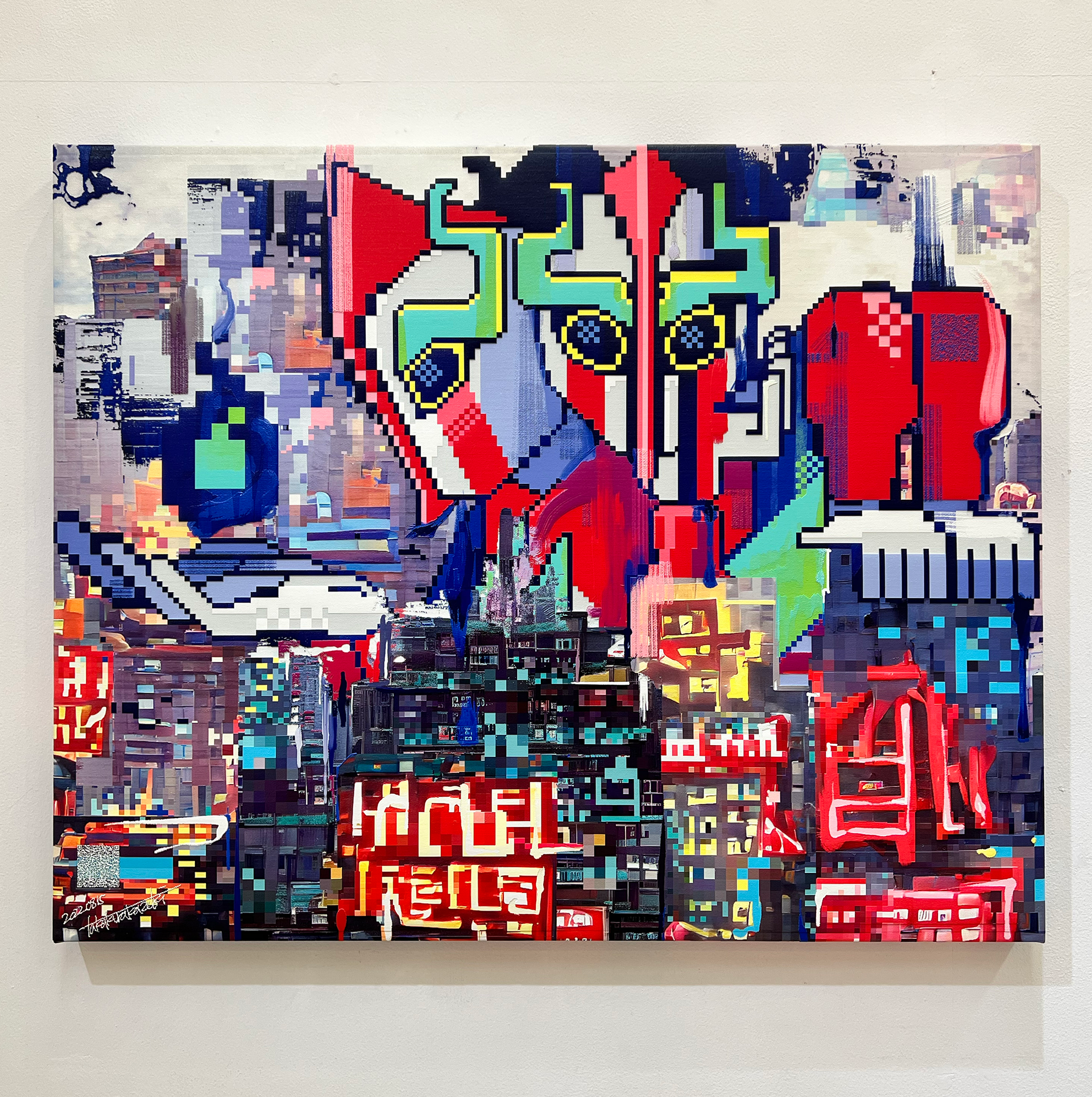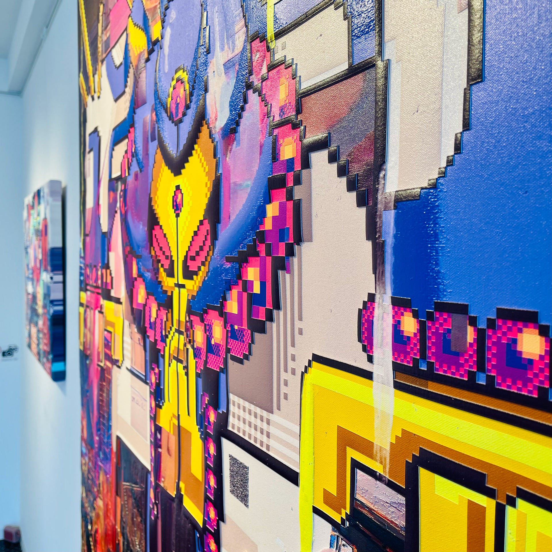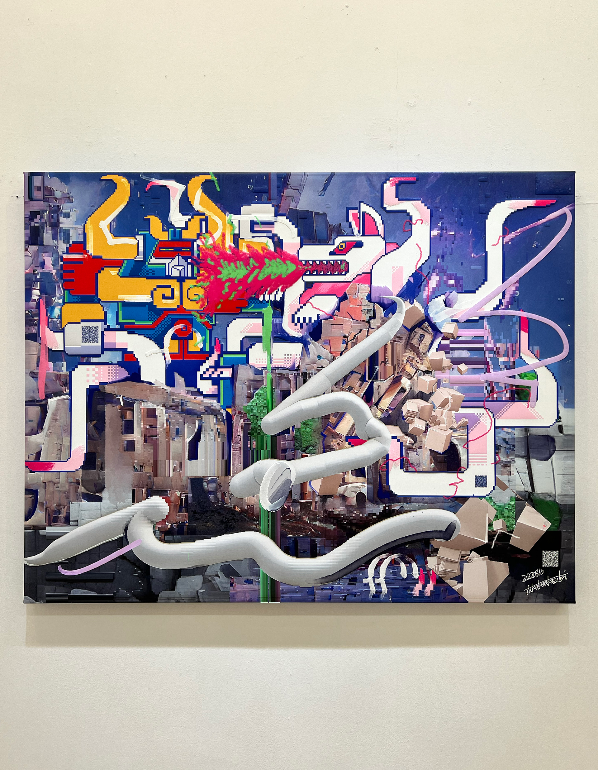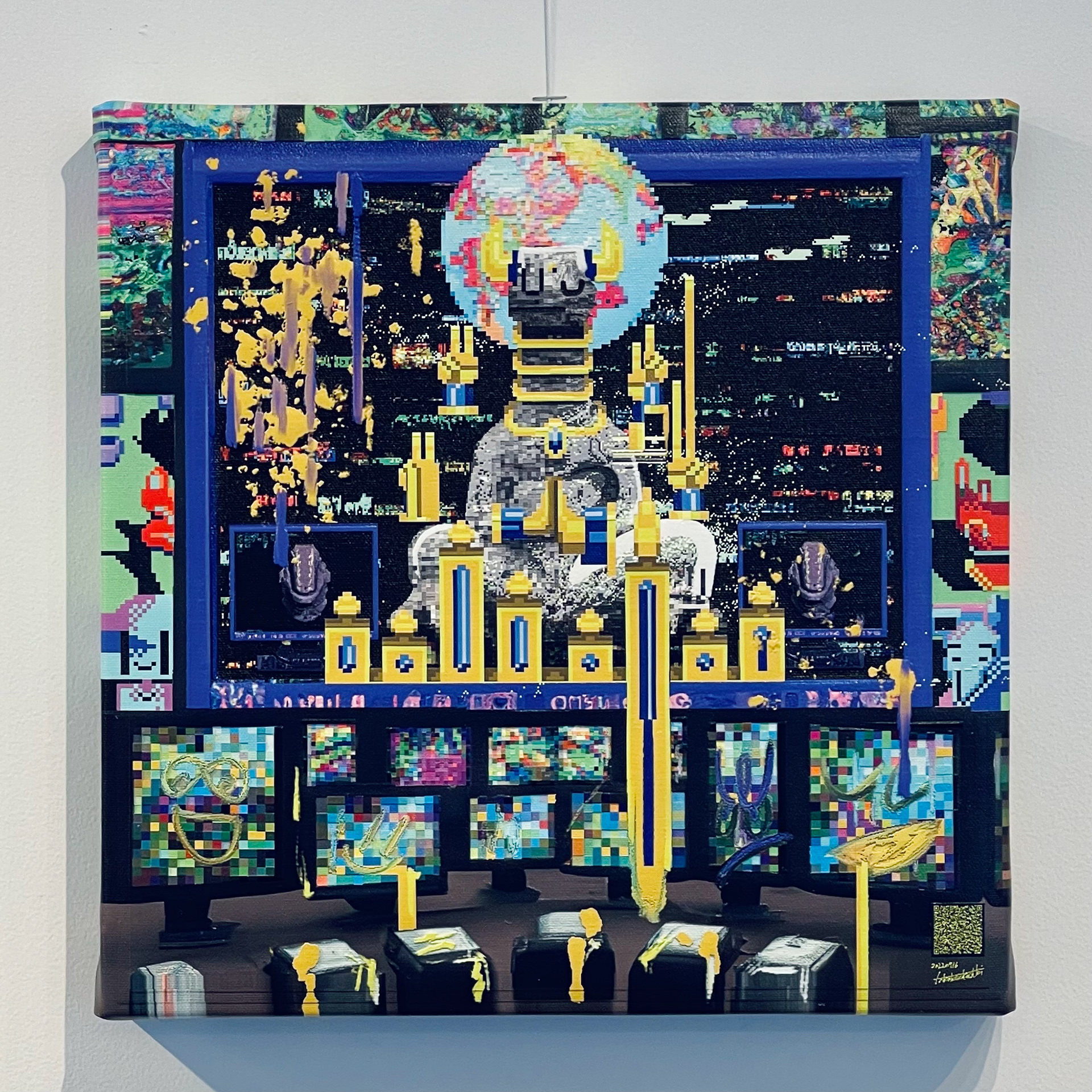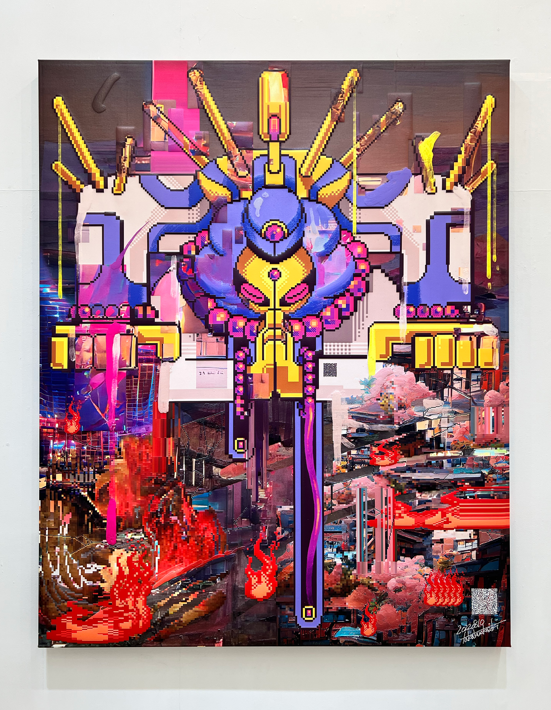背景に生成AIによる画像を複数コラージュし、その上にピクセルアートのキャラクターを加筆したデジタルペインティングを制作。UV凹凸出力によってユニークピースとして定着させている。東京巡回展では、AIツールを制作プロセスに組み込んだ新作キャンバスシリーズを追加展示した。