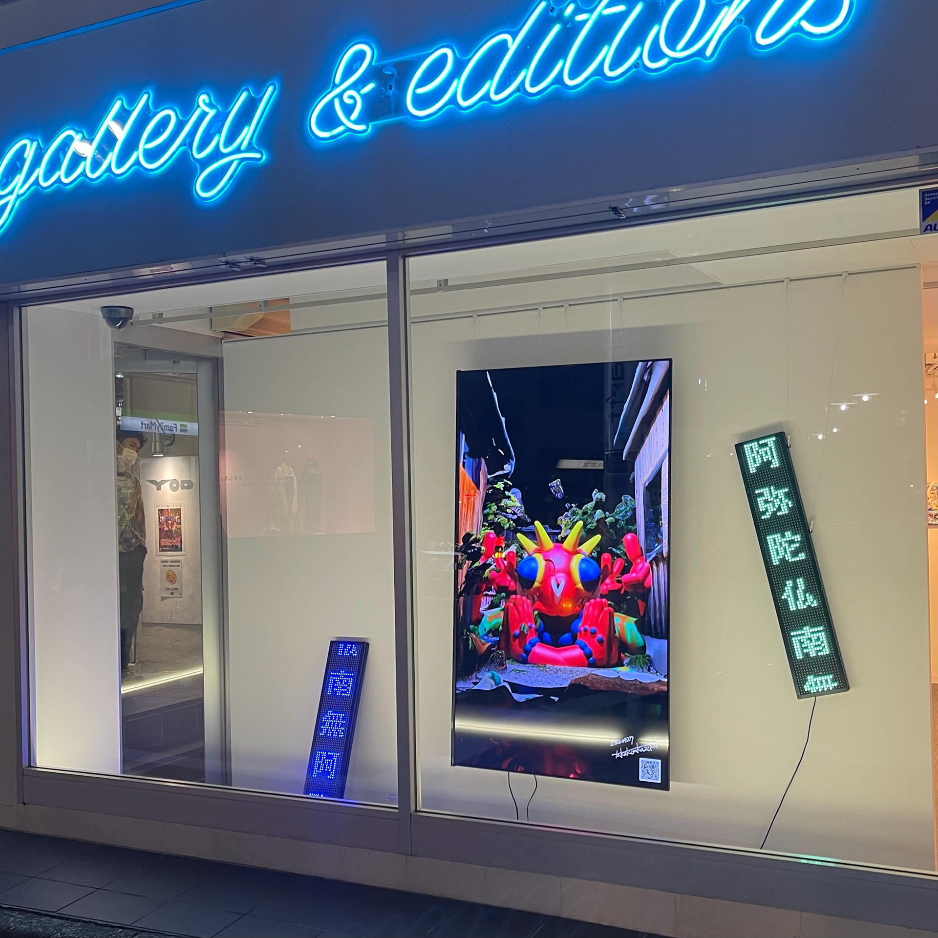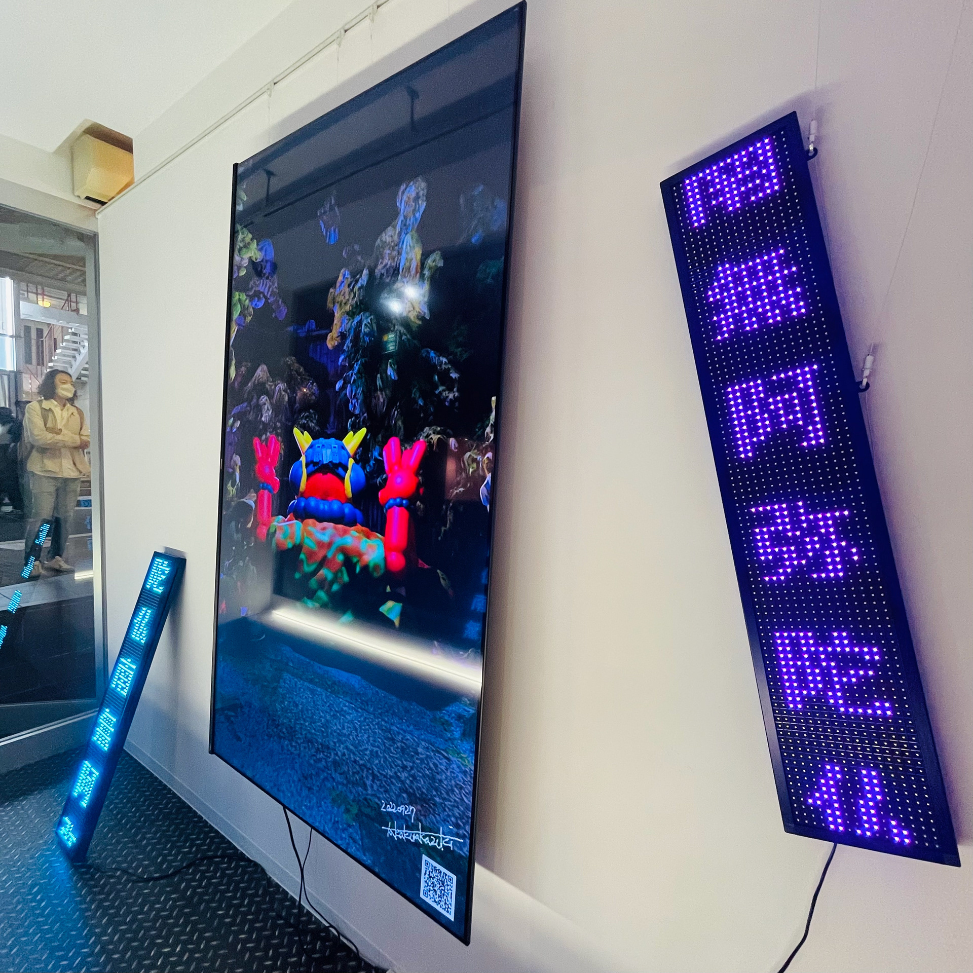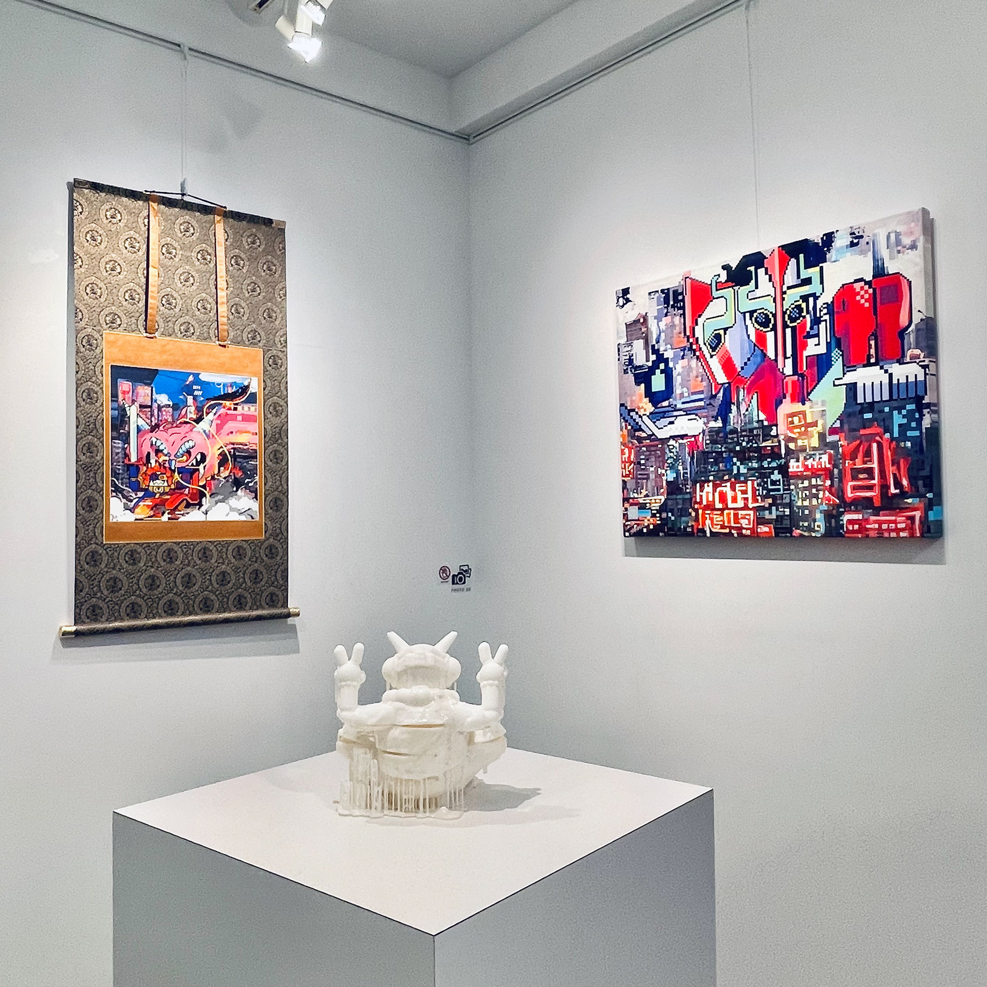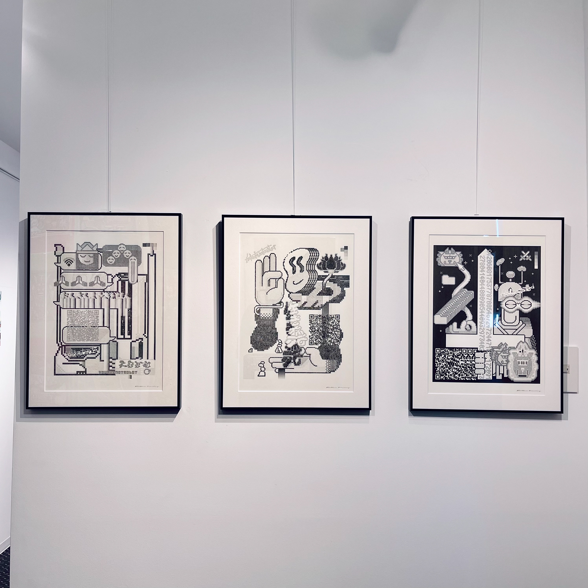 背景に生成AIによる画像を複数コラージュし、その上にピクセルアートのキャラクターを加筆したデジタルペインティングを制作。UV凹凸出力によってユニークピースとして定着させている。東京巡回展では、AIツールを制作プロセスに組み込んだ新作キャンバスシリーズを追加展示した。