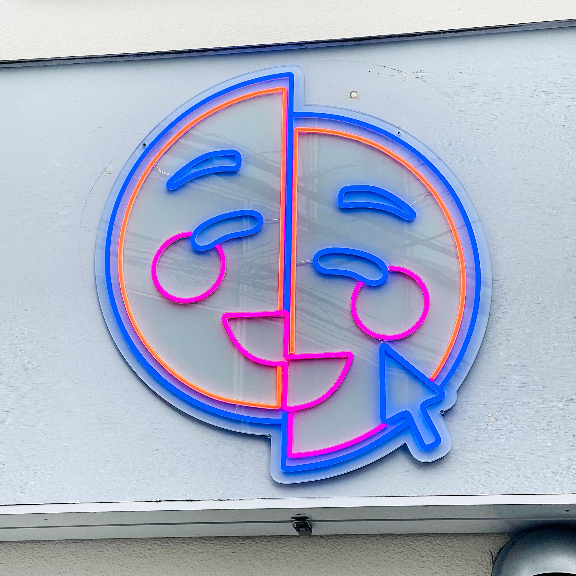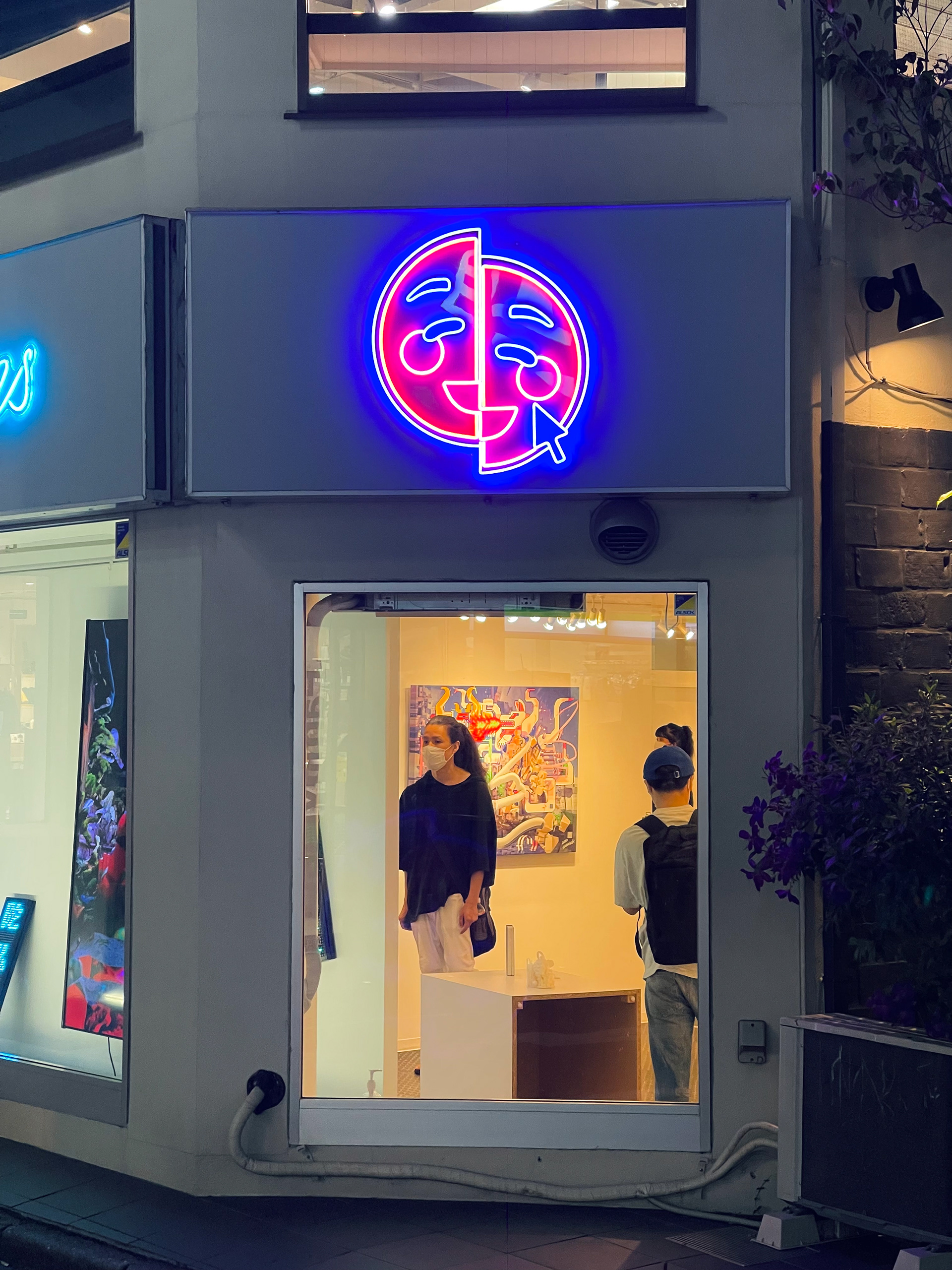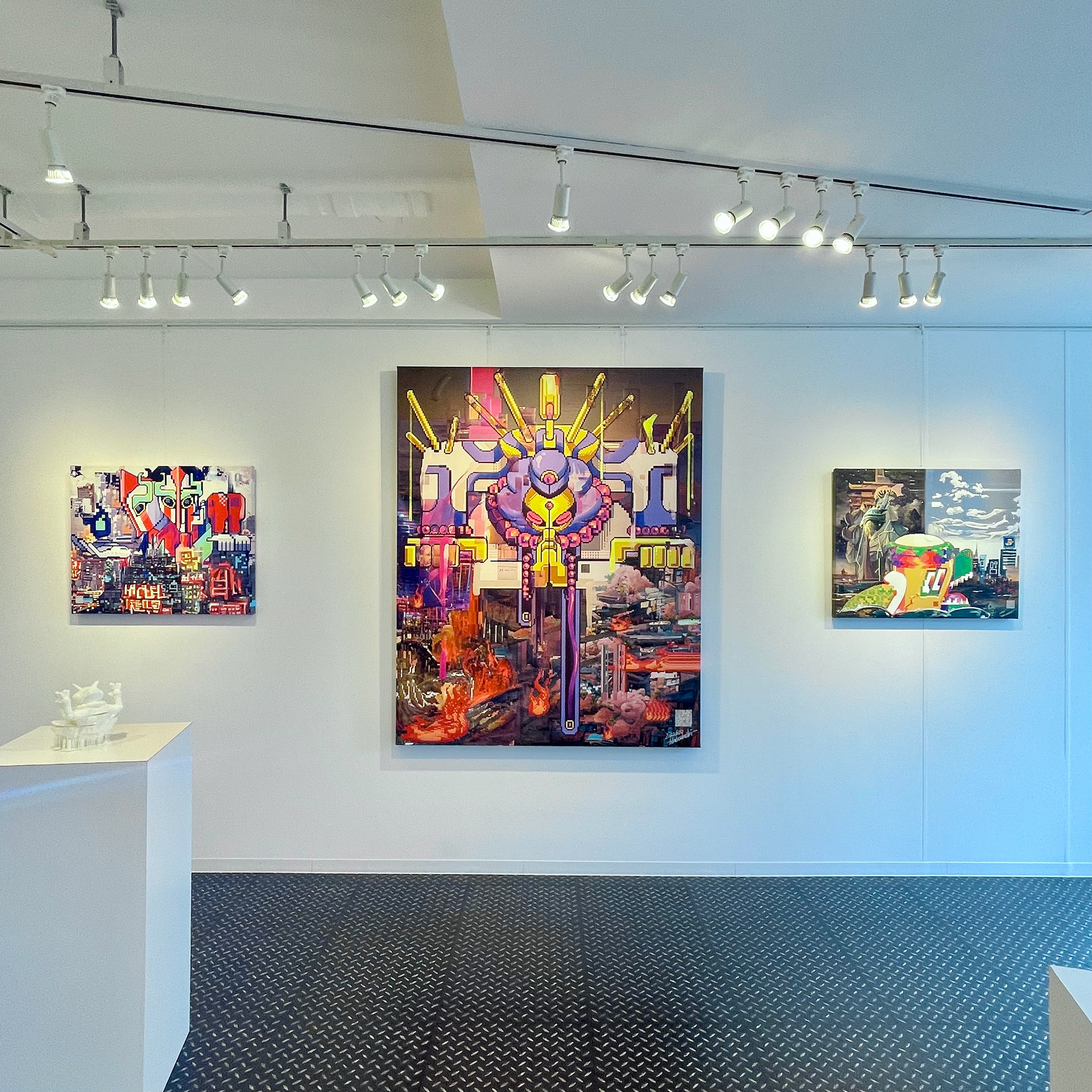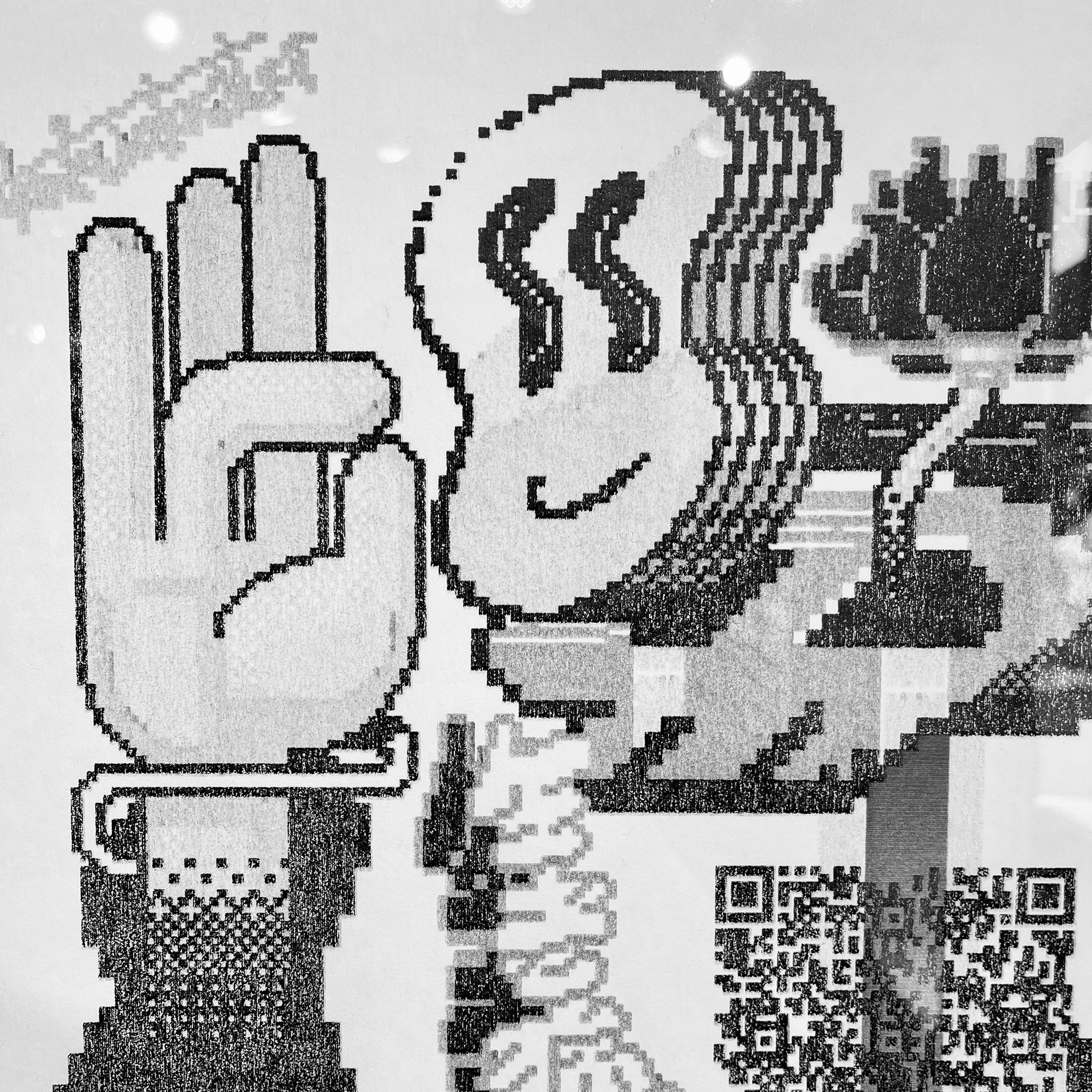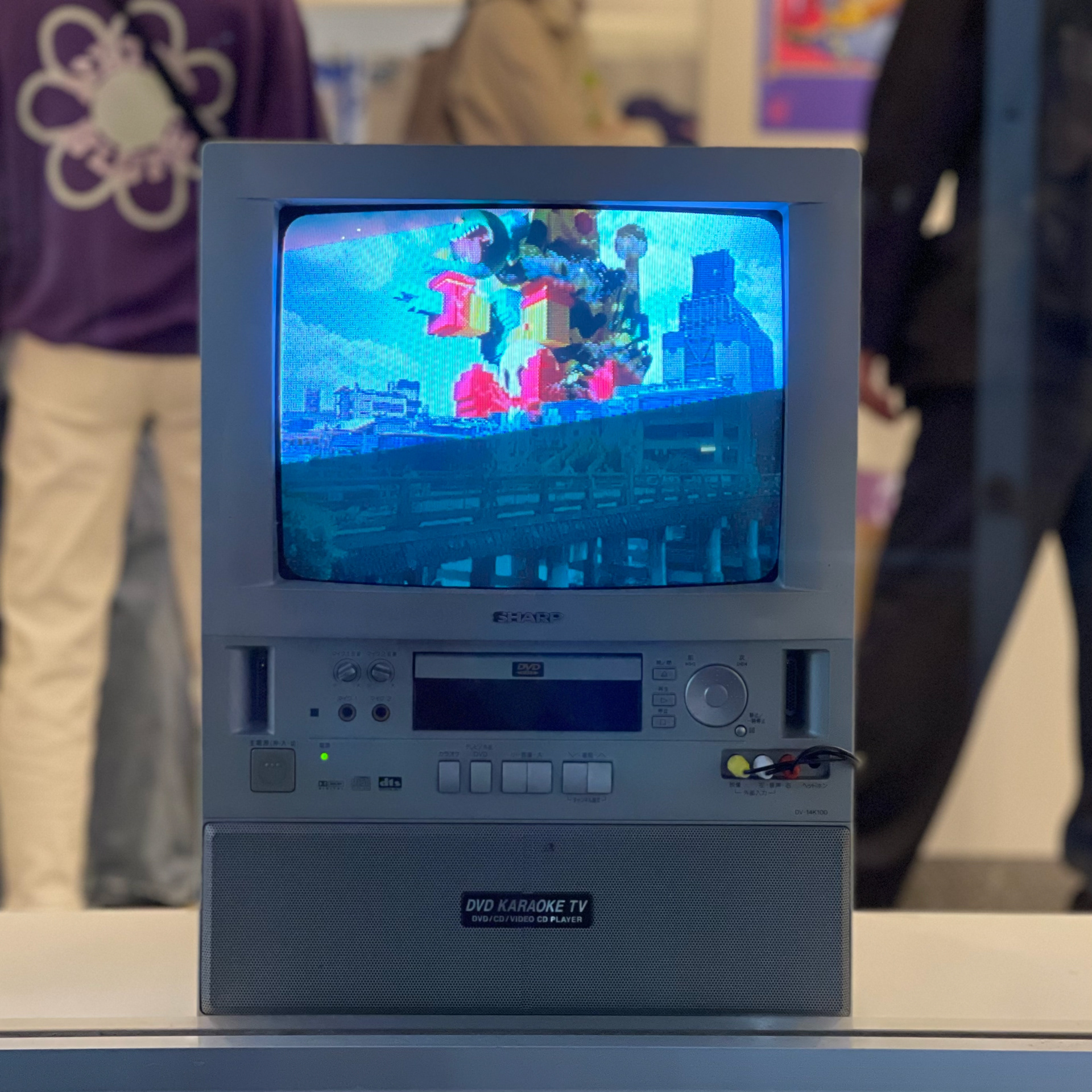 背景に生成AIによる画像を複数コラージュし、その上にピクセルアートのキャラクターを加筆したデジタルペインティングを制作。UV凹凸出力によってユニークピースとして定着させている。東京巡回展では、AIツールを制作プロセスに組み込んだ新作キャンバスシリーズを追加展示した。
