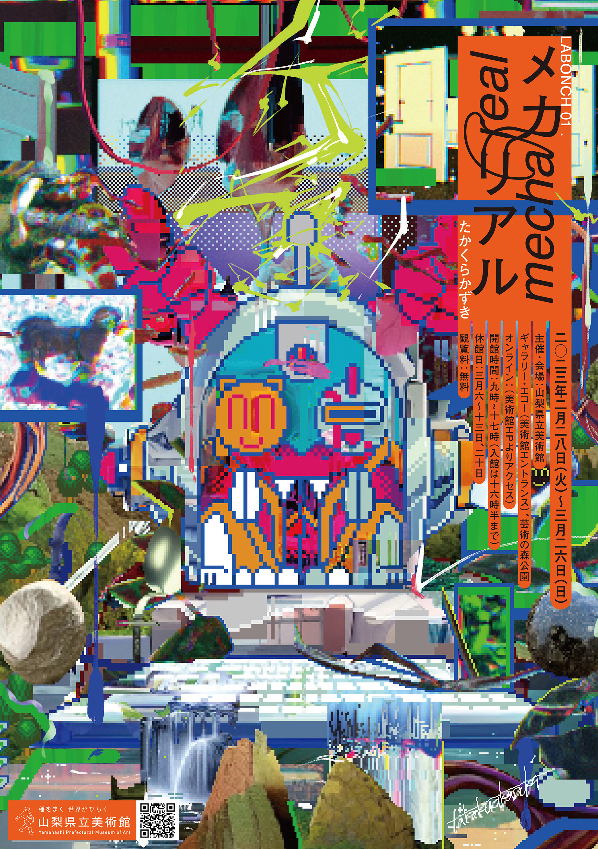 本展は、山梨県立美術館の館内空間、芸術の森公園、仮想空間を舞台に展開した個展である。タイトルの「メカリアル」は、シュルレアリスムが日本に受容された際に見られた機械主義的傾向に着目し、たかくらかずきが独自に造語した言葉である。本プロジェクトの出発点には、日本におけるシュルレアリスム黎明期に活躍した山梨県出身の画家・米倉壽仁の作品がある。米倉が晩年に探求した、東洋思想や仏教、土着の信仰とシュルレアリスムを融合させる試みは、たかくら自身の制作と強く重なっている。