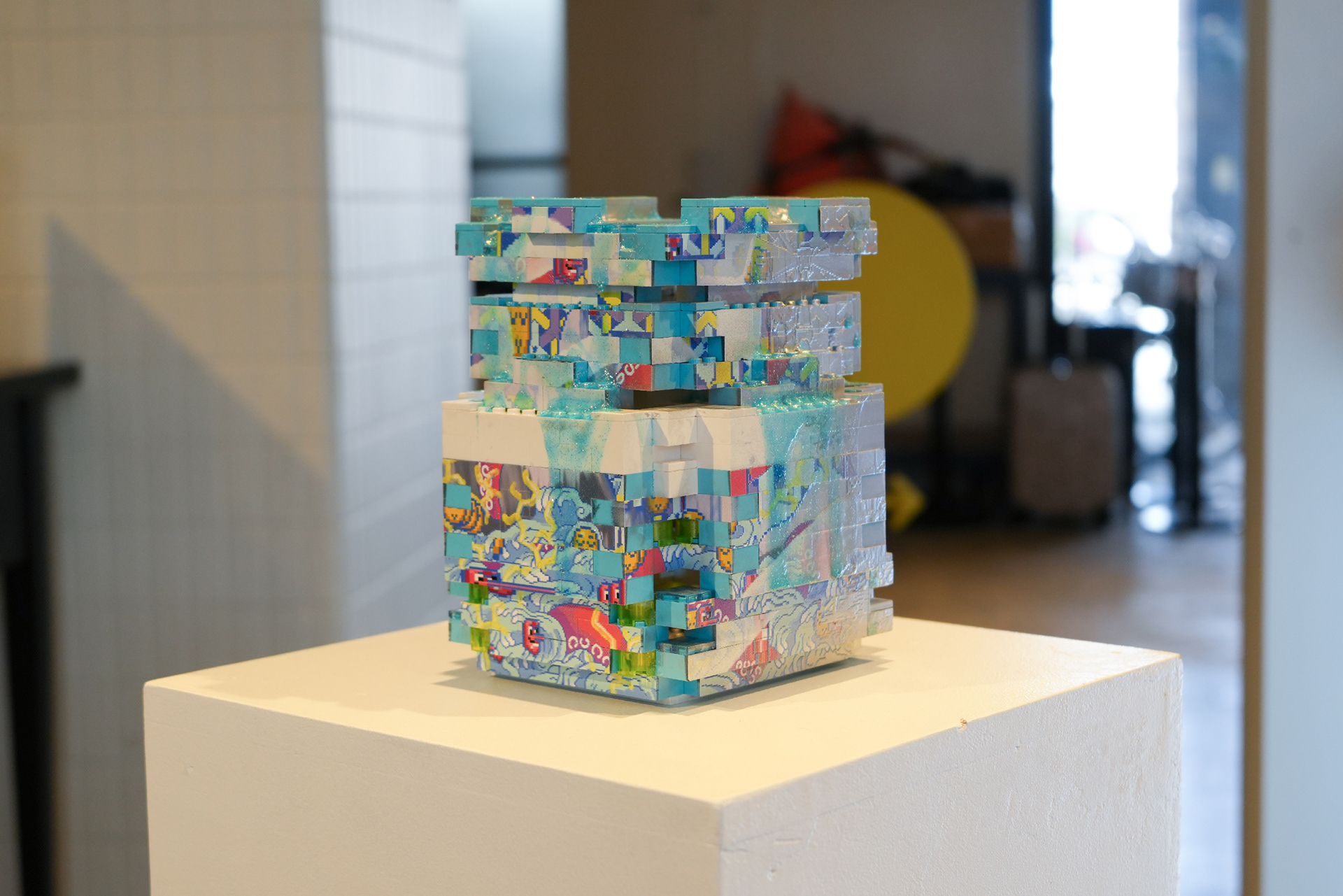 Vase of Possibility Before Determination was exhibited in the 2023 group exhibition Authentic Artifacts. The series constructs three-dimensional vase forms by assembling blocks with UV output on their surfaces. During the exhibition, the work was deliberately destroyed by the artist, with the act of destruction projected from a small projector placed inside the vase. Once broken, the blocks can be fully restored simply by reassembling them in the same configuration — a reversibility that resonates with the nature of digital data.