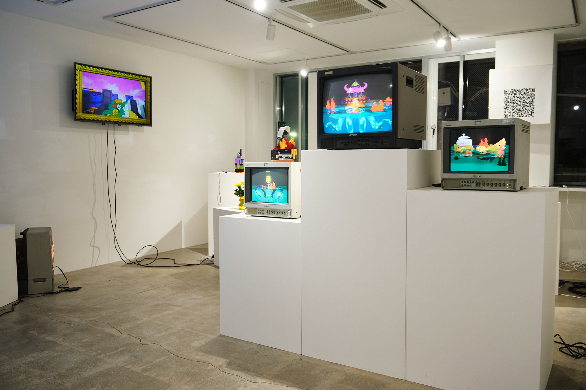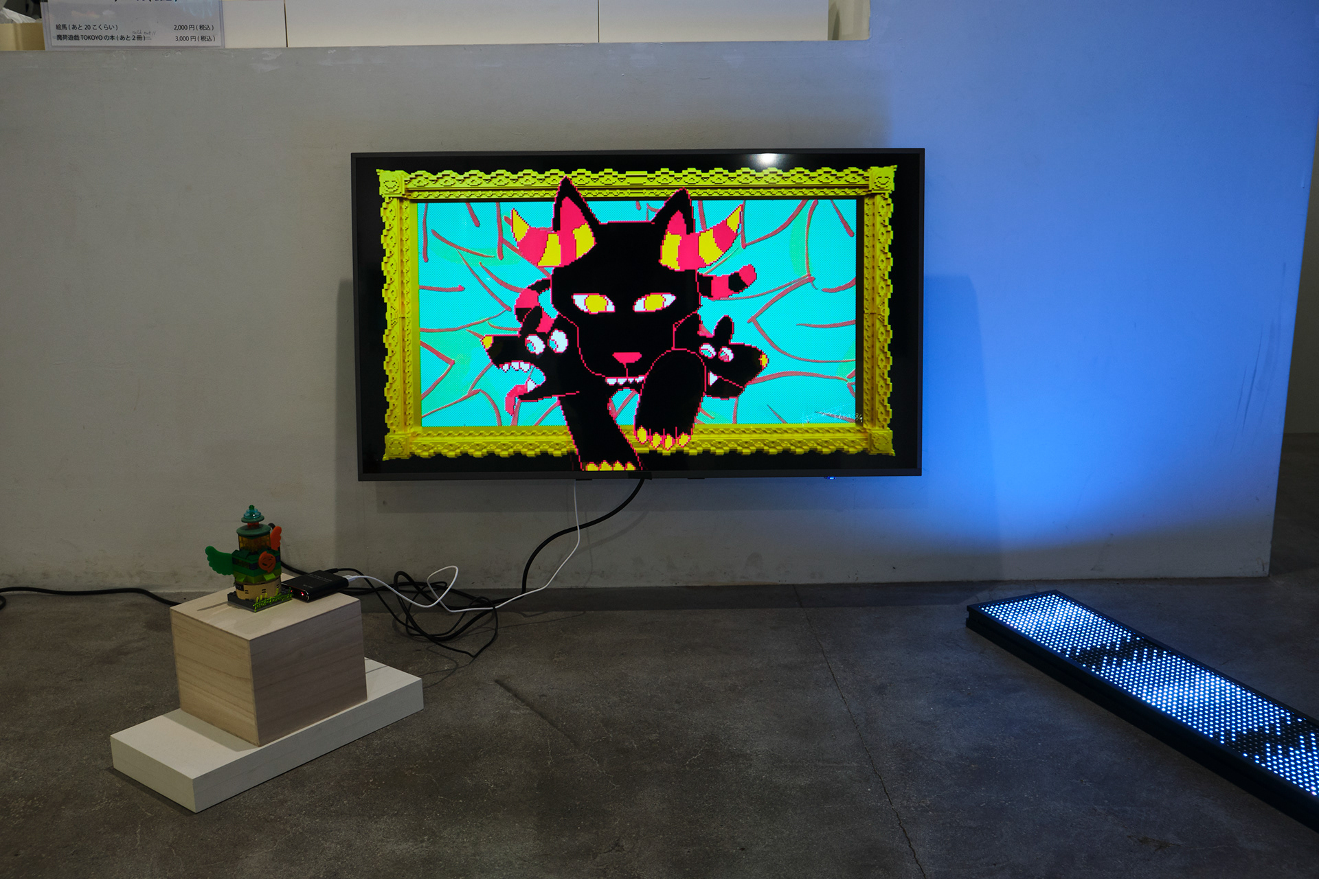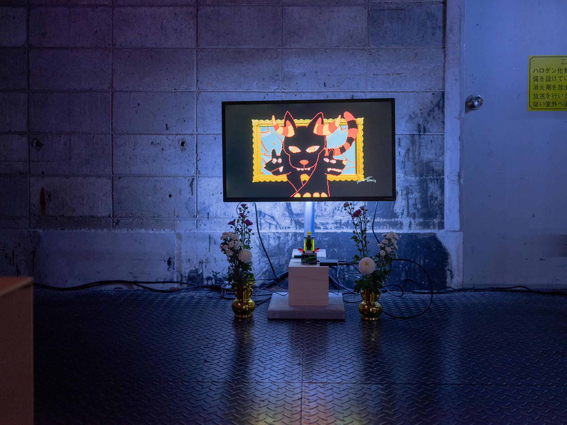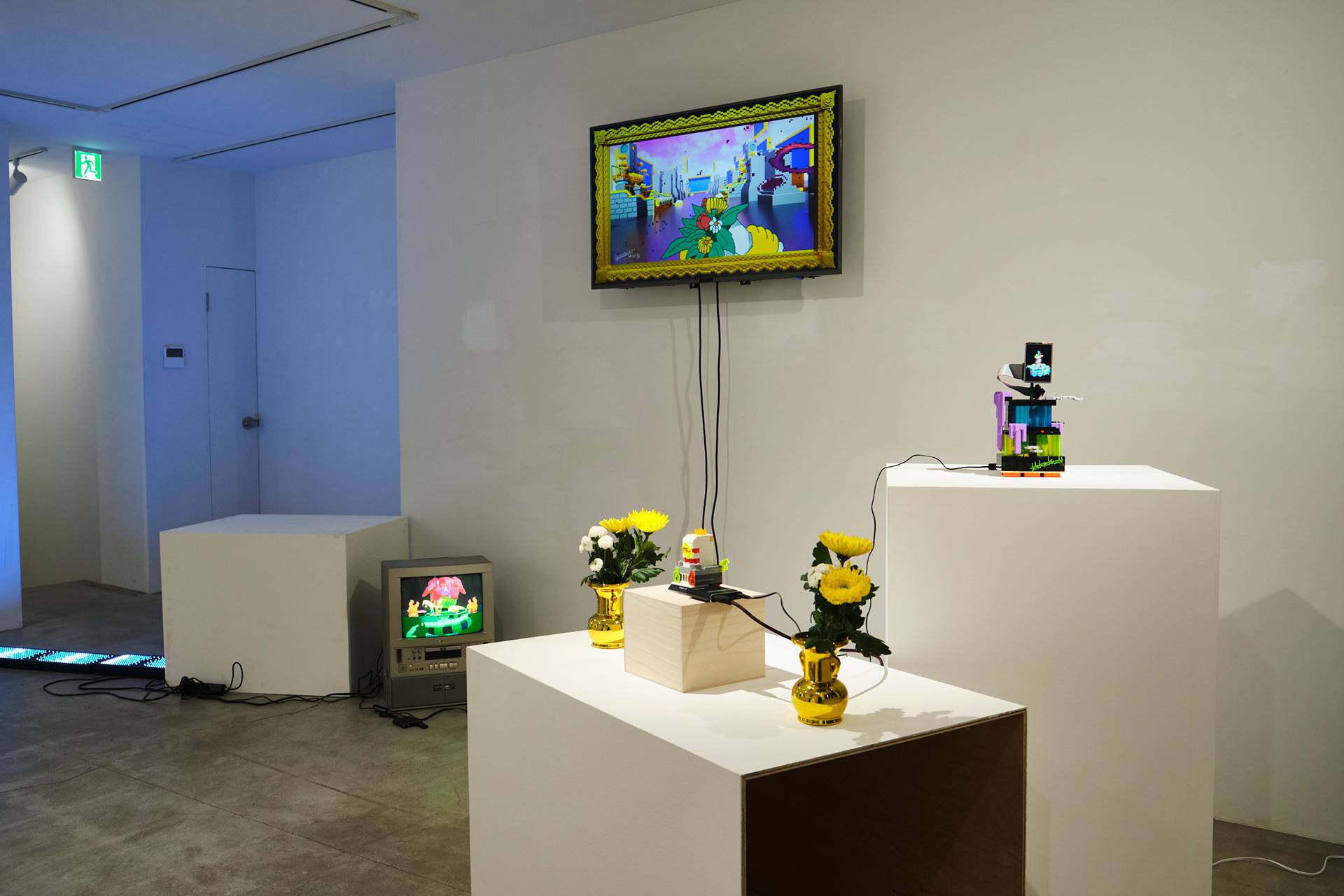 This exhibition presented new works including Virtual Fusion! Exodic TV Buddha YAKUSHI, in which multiple body parts—hands, feet, and head—are projected onto a SONY Trinitron CRT display; Hell Coaster, directly UV-printed onto a display; and Talking Shoes, a collaboration with ABC-MART featuring a pair of shoes engaging in dialogue.
