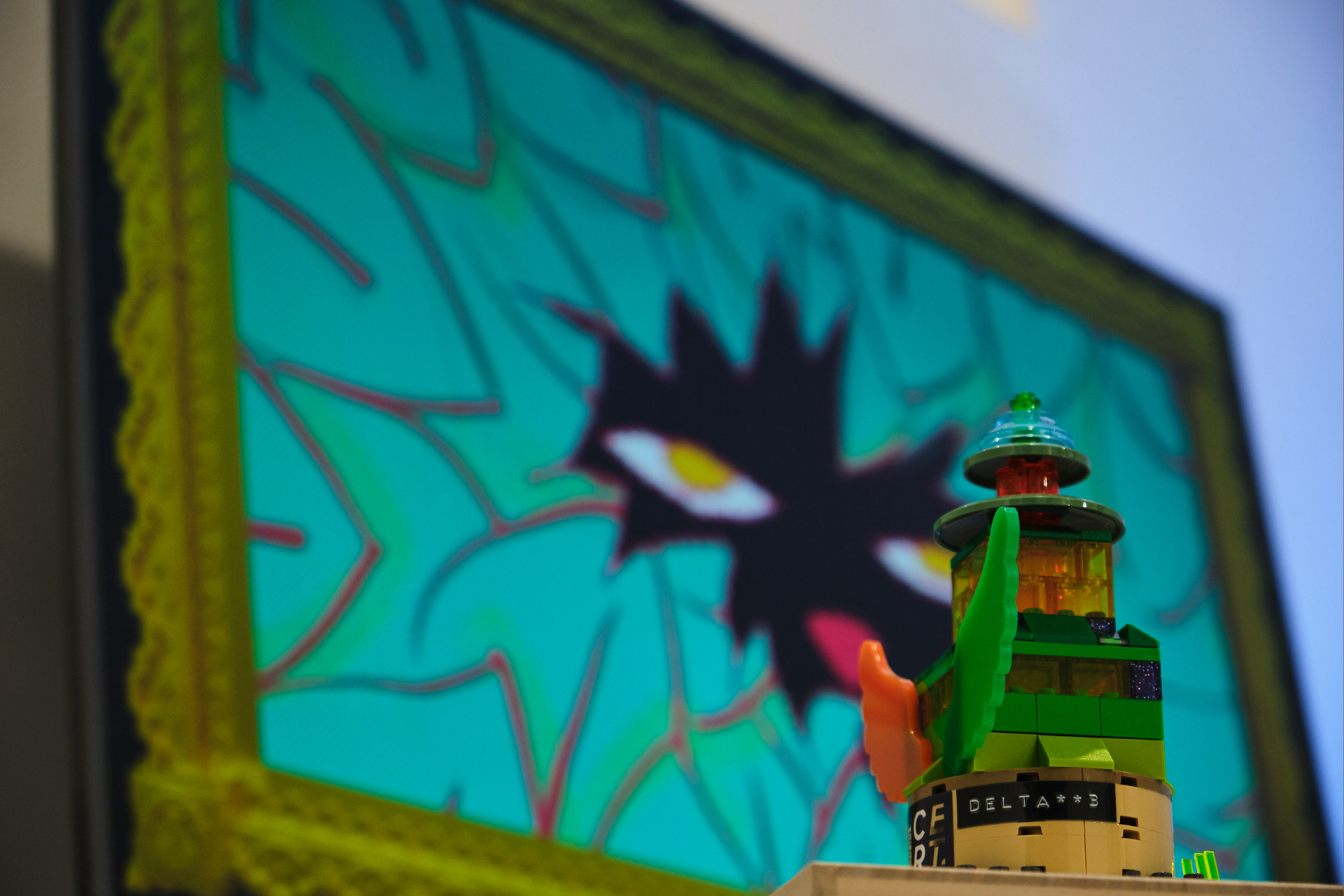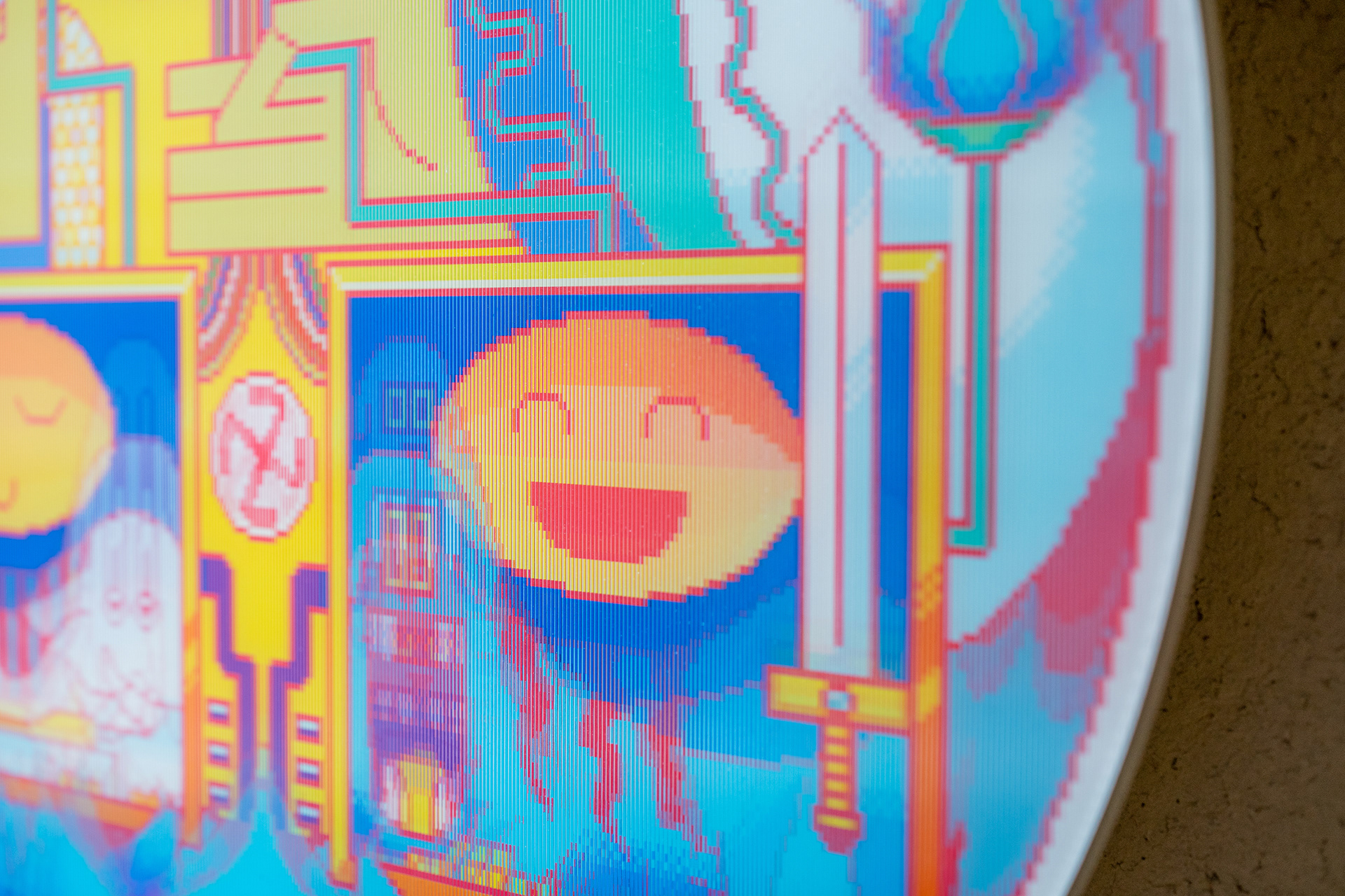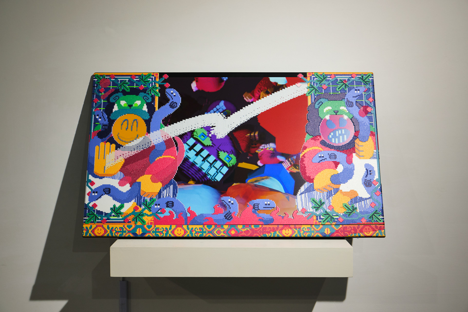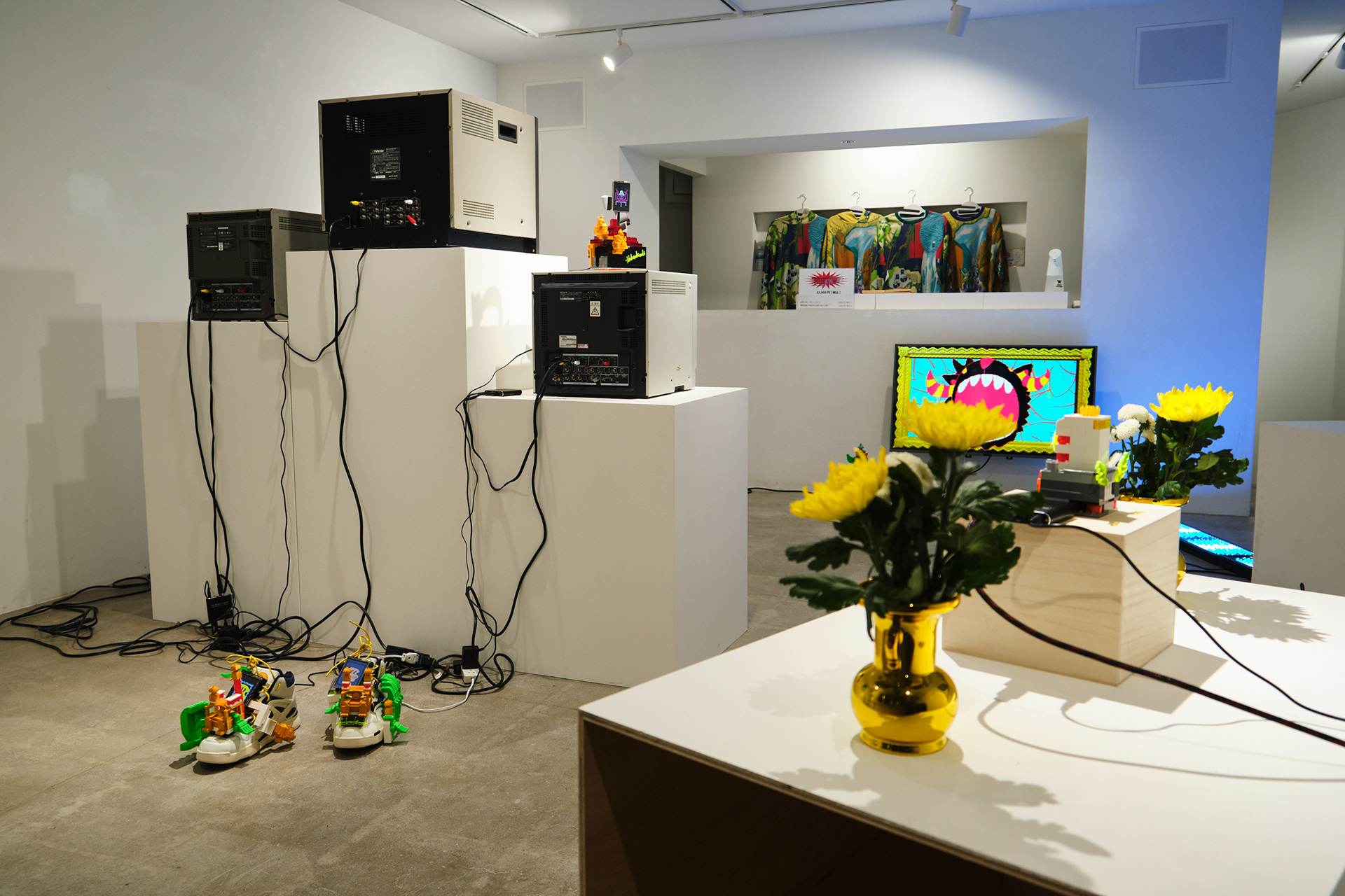 This exhibition presented new works including Virtual Fusion! Exodic TV Buddha YAKUSHI, in which multiple body parts—hands, feet, and head—are projected onto a SONY Trinitron CRT display; Hell Coaster, directly UV-printed onto a display; and Talking Shoes, a collaboration with ABC-MART featuring a pair of shoes engaging in dialogue.