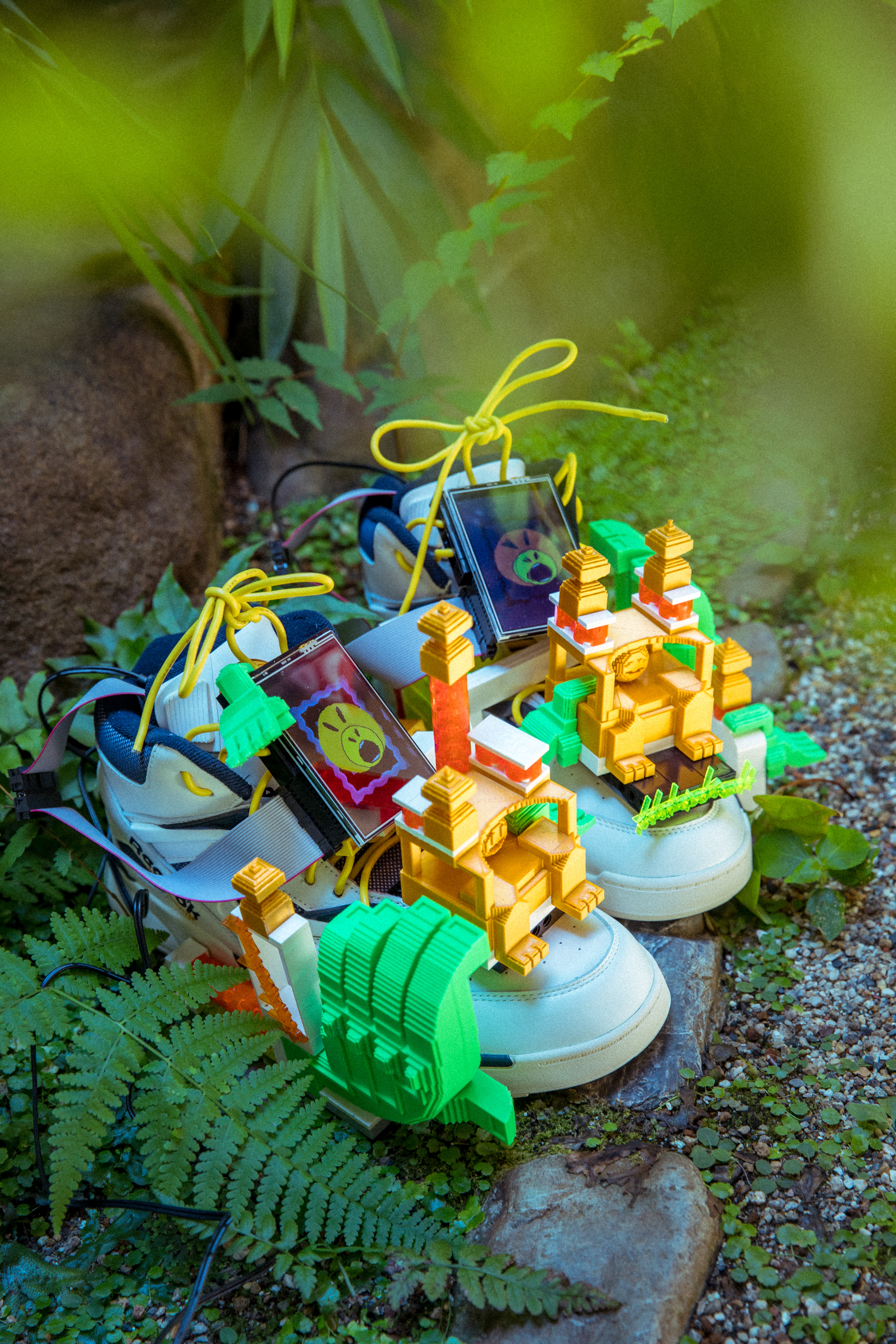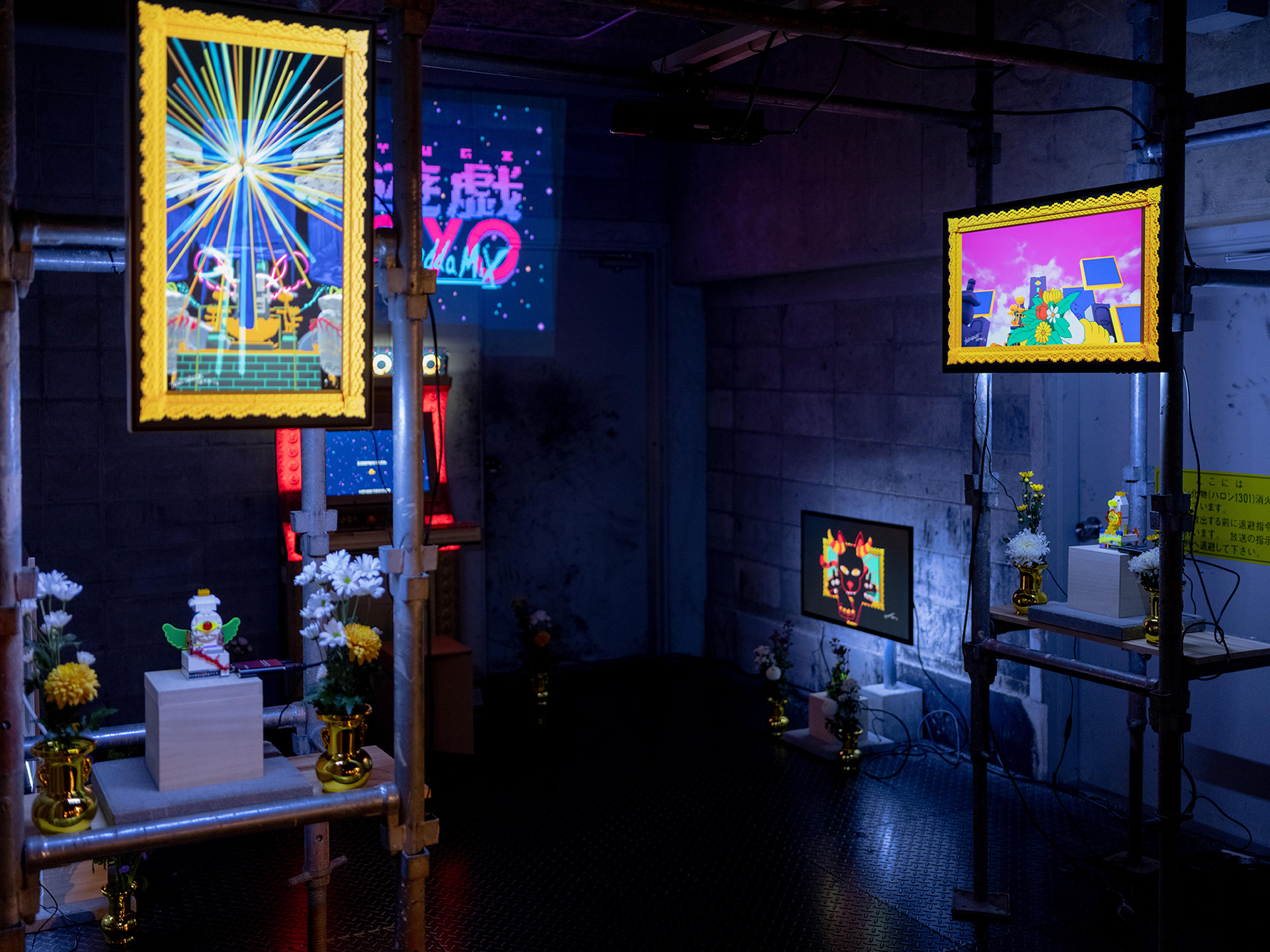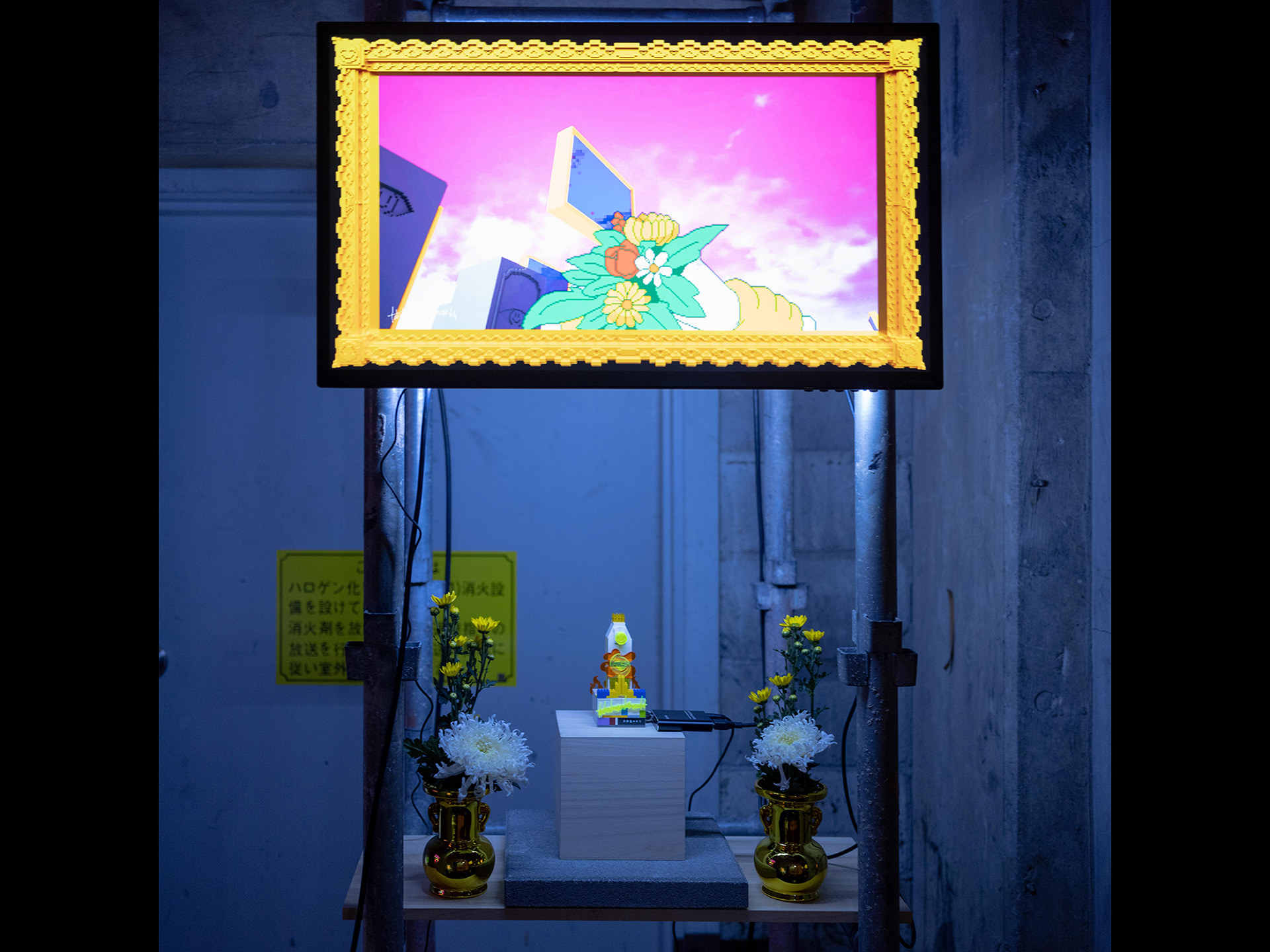 オンラインとオフラインを横断しながら更新を重ねてきた「アプデ輪廻」シリーズの最終展示。本展では、SONYのトリニトロンブラウン管に手・足・頭など複数のパーツが投影される《Virtual Fusion! Exodic TV Buddha YAKUSHI》、ディスプレイにUV直接出力を施した《ヘルコースター》、ABCマートとのコラボレーションで制作した、二足の靴が対話する《Talking Shoes》などの新作が発表された。シリーズの集大成として、東京と京都の移動、コロナ禍における感染者数の推移、株価の変動など、画面上で上下するグラフと、現実世界における都市と地方の隔たりを重ね合わせ、新たなテーマとして取り込んでいる。本作では、デジタルとアナログ、魂と肉体、此岸と彼岸といった複数の「境界」をめぐる問いを、さらに深める試みが行われた。