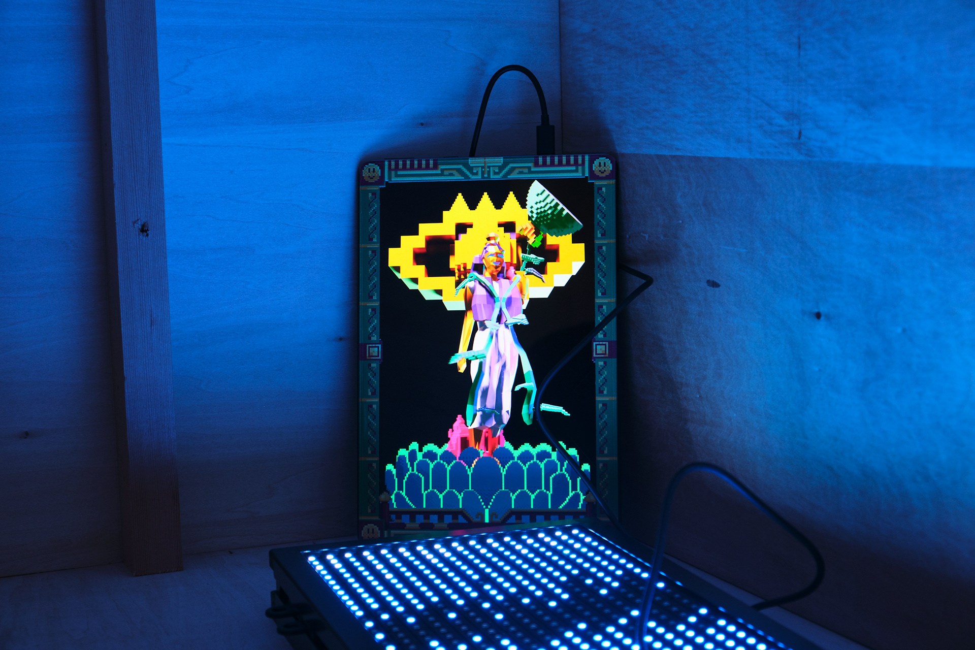 本作では、墓をハードウェア、魂をソフトウェアに置き換えることで、信仰や霊魂とデジタルデータの関係性を扱う作品群を発表した。「Hardware Tomb」シリーズは、ブロック状の墓を模したUSB記憶装置とメディアプレイヤーを直接接続し、内部に保存された映像データをディスプレイ上でリアルタイムに再生するインスタレーションである。同時に、ブロックチェーン技術を用いることで、データとその物理的容器の対応関係を証明する構造を持つ。