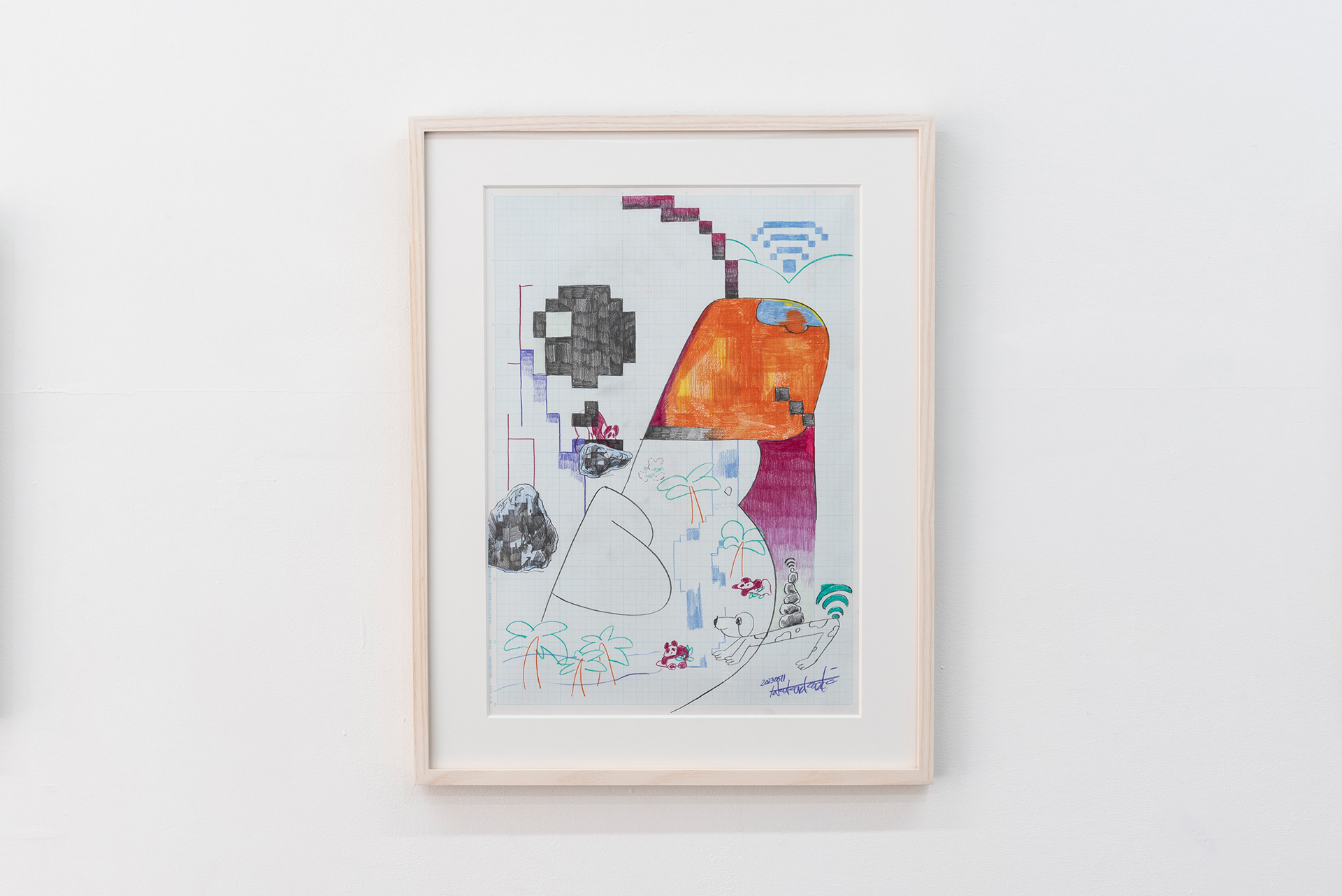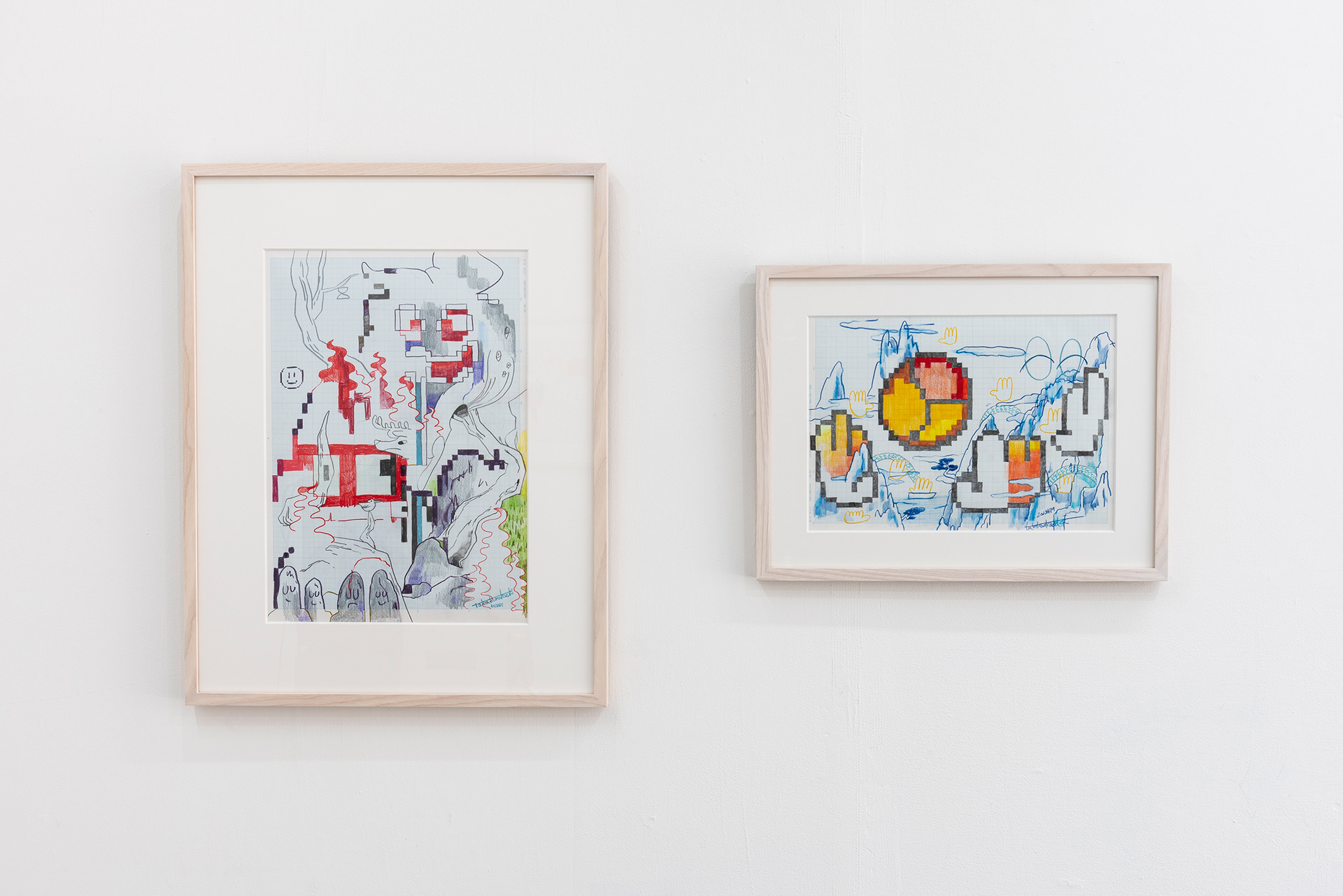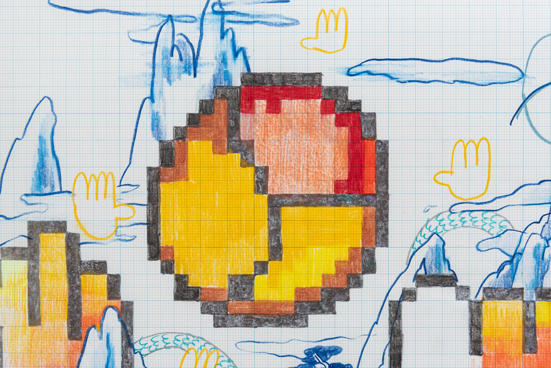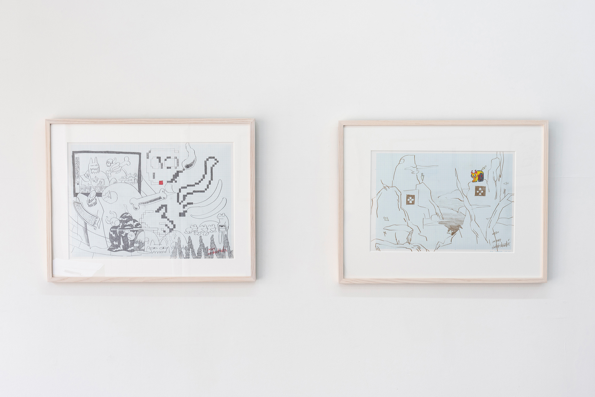 This exhibition marks the first solo exhibition by Takakurakazuki composed exclusively of drawings. The exhibited works were created by selecting motifs from an archive of yōkai generated collaboratively by viewers and AI in AI Yokai Summoning Ritual, and rendering them as colored-pencil drawings on drafting grid paper. This method of production is rooted in the early history of video games, when pixel art was designed through drawings made on grid paper. The exhibition title, Good Night, the Leftovers of Our Dreams, is constructed as a following verse (7–7) to AI Yokai Summoning Ritual (5–7–5), positioning the exhibition as a single, continuous poetic structure.