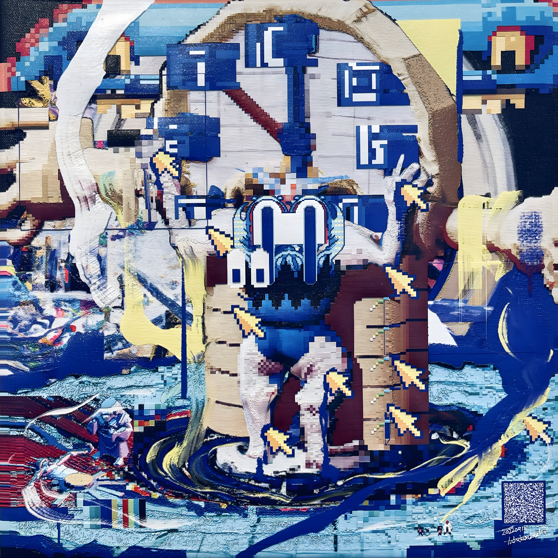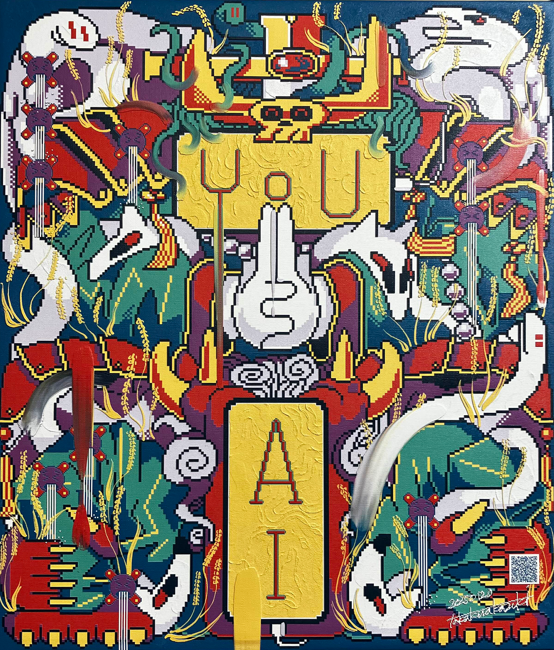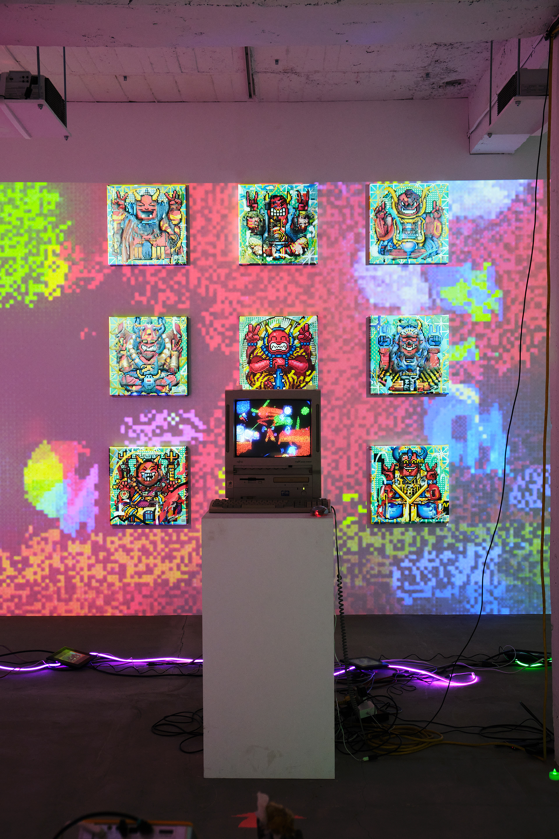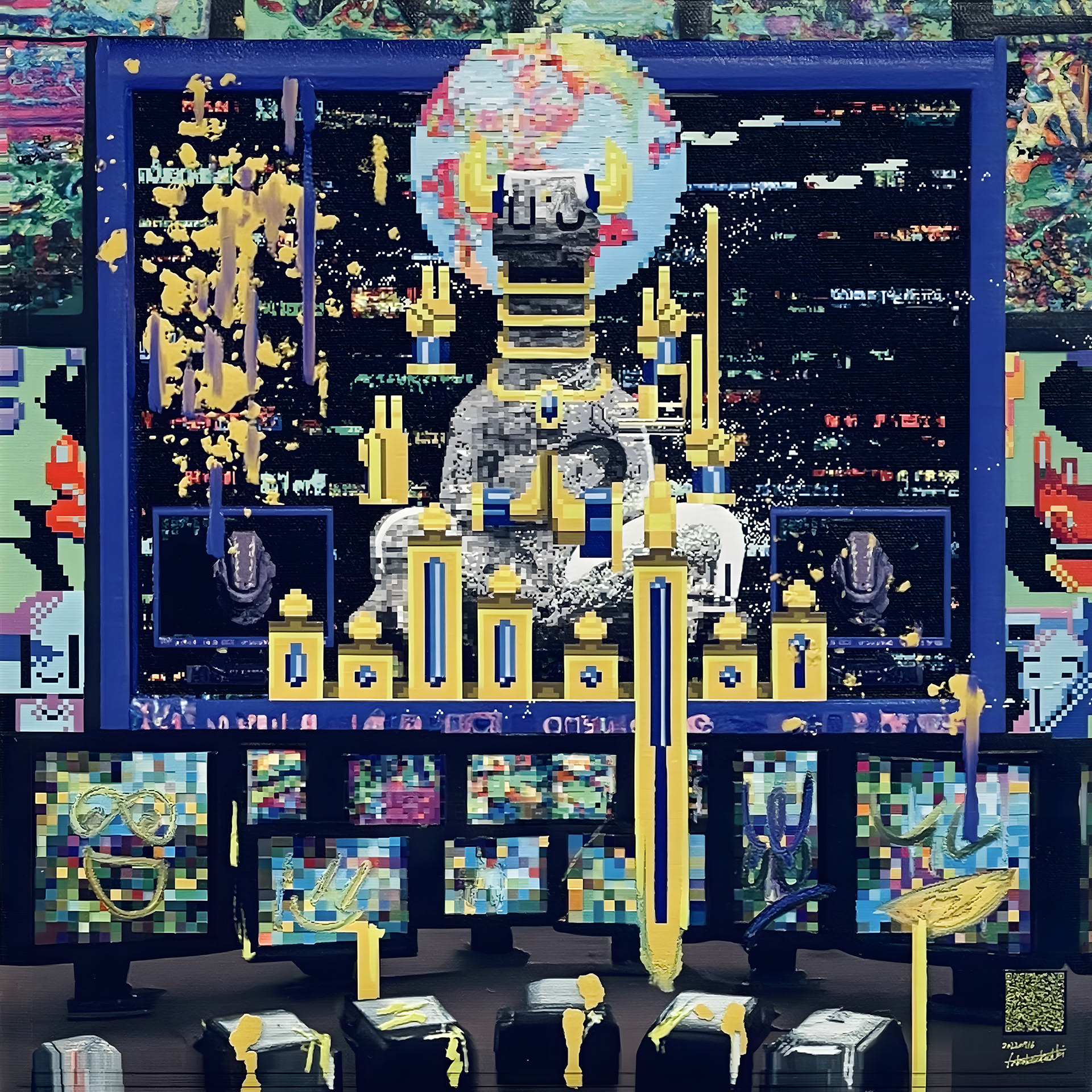 NEW YOKAI PAINTINGは、たかくらがプロンプトとして妖怪を想起する詩を制作し、そのテキストをAIに複数回読み込ませ、生成されたイメージにドット絵による加筆を行って制作されたキャンバスシリーズである。本シリーズは《AI Yokai Summoning Ritual》の発展形として位置づけられ、たかくら自身が詩を書く行為を制作の中心に据えている。制作過程では、AIがyokaiをghost、monster、phantomなどと翻訳してしまい、その独自の感触を十分に捉えられない点も重要なテーマとなった。言語変換や生成のズレを含めて、妖怪という概念が持つ曖昧さや翻訳不可能性を作品の一部として扱っている。