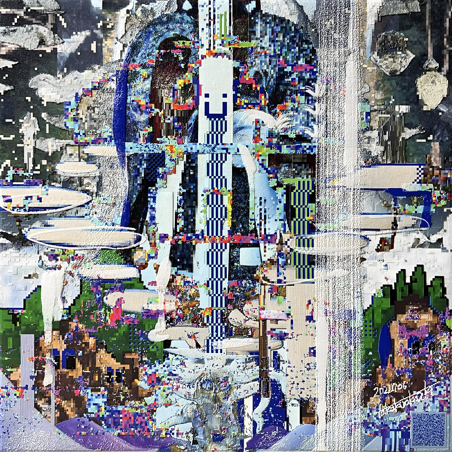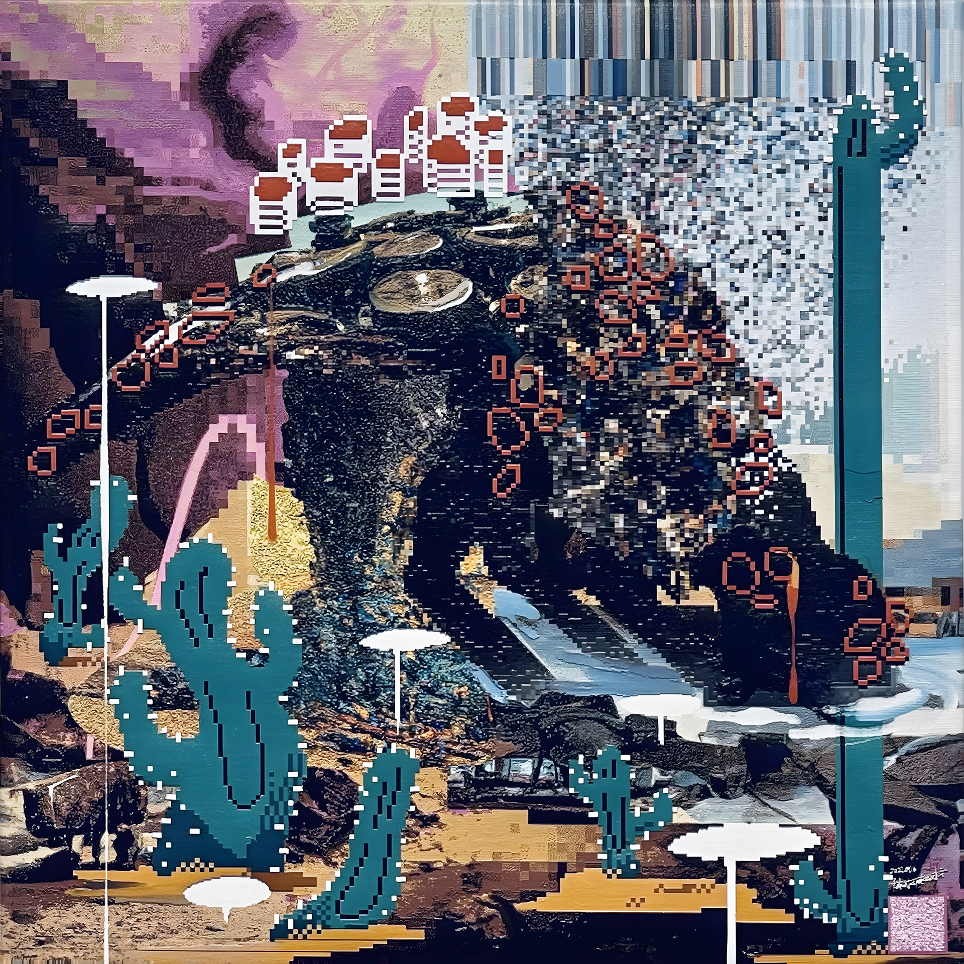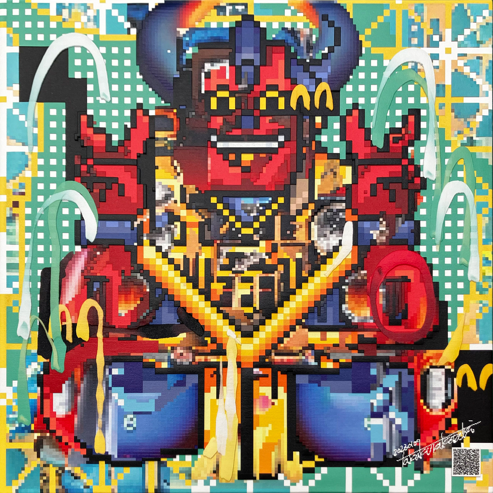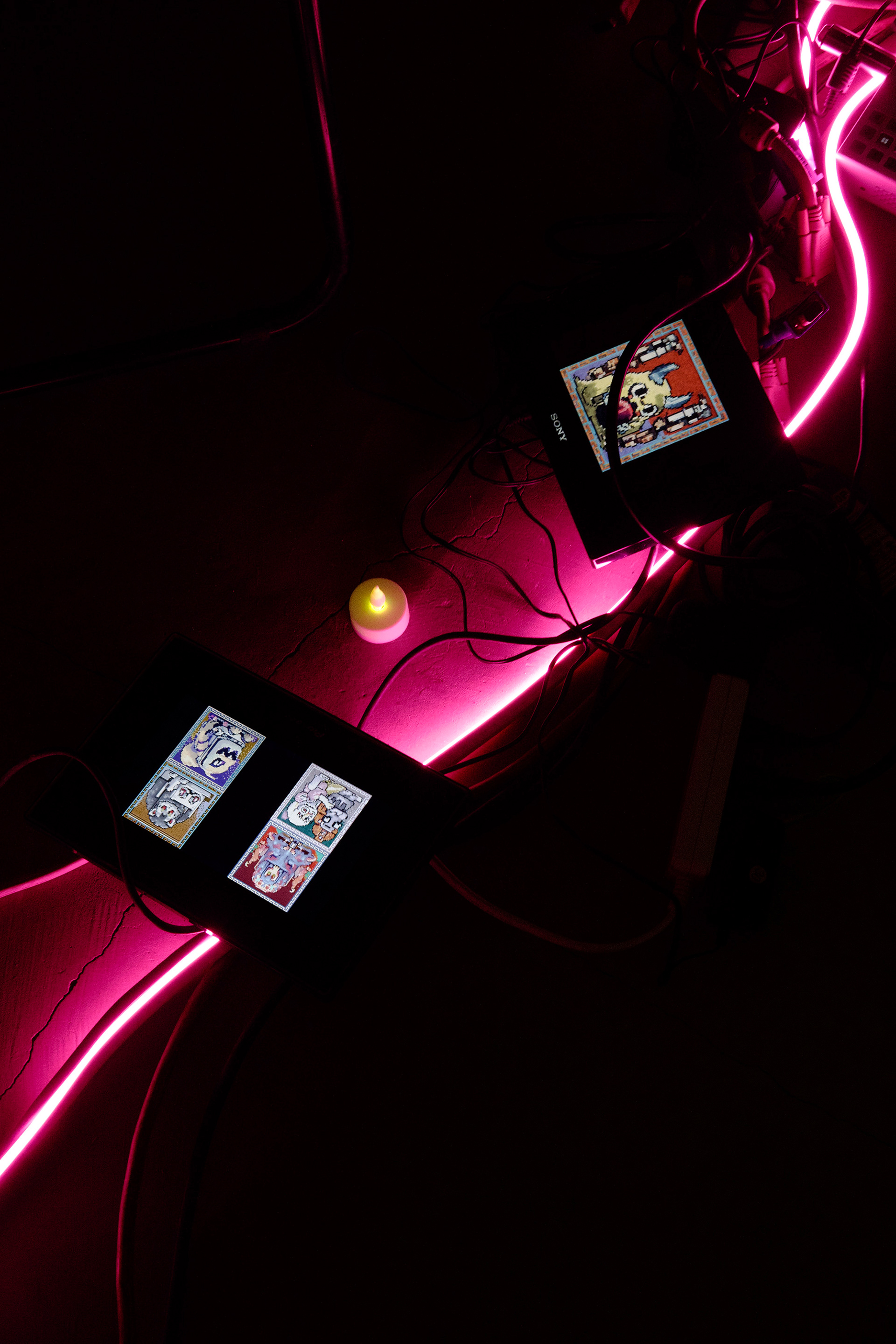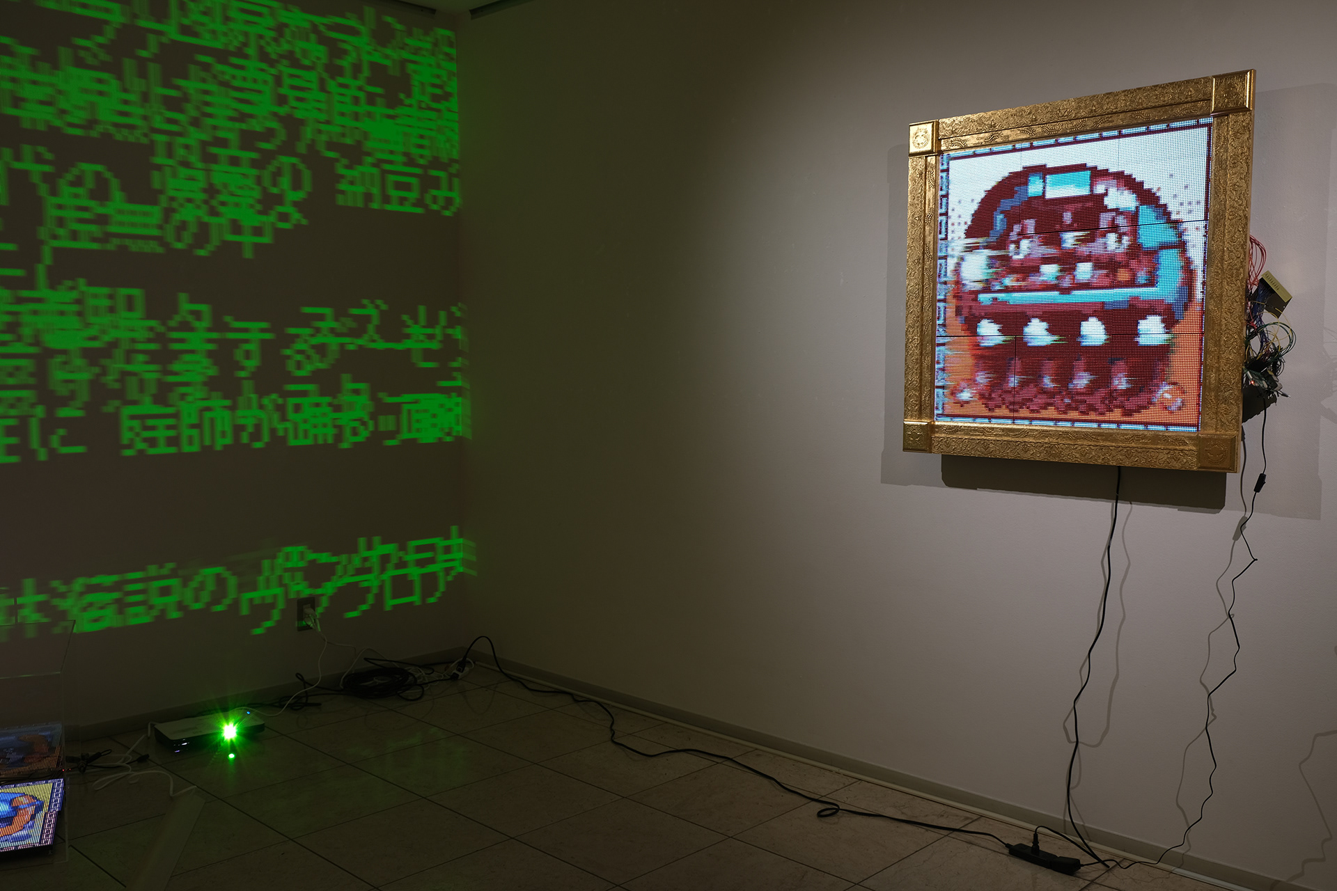 NEW YOKAI PAINTINGは、たかくらがプロンプトとして妖怪を想起する詩を制作し、そのテキストをAIに複数回読み込ませ、生成されたイメージにドット絵による加筆を行って制作されたキャンバスシリーズである。本シリーズは《AI Yokai Summoning Ritual》の発展形として位置づけられ、たかくら自身が詩を書く行為を制作の中心に据えている。制作過程では、AIがyokaiをghost、monster、phantomなどと翻訳してしまい、その独自の感触を十分に捉えられない点も重要なテーマとなった。言語変換や生成のズレを含めて、妖怪という概念が持つ曖昧さや翻訳不可能性を作品の一部として扱っている。