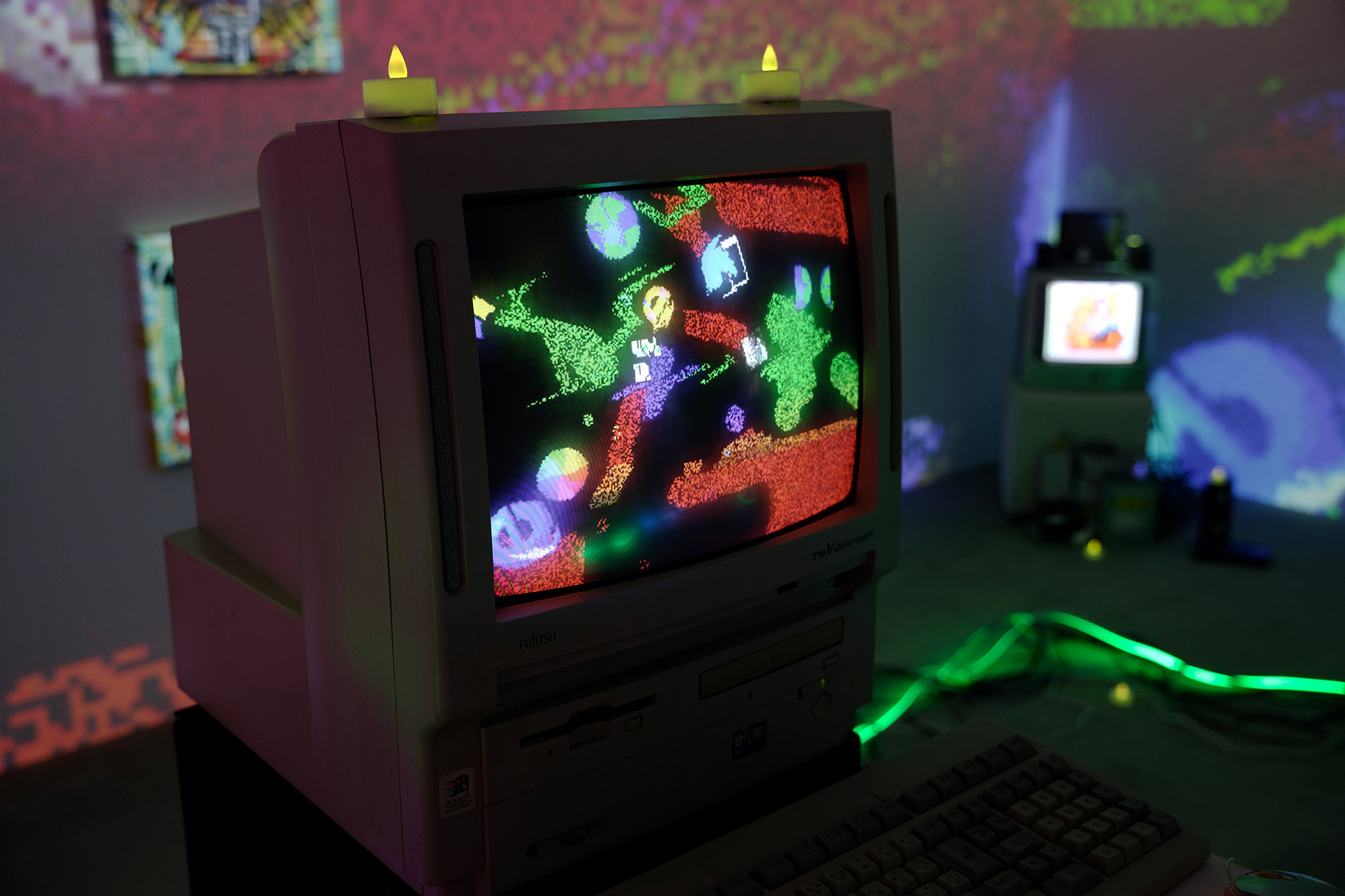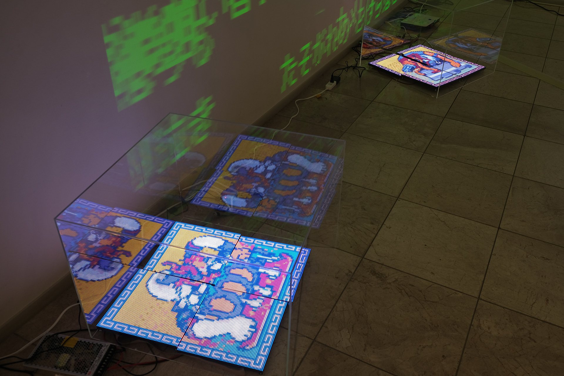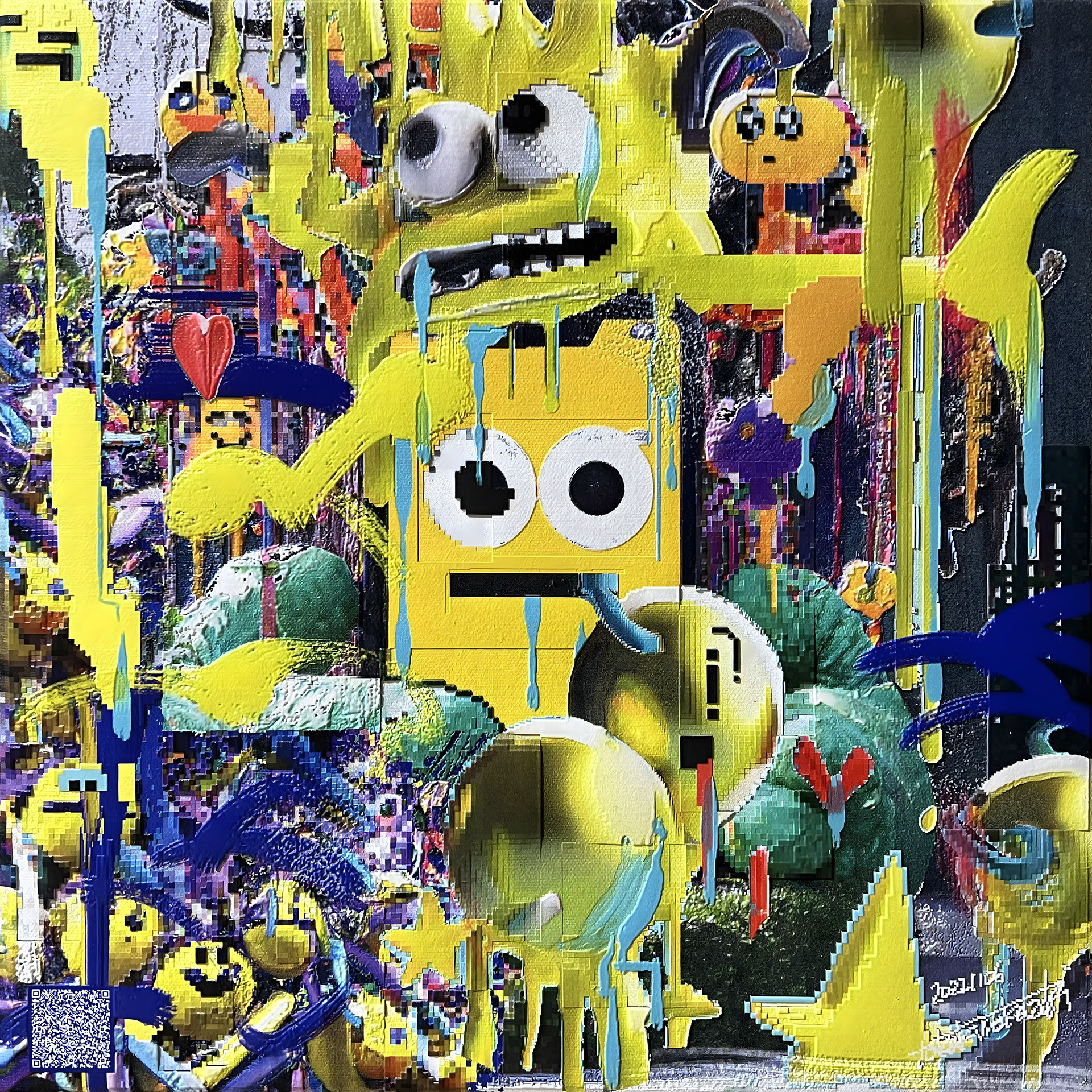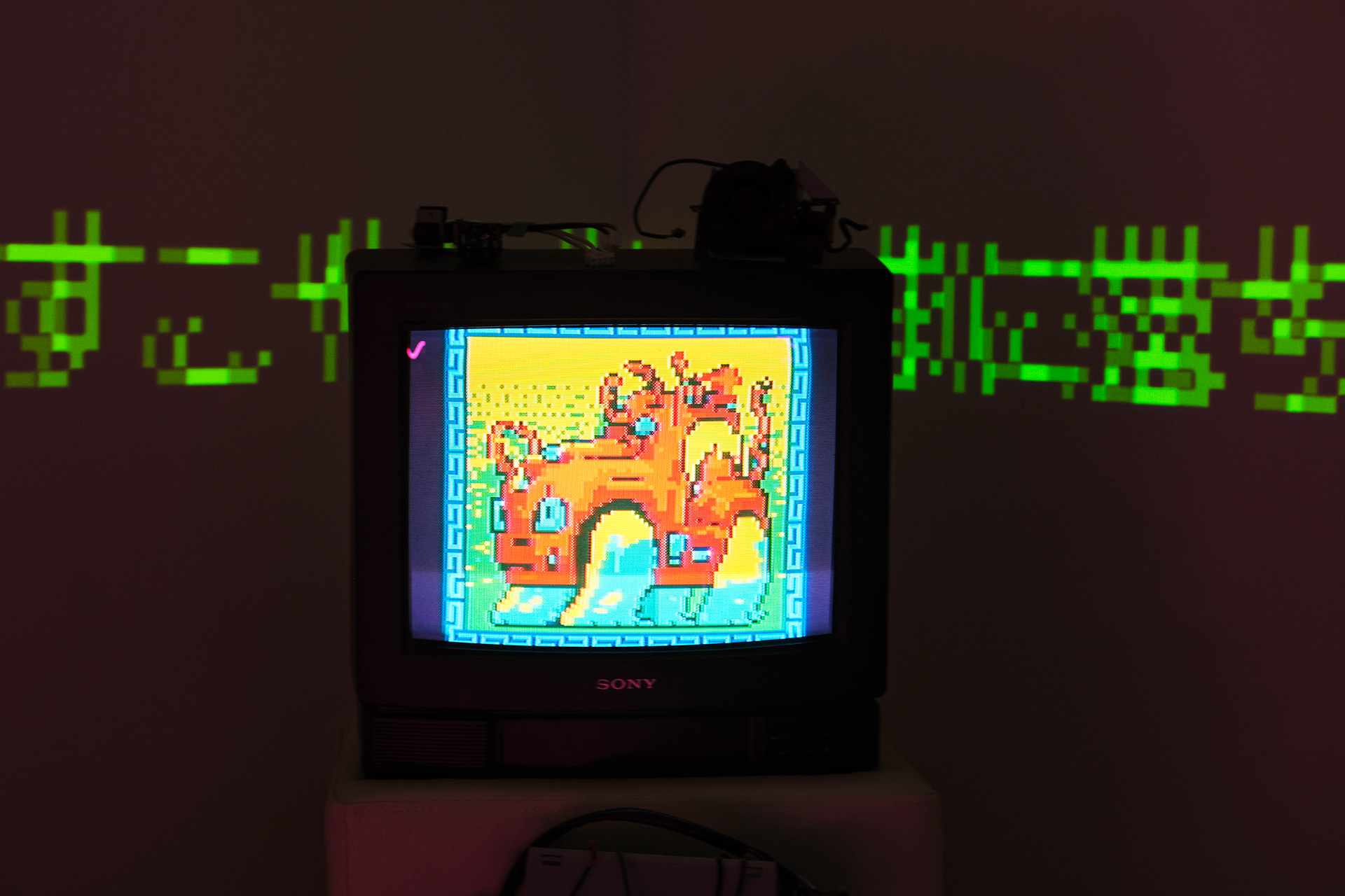 NEW YOKAI PAINTINGは、たかくらがプロンプトとして妖怪を想起する詩を制作し、そのテキストをAIに複数回読み込ませ、生成されたイメージにドット絵による加筆を行って制作されたキャンバスシリーズである。本シリーズは《AI Yokai Summoning Ritual》の発展形として位置づけられ、たかくら自身が詩を書く行為を制作の中心に据えている。制作過程では、AIがyokaiをghost、monster、phantomなどと翻訳してしまい、その独自の感触を十分に捉えられない点も重要なテーマとなった。言語変換や生成のズレを含めて、妖怪という概念が持つ曖昧さや翻訳不可能性を作品の一部として扱っている。