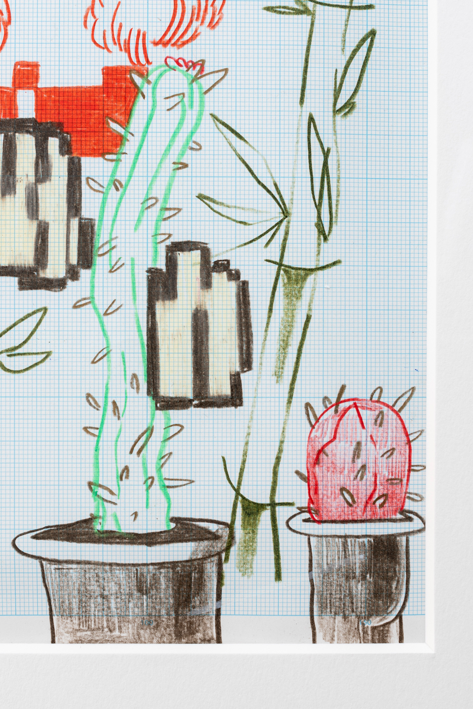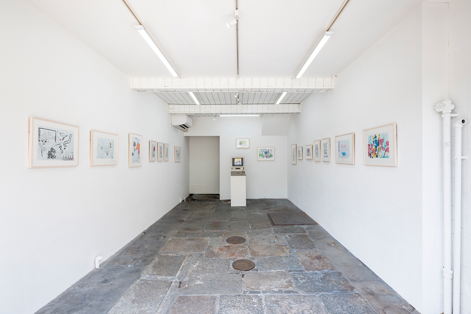 本展は、たかくらかずきの個展として初めて、ドローイングのみで構成された展示である。展示作品は、《みえるもの あらわれるもの いないもの》において、鑑賞者とAIによって生成された妖怪のアーカイブからモチーフを選び、製図用方眼紙に色鉛筆で描かれたドローイングによって制作された。この制作方法は、ビデオゲーム史の初期において、ドット絵が製図用方眼紙上のドローイングとして設計されていたことに由来している。展覧会タイトルの「おやすみ僕らの 夢の残飯」は、「みえるもの あらわれるもの いないもの」(5・7・5)に続く句(7・7)として構成されており、本展全体をひとつの連続した詩の構造として位置づけている。