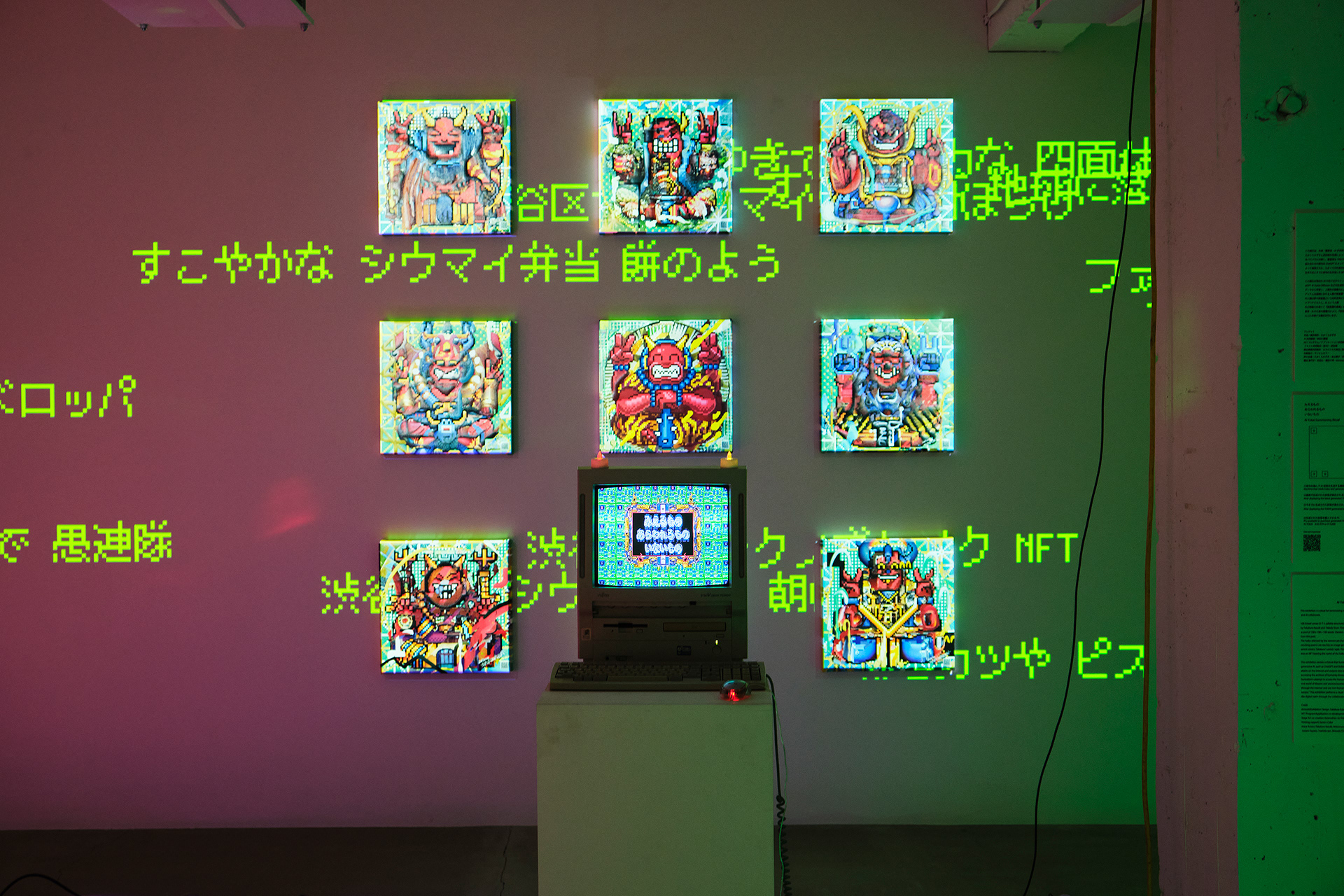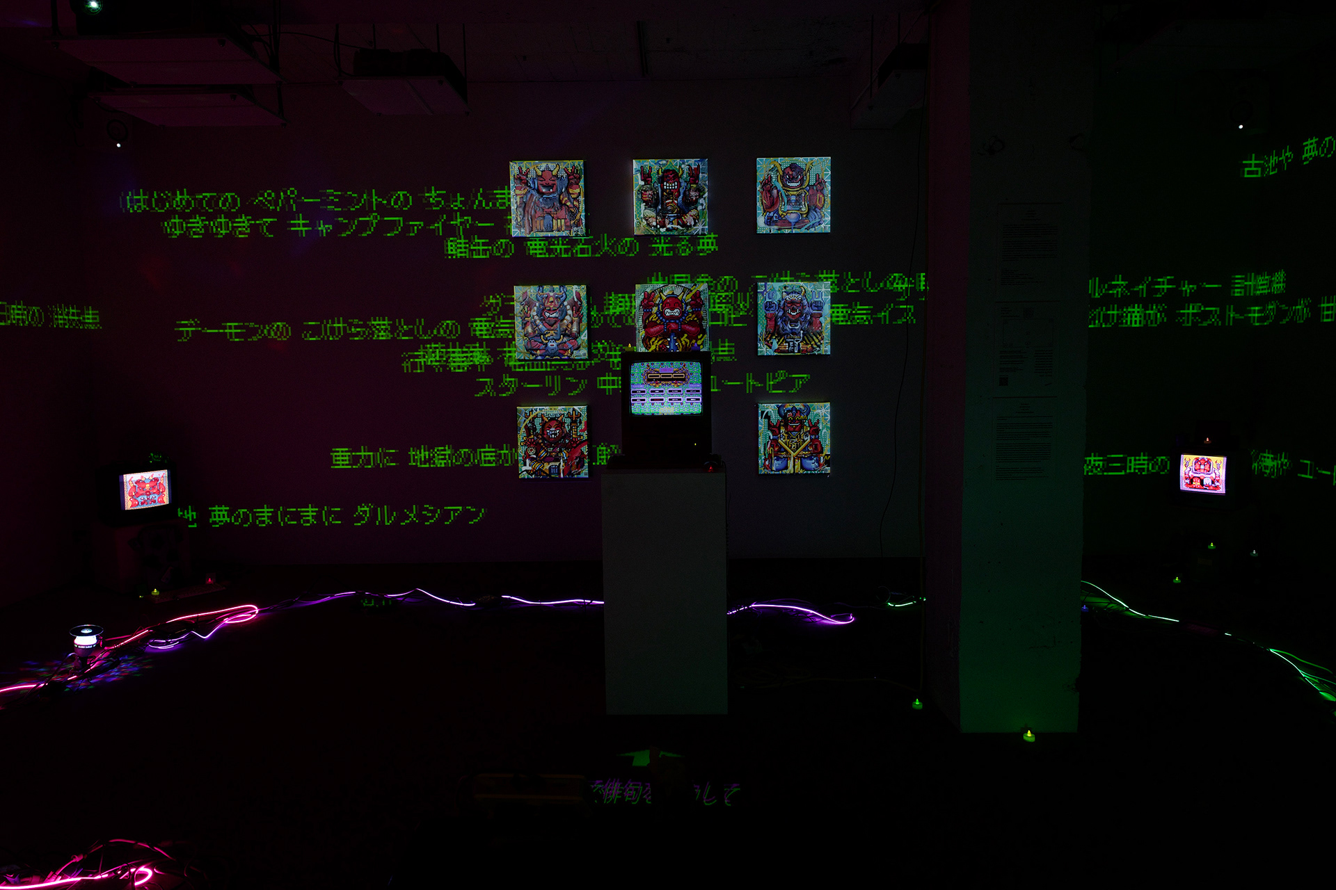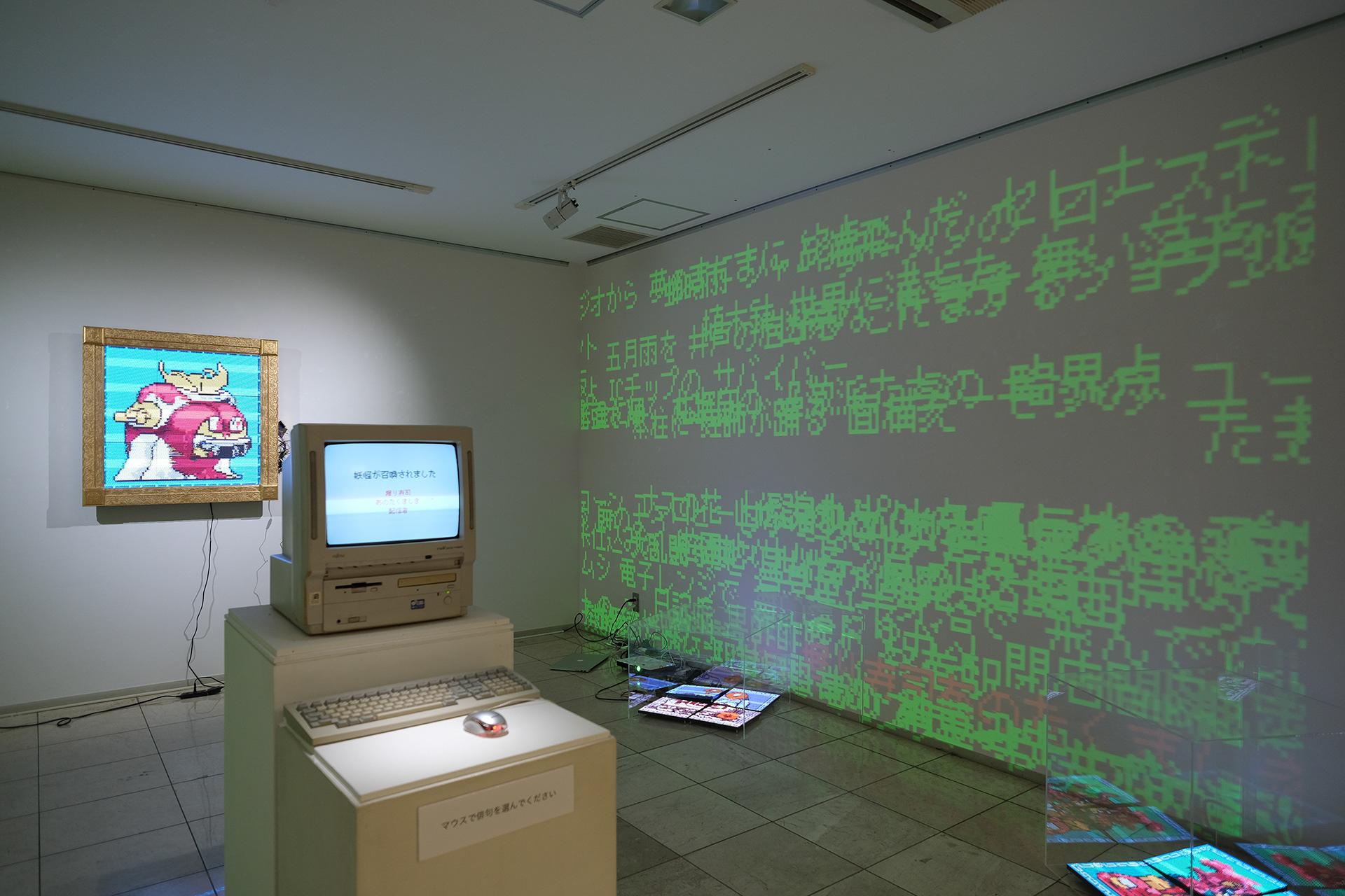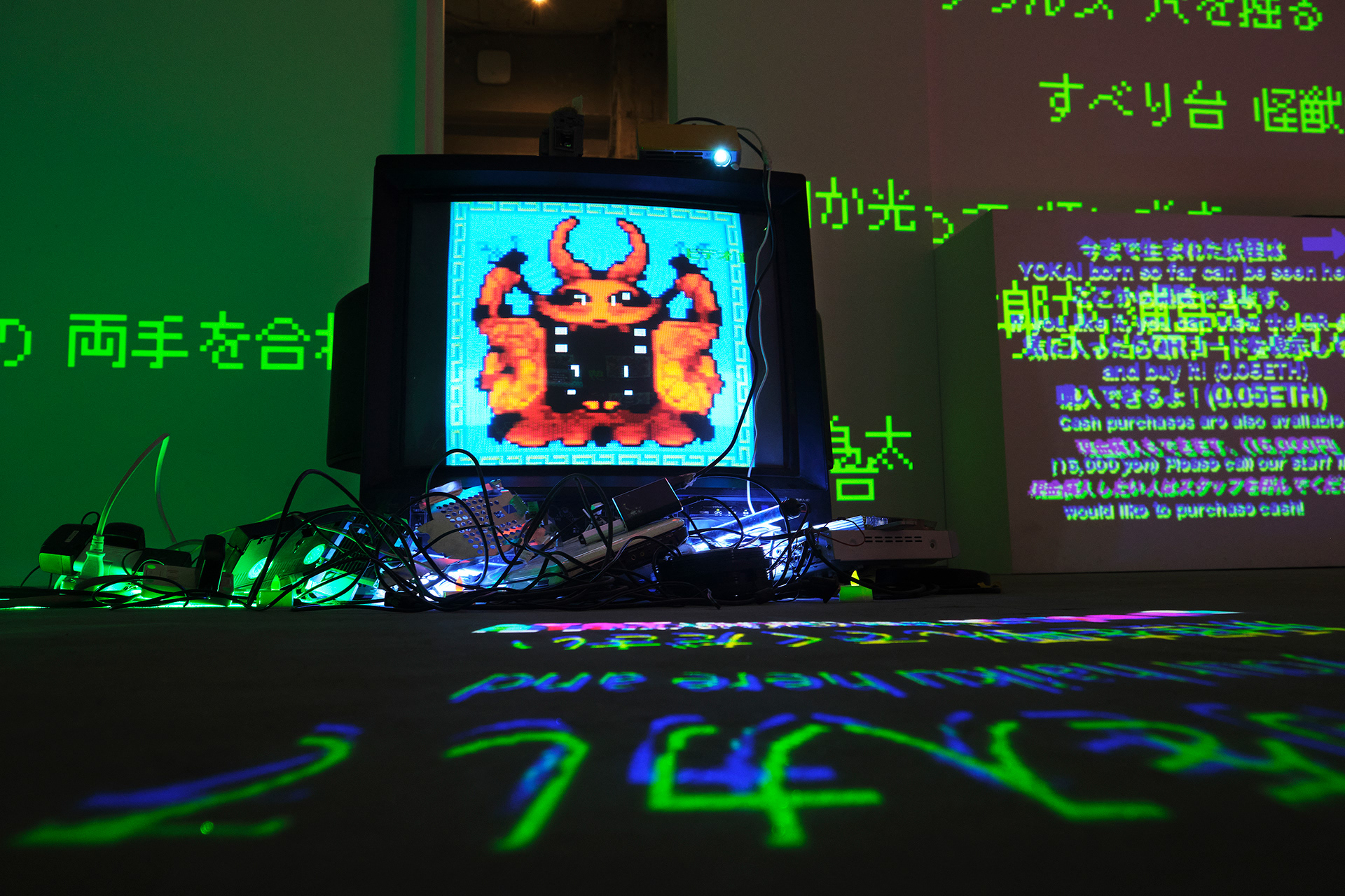 本展は、作者・鑑賞者・AIの三者で、ことばから新たな妖怪を生成する儀式としてのインスタレーションである。自動筆記的なプロセスによって制作された連句(5・7・5)を分解し、鑑賞者は108×108×108の語群から任意の俳句を再構成する。鑑賞者が選択した俳句は、生成AIによって50語の英詩へと変換され、その英詩を、たかくらの過去作品や作風を学習した画像生成AIが読み取り新たな妖怪のイメージを生成する。生成された妖怪は、俳句の名を冠したNFTとして即座にデジタル空間へ公開される。