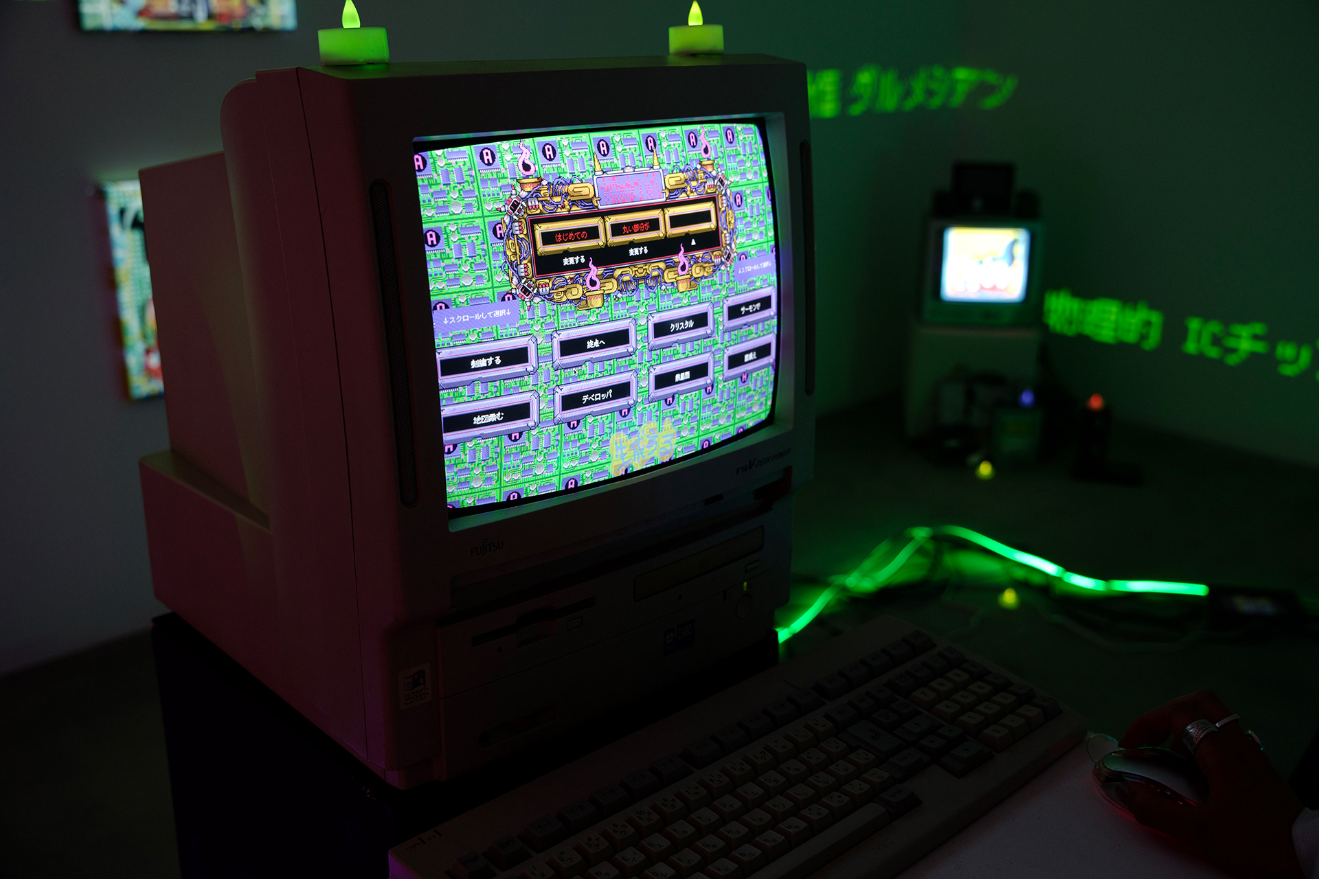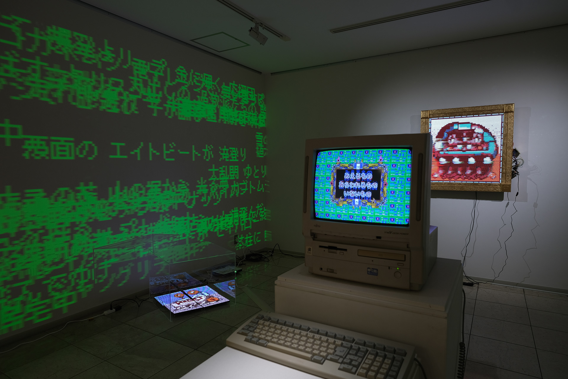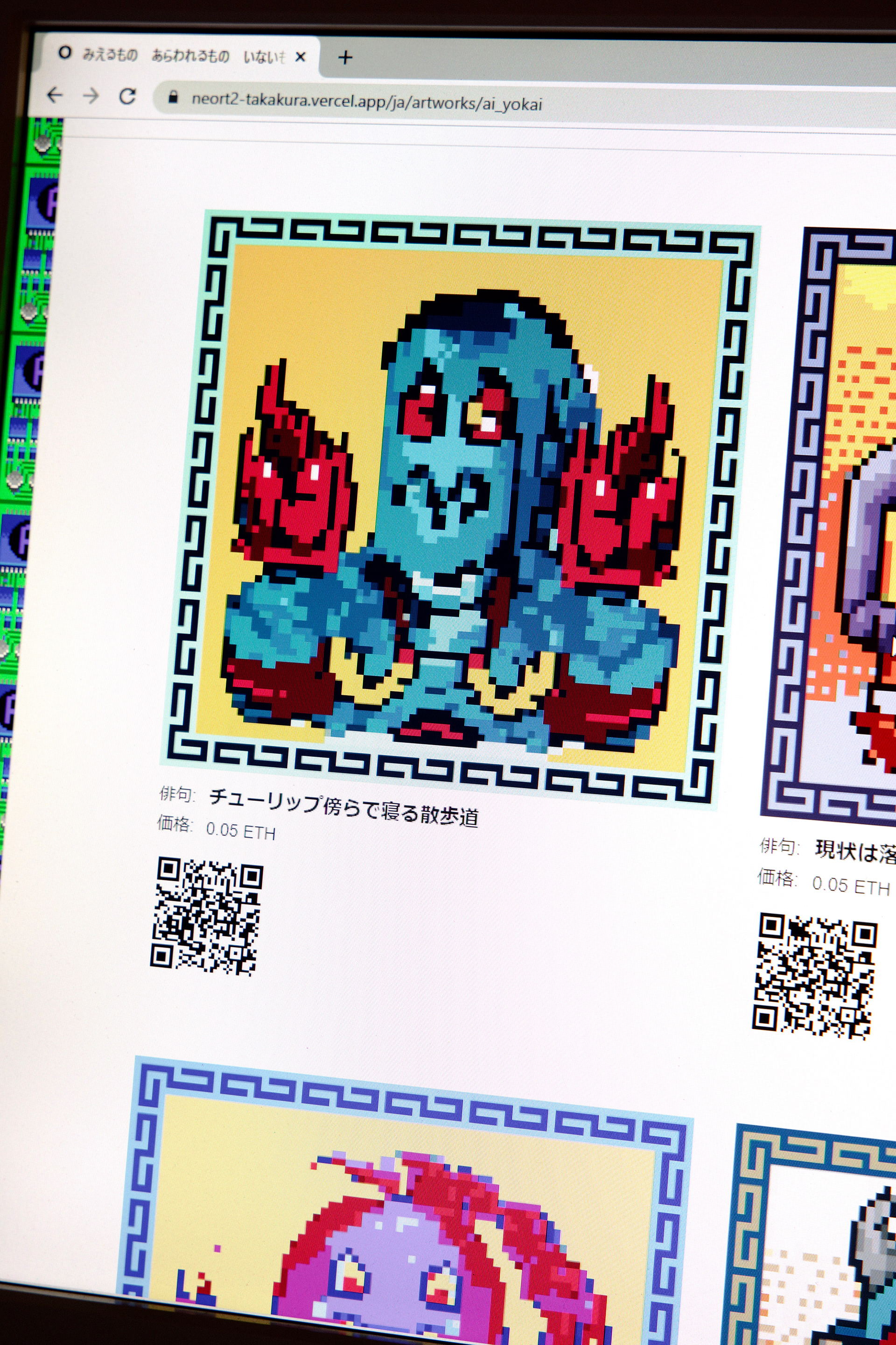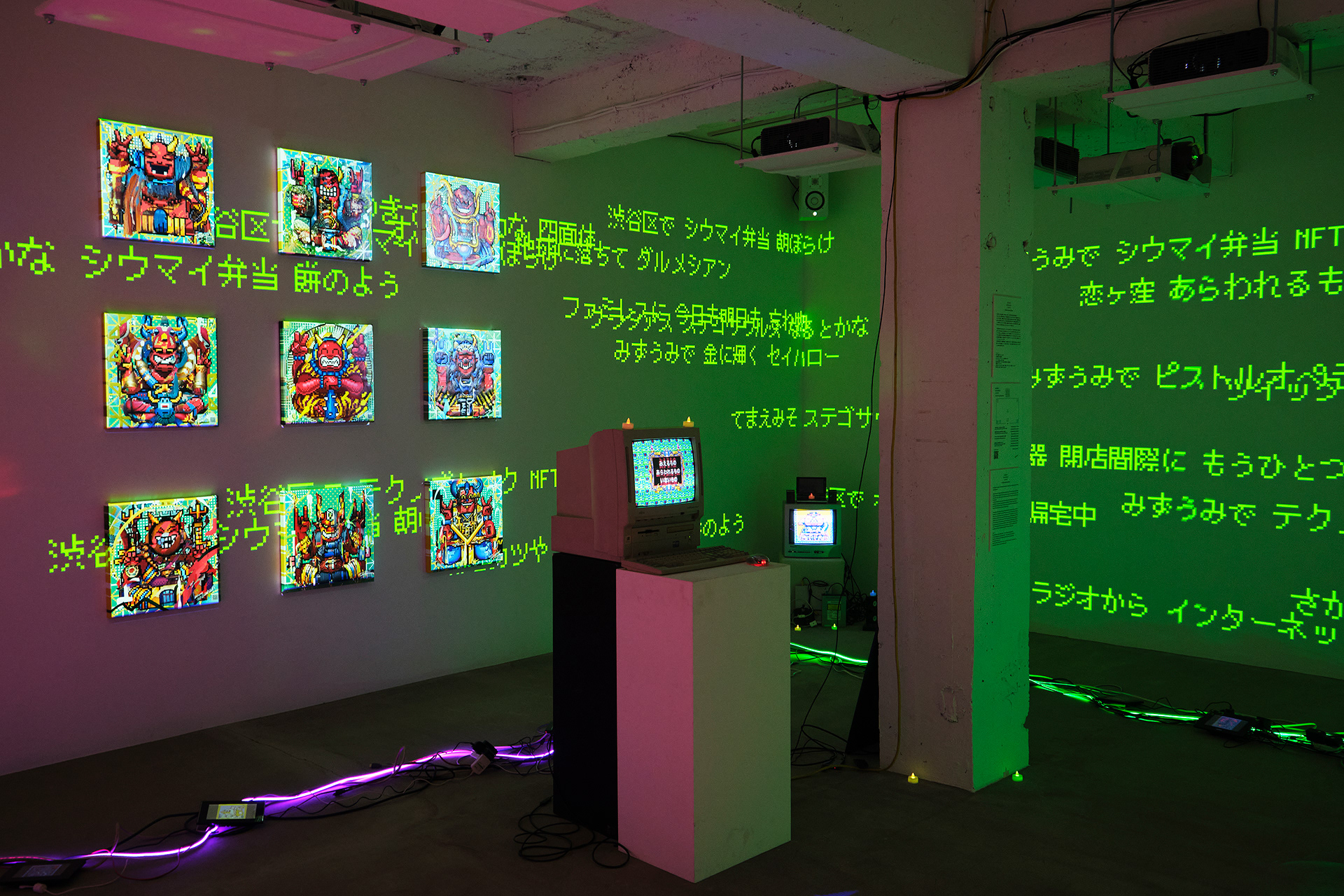本展は、作者・鑑賞者・AIの三者で、ことばから新たな妖怪を生成する儀式としてのインスタレーションである。自動筆記的なプロセスによって制作された連句(5・7・5)を分解し、鑑賞者は108×108×108の語群から任意の俳句を再構成する。鑑賞者が選択した俳句は、生成AIによって50語の英詩へと変換され、その英詩を、たかくらの過去作品や作風を学習した画像生成AIが読み取り新たな妖怪のイメージを生成する。生成された妖怪は、俳句の名を冠したNFTとして即座にデジタル空間へ公開される。