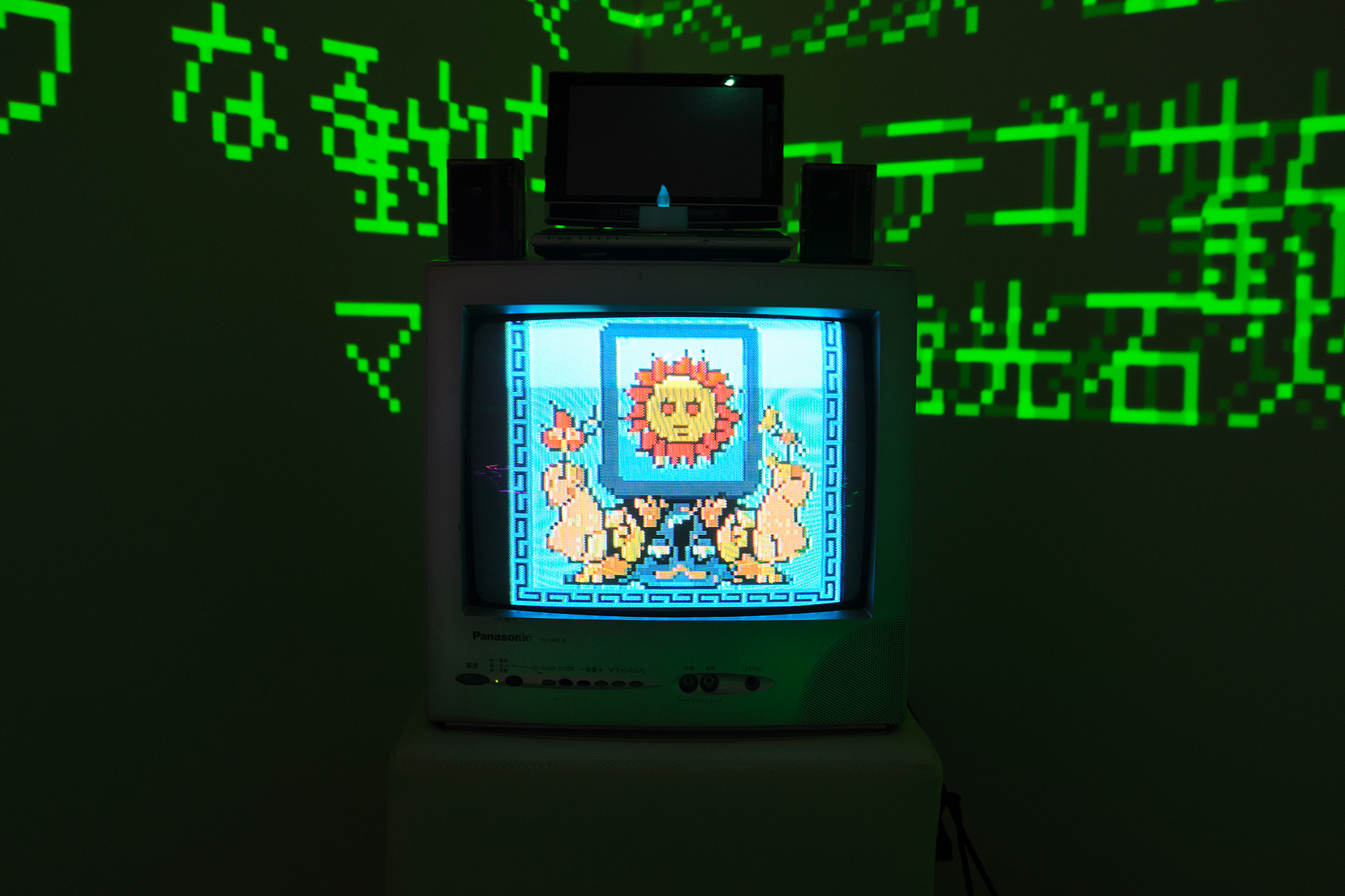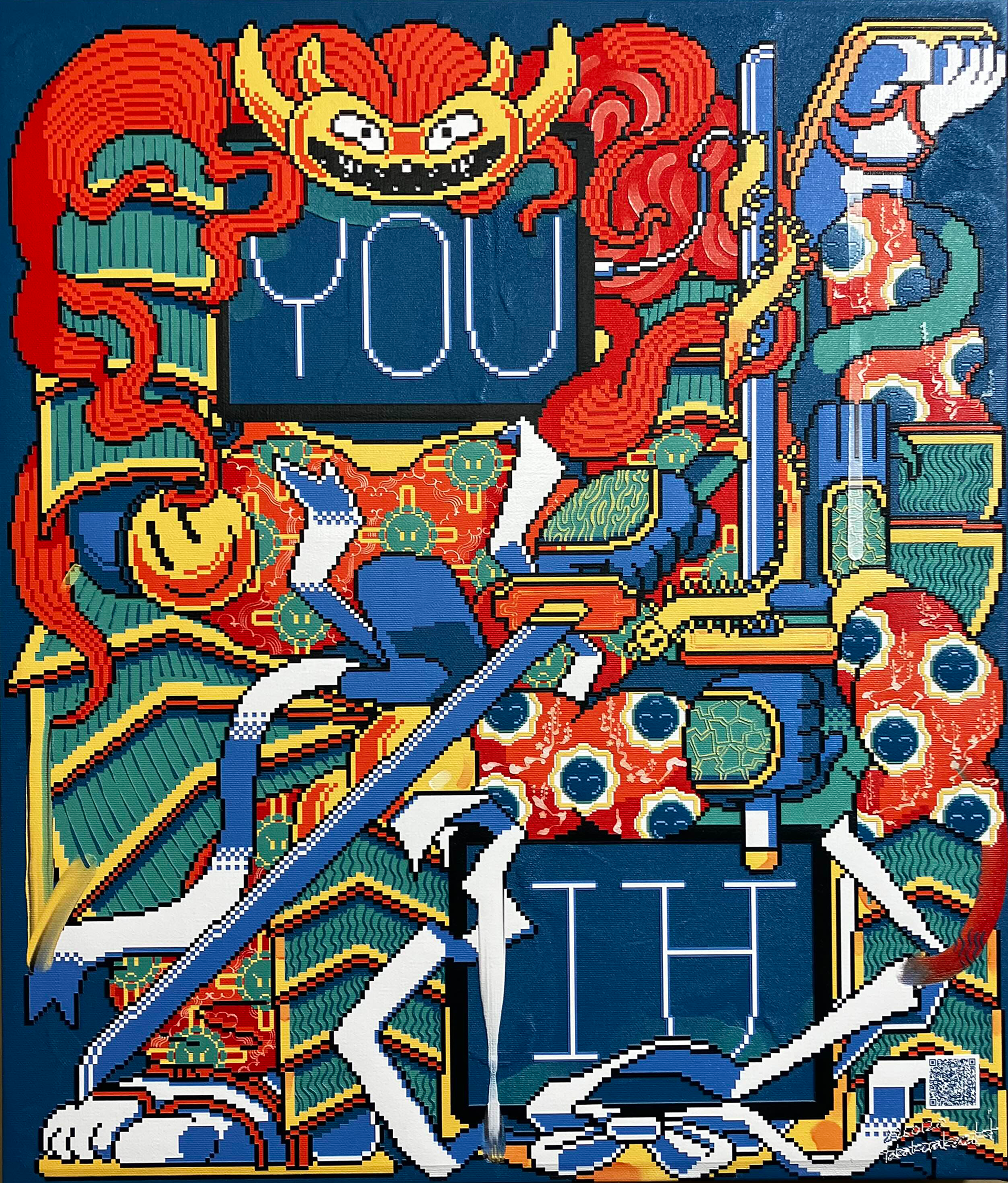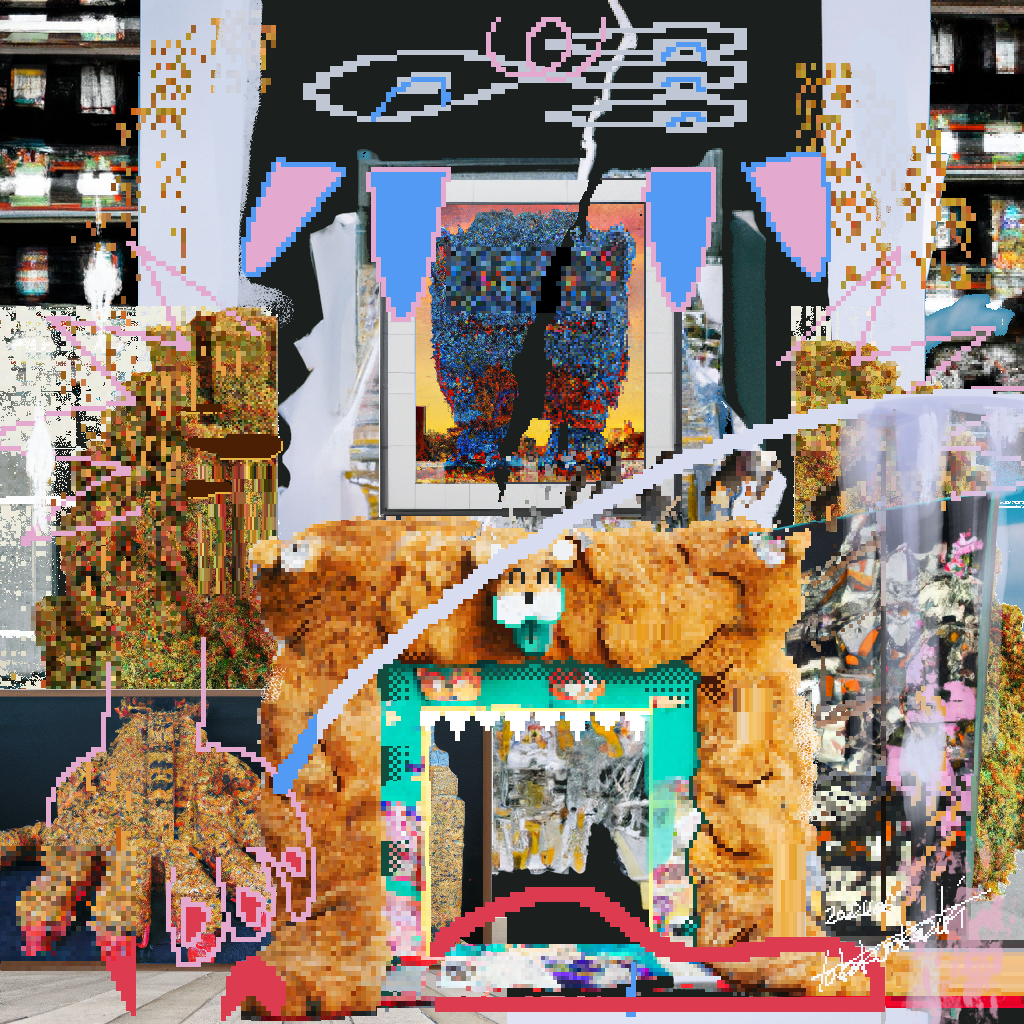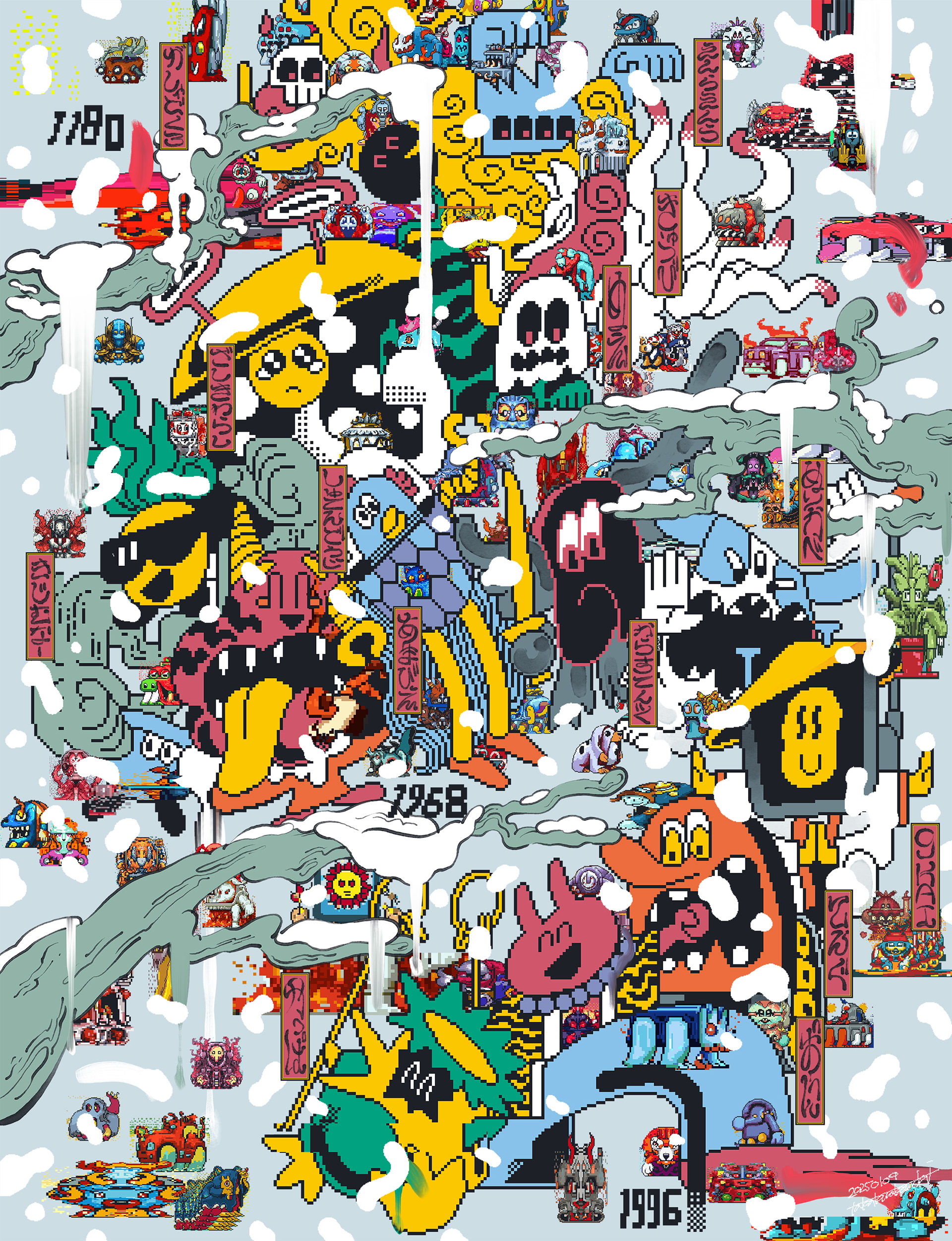NEW YOKAI PAINTING is a canvas series created by Takakurakazuki in which he writes poems that evoke yōkai as prompts, feeds these texts repeatedly into an AI, and then adds pixel-based drawings to the generated images. The series is positioned as a development of AI Yokai Summoning Ritual, with Takakurakazuki’s act of writing poetry placed at the center of the production process. During the process, the AI often translates yōkai as ghost, monster, or phantom, failing to fully capture its specific nuances. This gap in translation and generation became a central theme of the series, treating the ambiguity and untranslatability inherent in the concept of yōkai as an integral part of